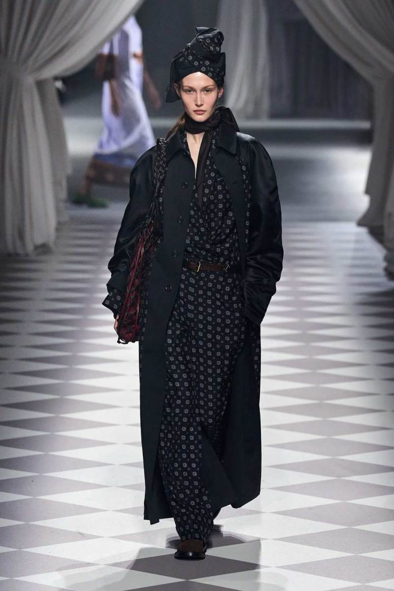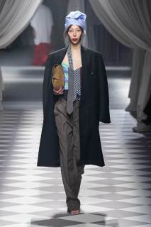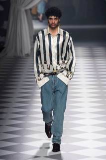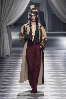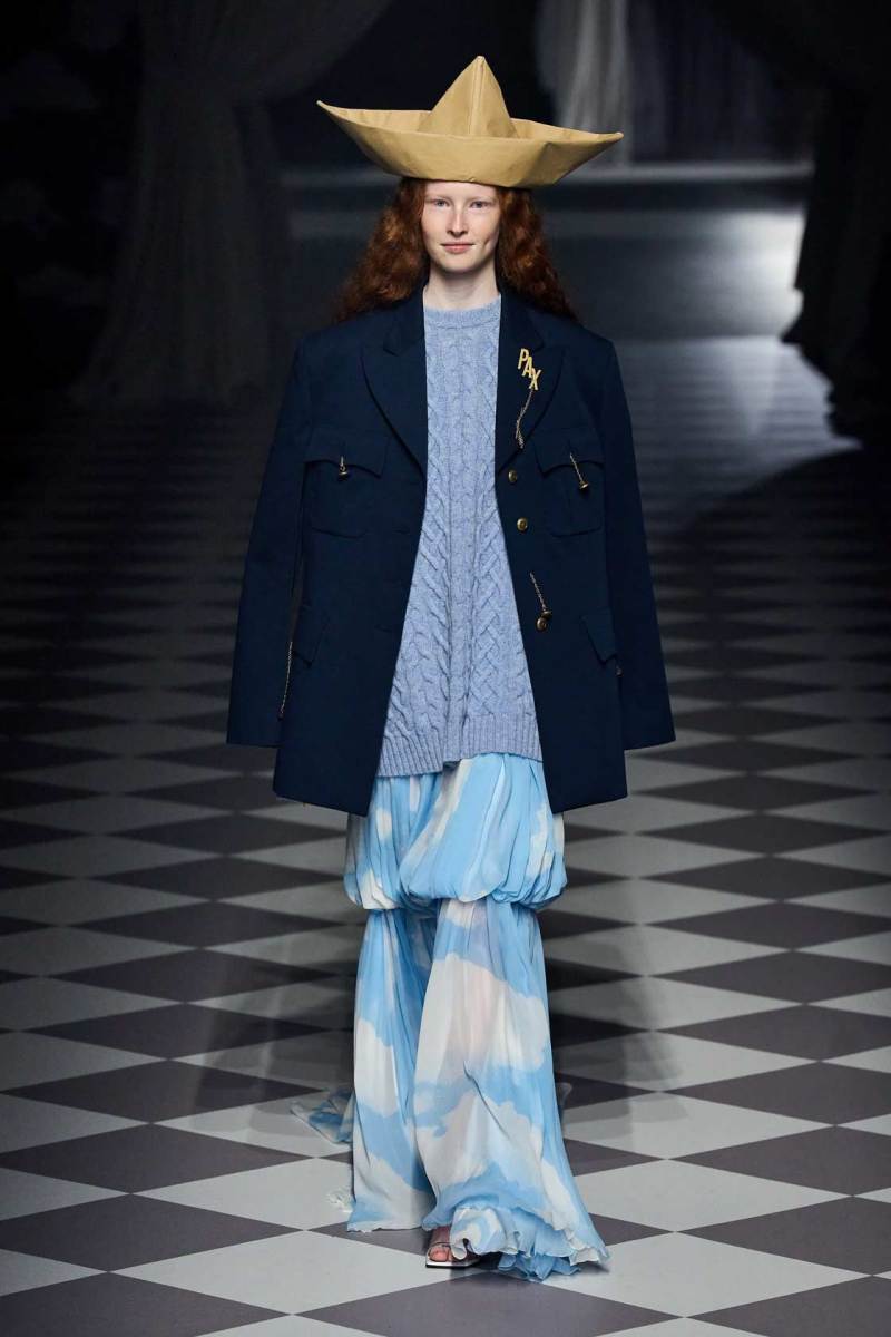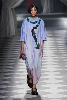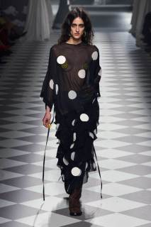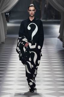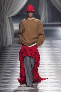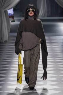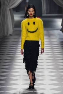 Appiolaza l’ha definita una Collezione Zero, di cui l’intento basilare è quello di trasportare la teatralità di Franco Moschino nella realtà di oggi. Metaforiche quindi le tende bianche a sipario che hanno arredato il set della sfilata, insieme al pavimento a scacchiera e la carta da parati di un cielo nuvoloso. Il tutto nei toni del grigio a far da sfondo a una palette classica per il linguaggio Moschino, il beige dei trench e dei cappellini a forma di barchetta di carta, il denim chiaro, il rosso delle gonne flamenco e delle borse a cuore, che qui si sovrappongono a dei grigi pantaloni sartoriali, il bianco e nero di macro pois e il giallo caldo di maglioni e borse con gli smile.