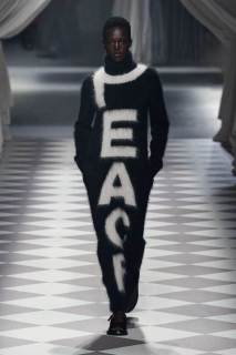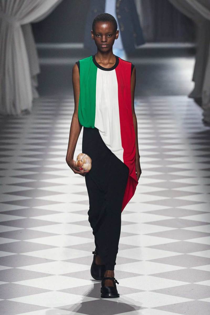 Love, Smile, Peace, nuvole e bandiere italiane, parole e immagini chiave che avranno travolto il nuovo stilista e che non ha potuto fare a meno di tradurre in questo nuovo lessico che sarà il suo, ma comunque, a prima vista, sembra sempre circoscritto tra ironia, messaggi di pace e simbolismi italici, come Franco voleva.
