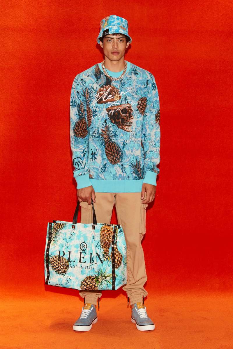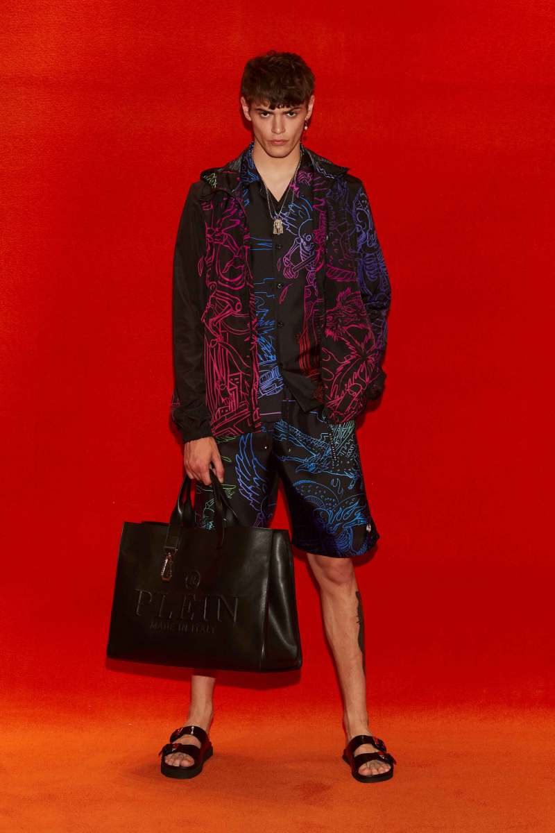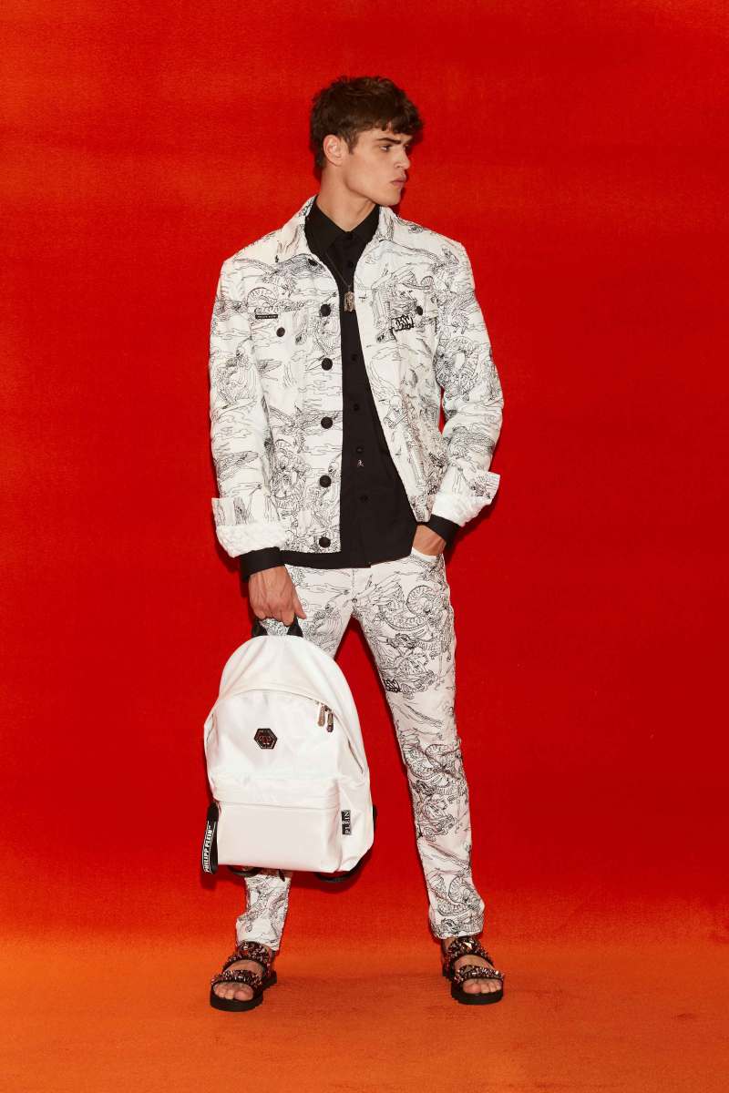 La collezione vede sfilare mondi diversi e utilizza temi cromatici legati a stampe e opere d’arte: Burning Palms, Graffiti Monogram, Tattoo Inspired Graphics e Ananas Skye sono lo specchio dei trend caratterizzanti la prossima stagione. Philipp Plein sceglie di intraprendere un viaggio tra bene e male, storia e leggenda, e lo fa coinvolgendo nei capi d’abbigliamento gli scheletri prima, e animali come l’aquila e il serpente poi.
