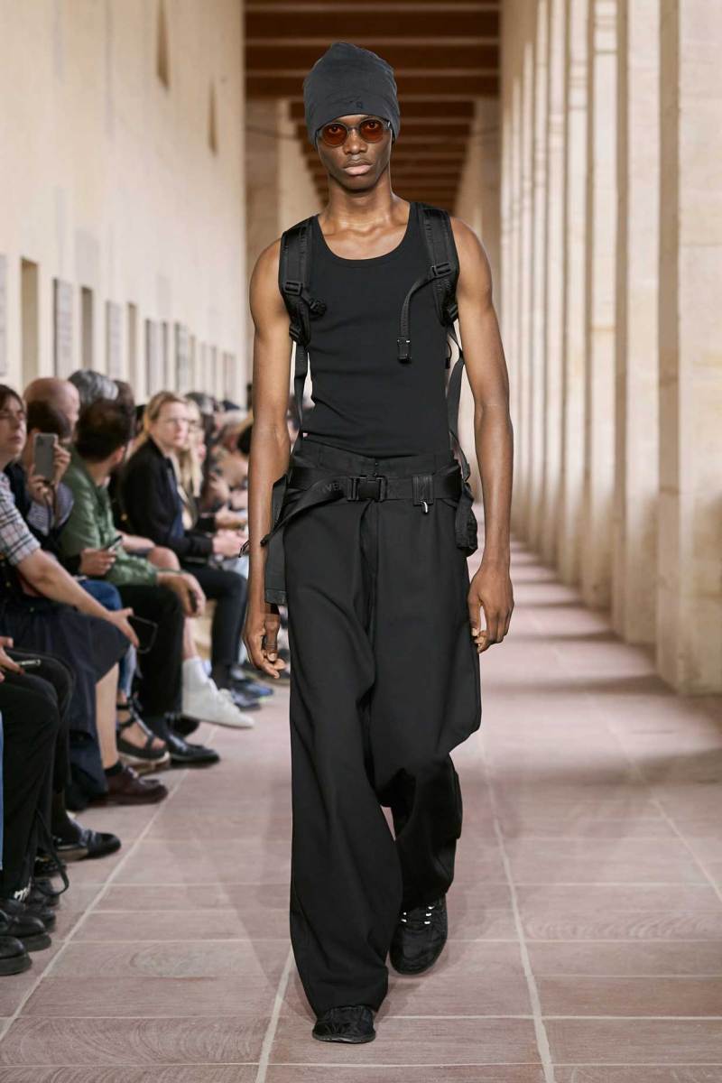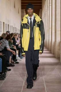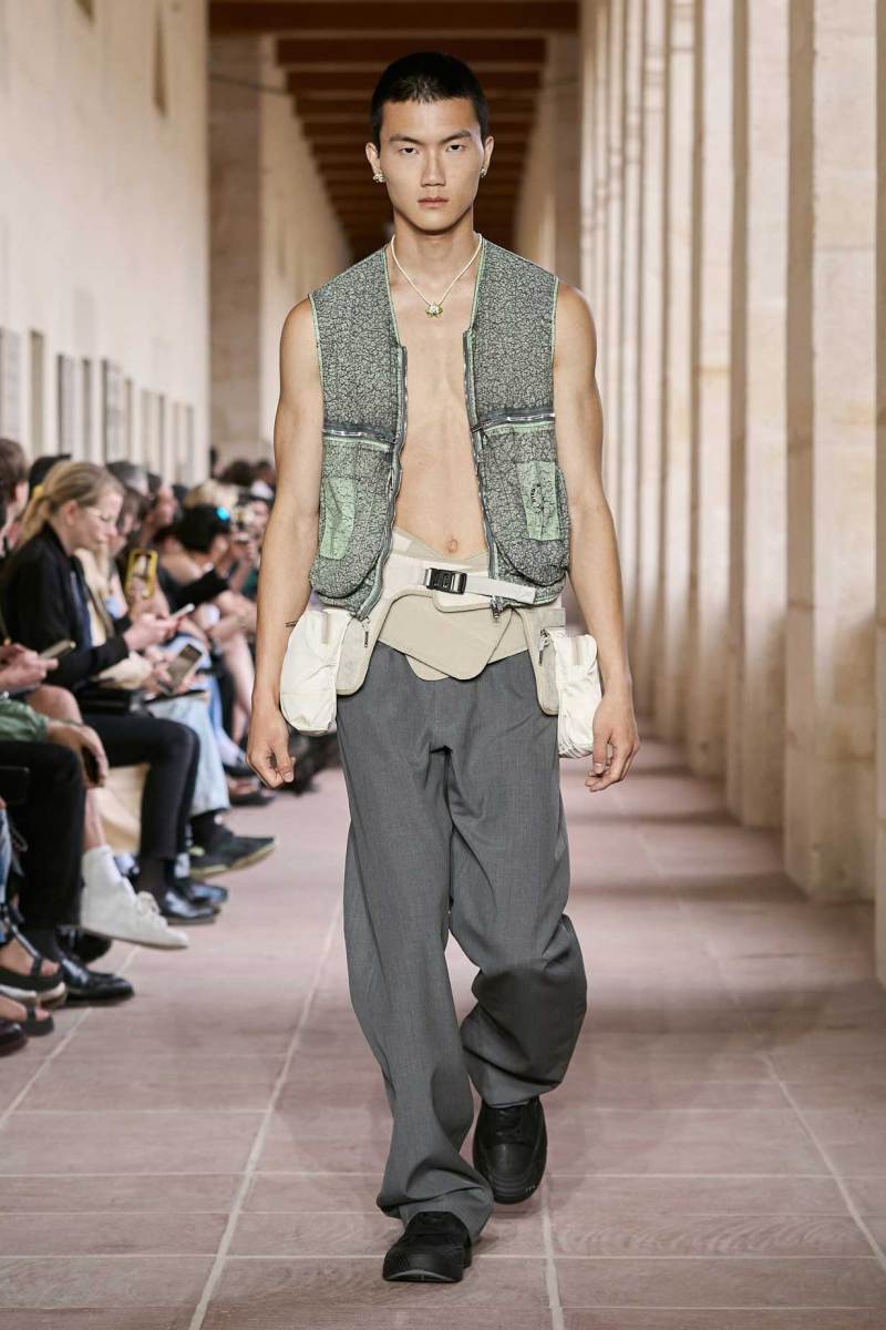 Capispalla termonastrati a contrasto, pettorine con mini bag, zaini, gilet e belt back bag, ovvero dei marsupi che si indossano al contrario, riconducono all’abbigliamento equipaggiato tipico di Williams. A proposito di accessori e metallerie, a confermare il mood anni ‘90 della collezione sono i dettagli di alcune maglie che si sono viste intorno alla metà dello show. Di svariate misure e poste sul fronte di maxi t-shirt, delle borchie a occhiello che hanno caratterizzato accessori di quegli anni e che calzolai – e non solo – possiedono tra i loro accessori.
