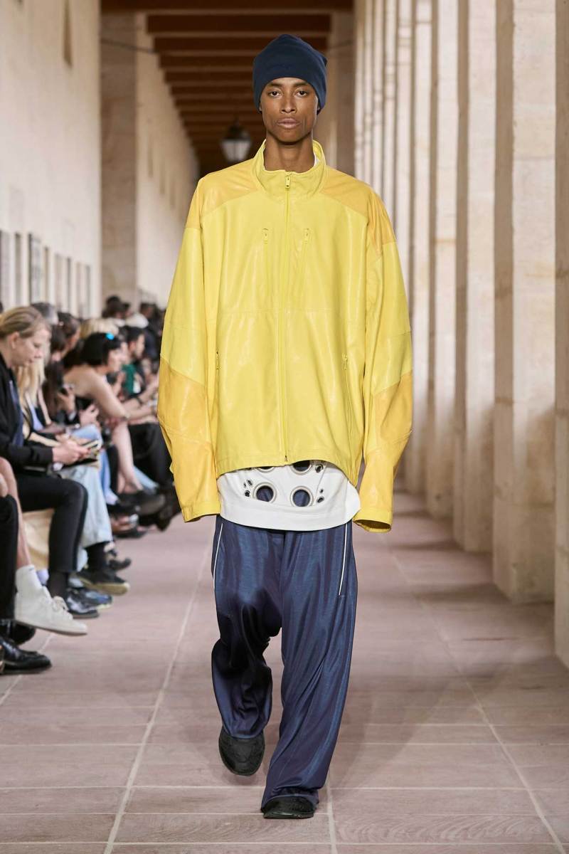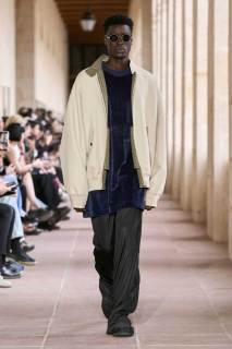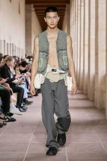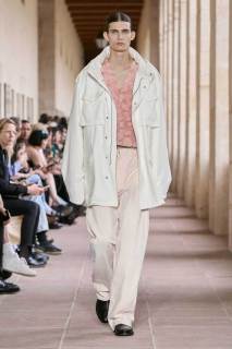 Il sartoriale è decisamente pulito, boxy e over, mentre succinti sono i tank top, che sembrano trasportare questo businessman nelle sue occasioni di sport e tempo libero, dove l’abbigliamento torna più accessoriato. Anche la palette lascia spazio al colore, restano tenui dei gialli e dei beige, verde militare e vinaccia, unica nuance più accesa un rosa salmone su speciali capi di maglieria, come una felpa con zip che si potrebbe definire petalosa, se l’Accademia della Crusca consente.