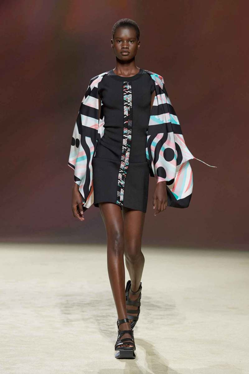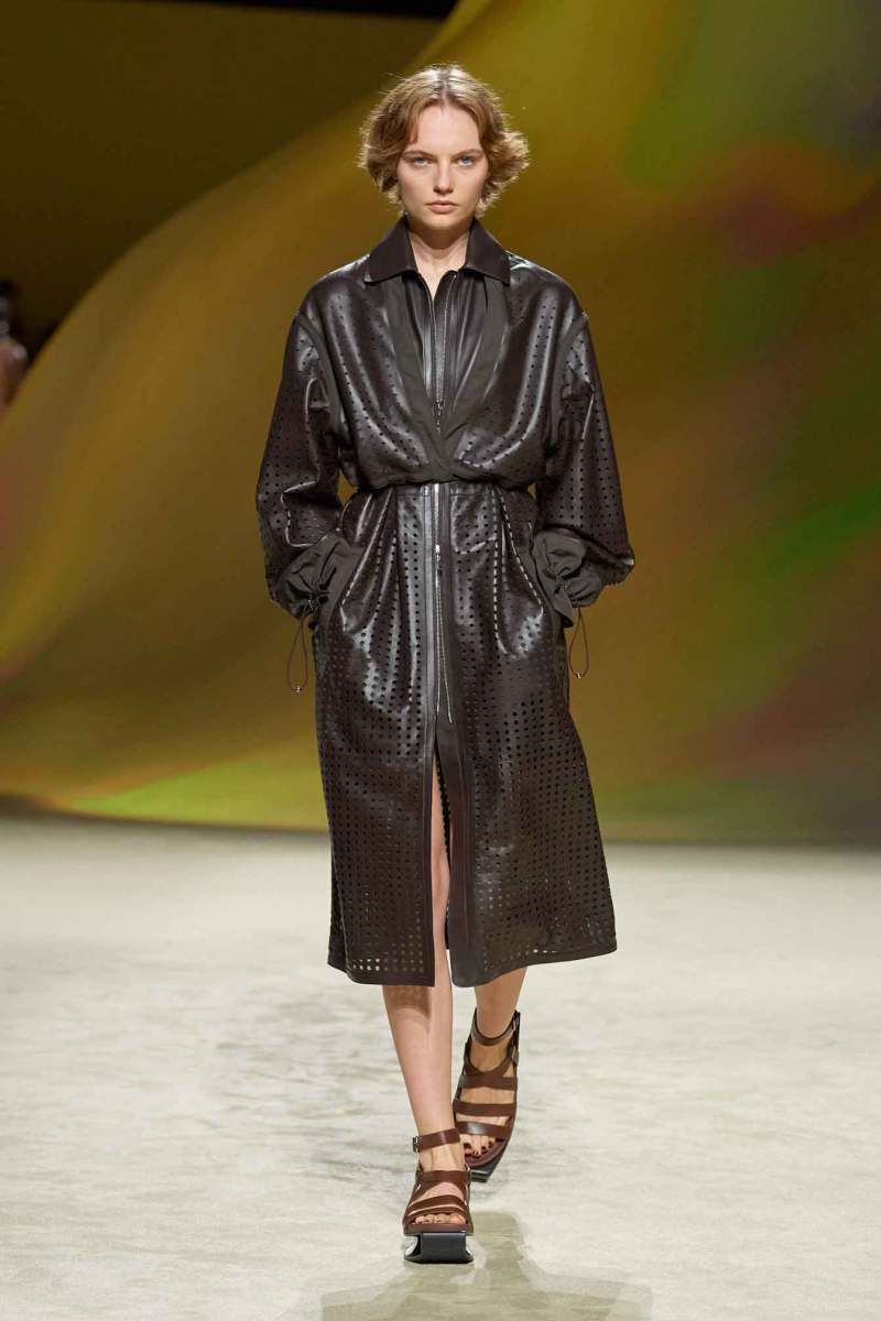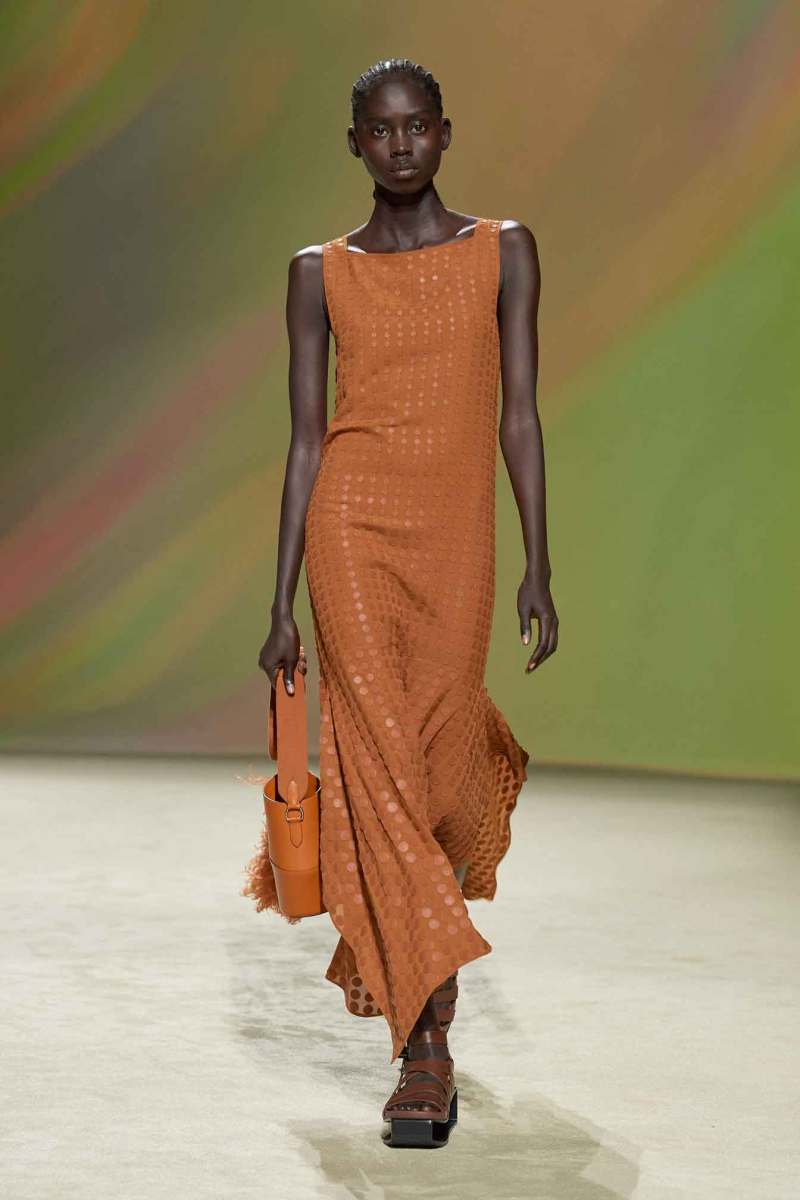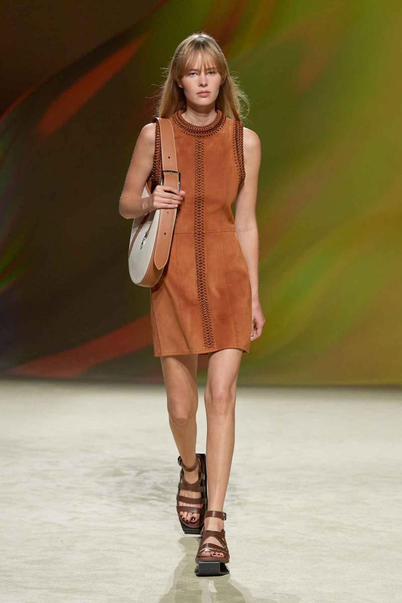 La PE 2023 firmata Hermès, al limite tra lo sportivo e l’elegante, conferisce un’atmosfera di semplicità. Mentre i miniabiti in pelle scamosciata, beige e marrone hanno orli di pelle intrecciata. Le borse diventano veri e propri oggetti di design, rese tali dal colore e dai dettagli, come le piume, da portare a spalla o a mano e da indossare tono su tono.