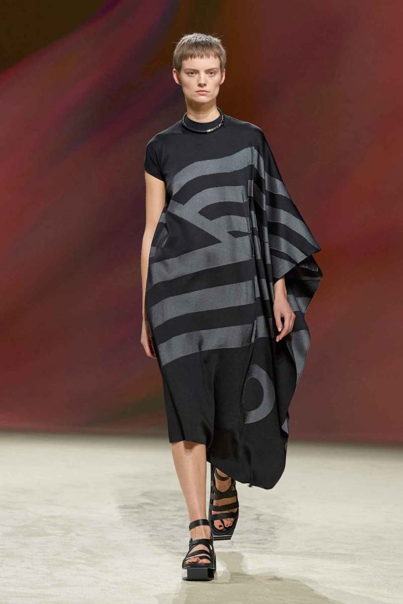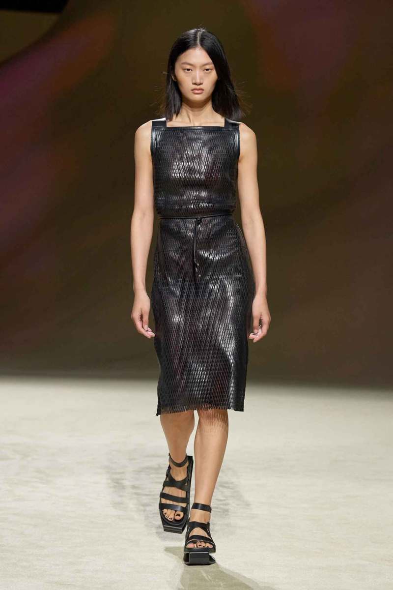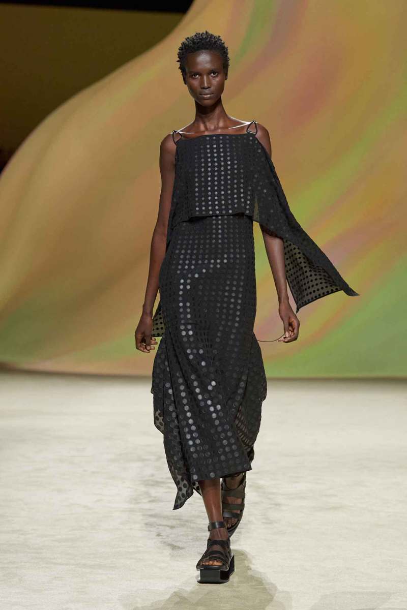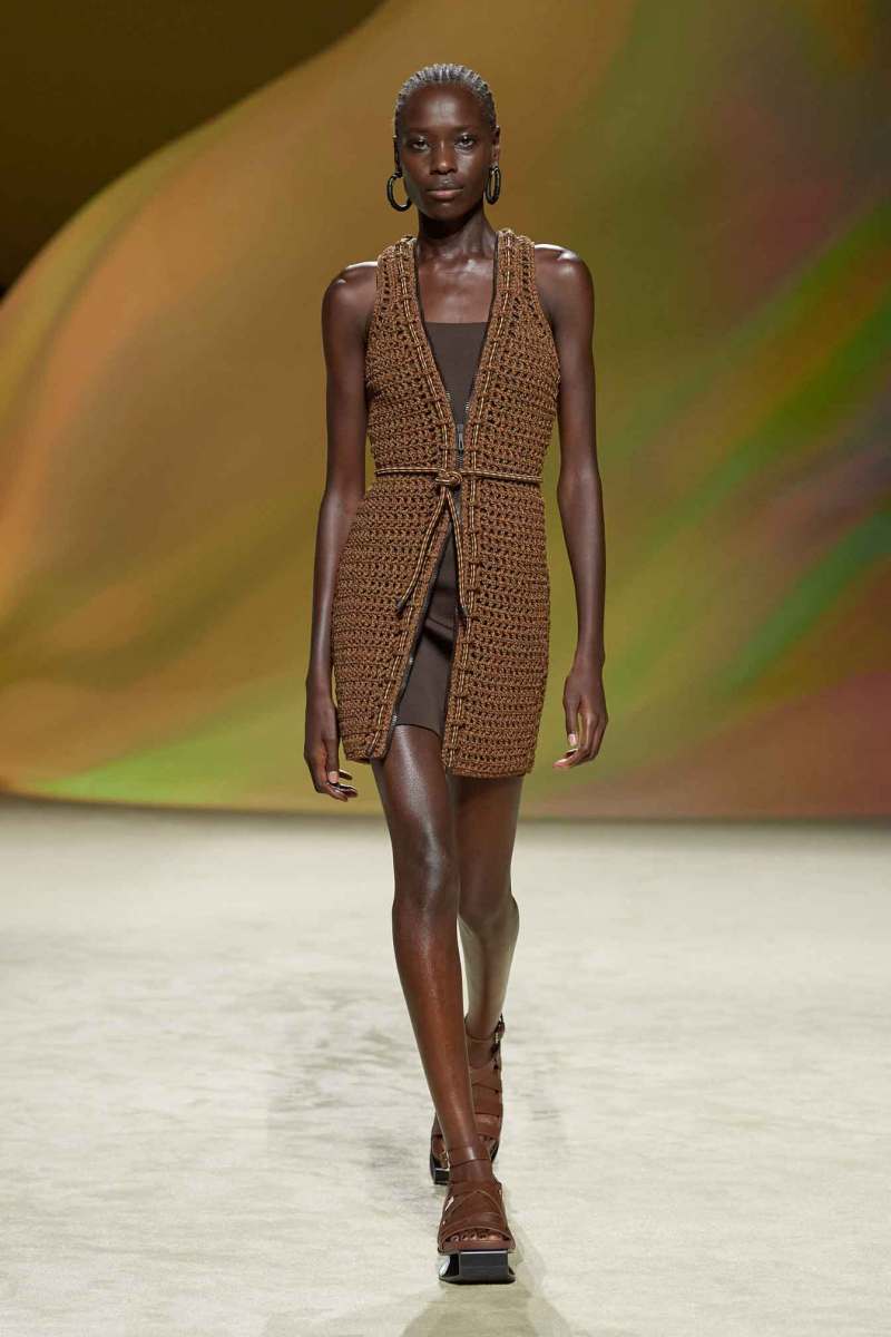 La PE 2023 firmata Hermès, al limite tra lo sportivo e l’elegante, conferisce un’atmosfera di semplicità. Mentre i miniabiti in pelle scamosciata, beige e marrone hanno orli di pelle intrecciata. Le borse diventano veri e propri oggetti di design, rese tali dal colore e dai dettagli, come le piume, da portare a spalla o a mano e da indossare tono su tono.