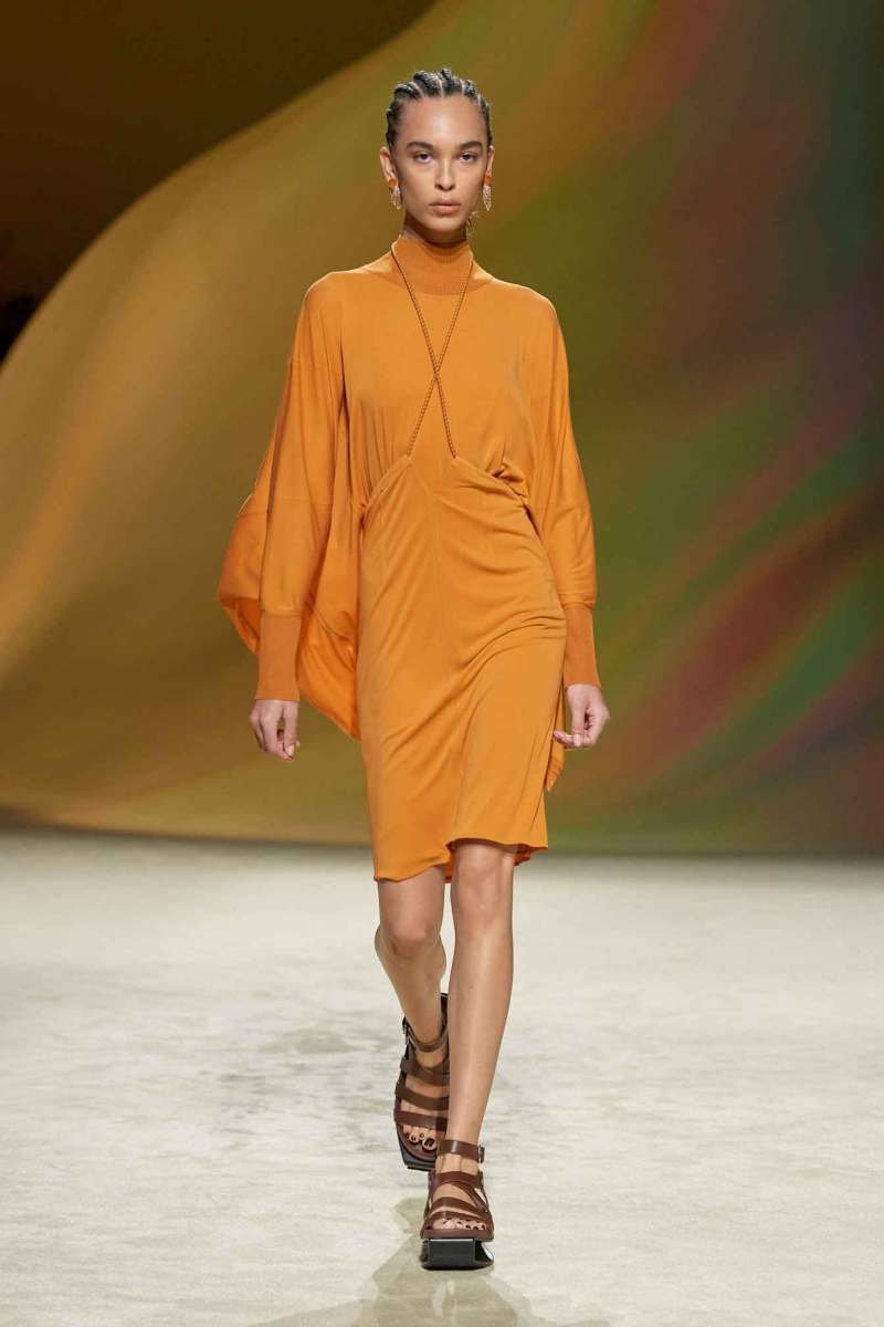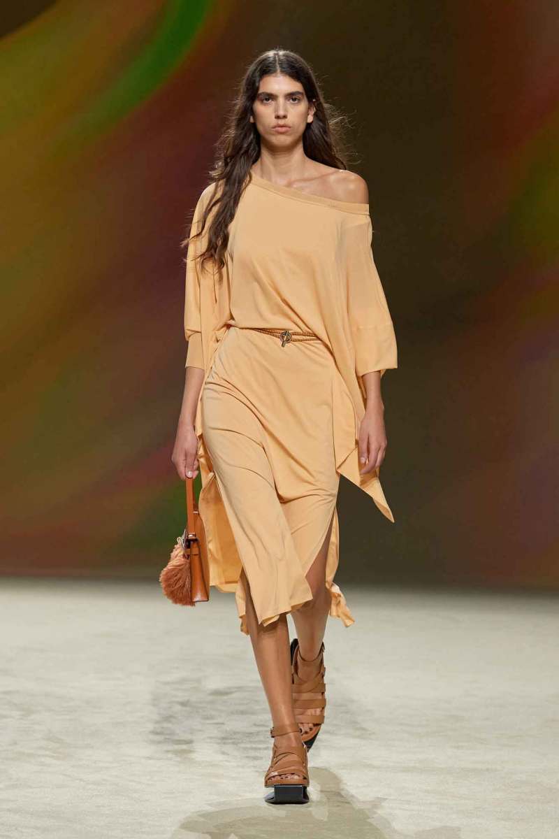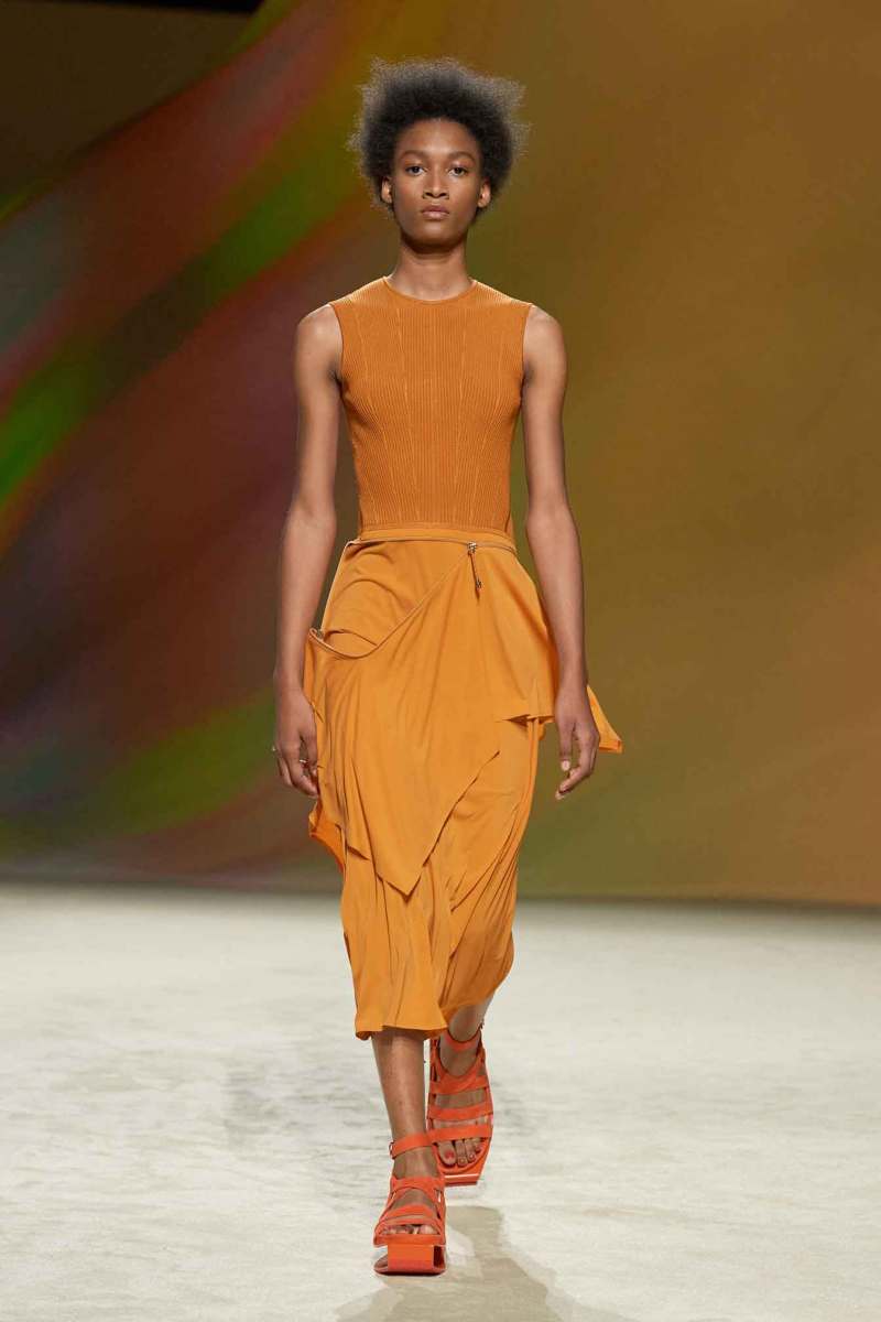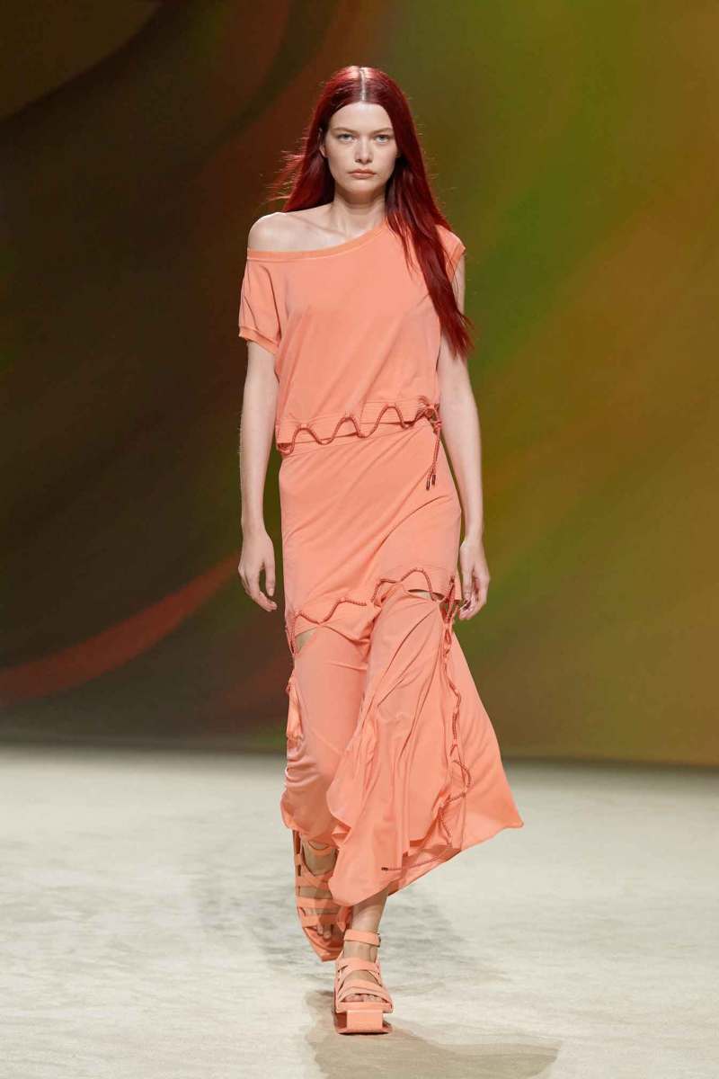 La collezione accompagna suggestioni a suoni psichedelici e non manca il focus sull’arancione, colore identificativo della Maison, che viene riproposto su abiti drappeggiati, canottiere e gonne con rouches. Mentre il rosa, il corallo e il rosso sono spesso mescolati insieme, come se fossero cuciti nel deserto.
