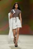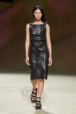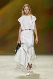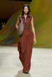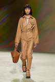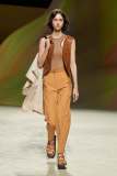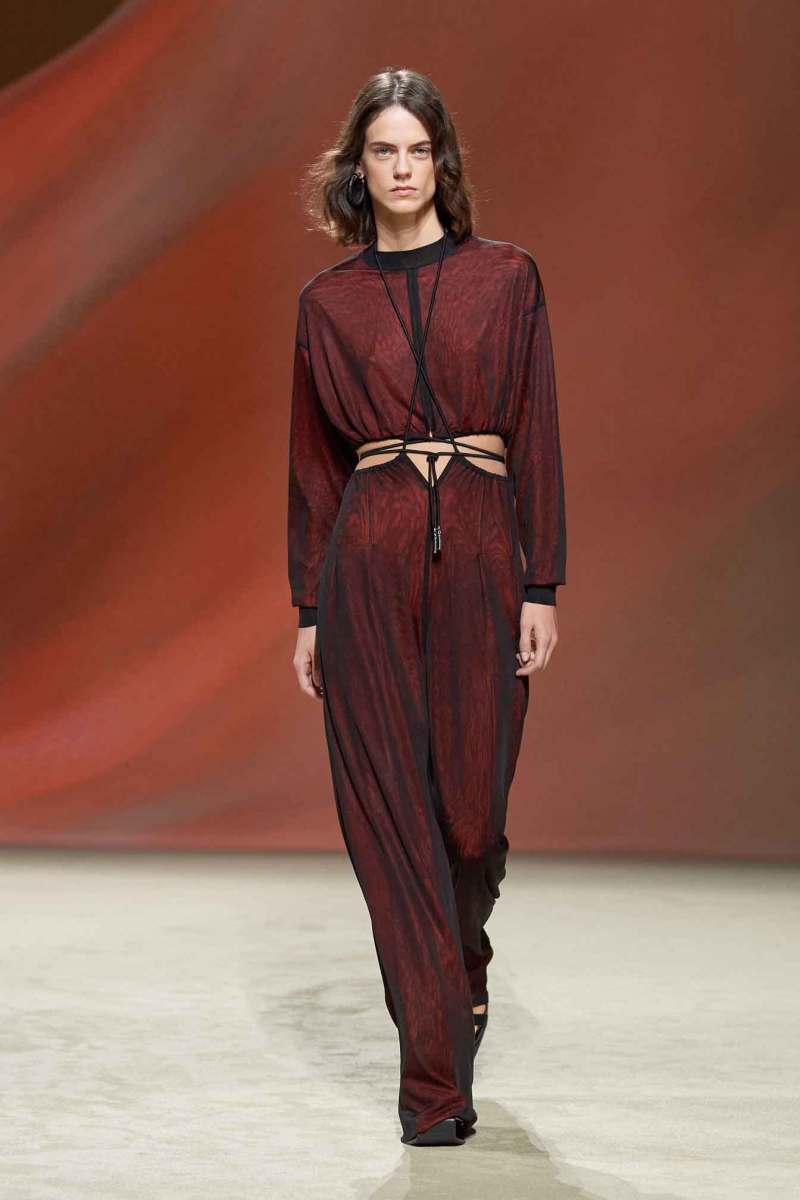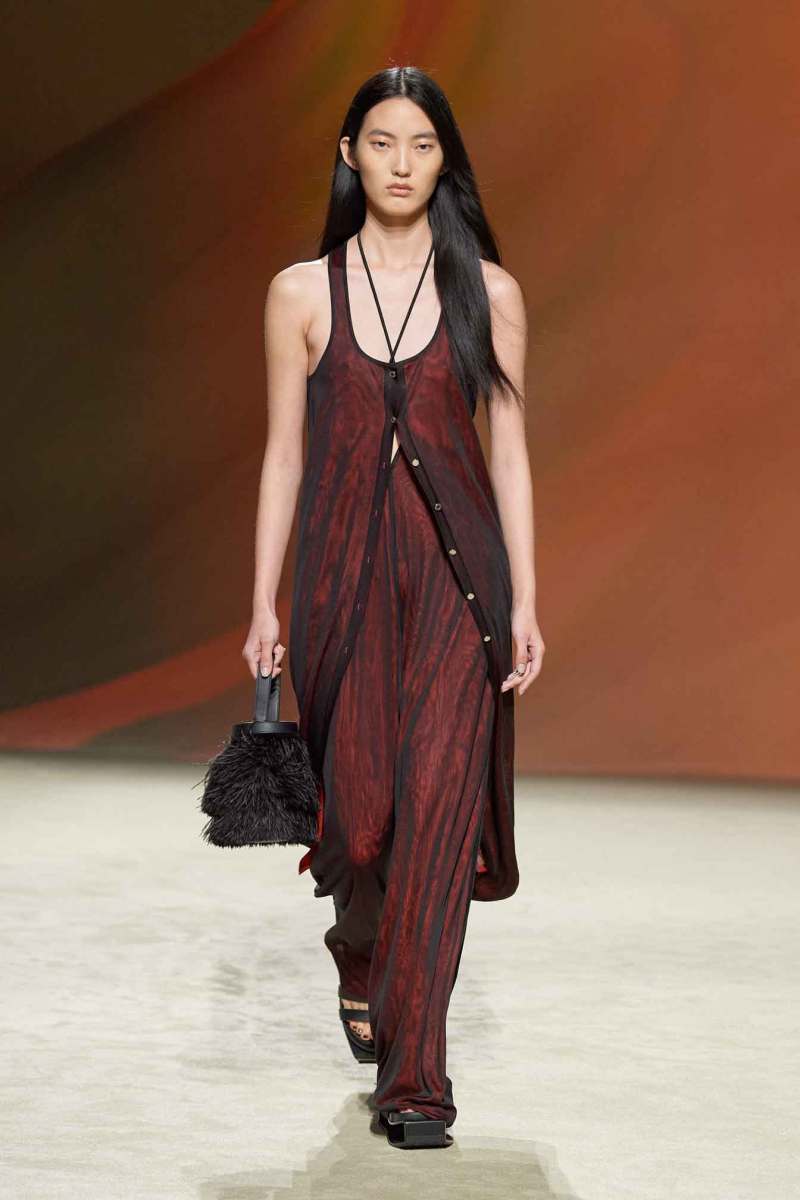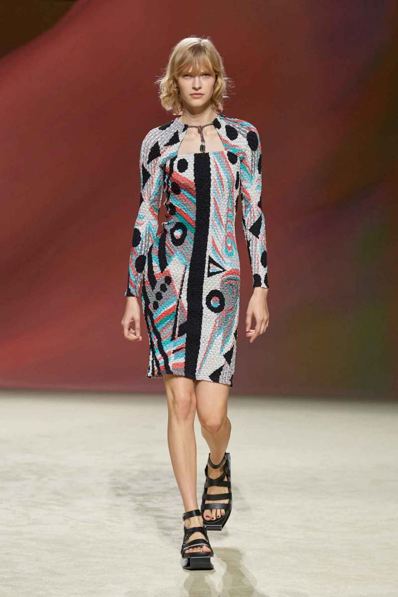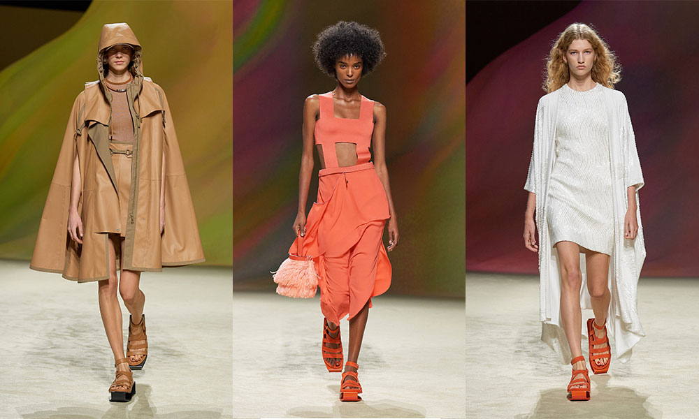La collezione accompagna suggestioni a suoni psichedelici e non manca il focus sull’arancione, colore identificativo della Maison, che viene riproposto su abiti drappeggiati, canottiere e gonne con rouches. Mentre il rosa, il corallo e il rosso sono spesso mescolati insieme, come se fossero cuciti nel deserto.