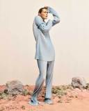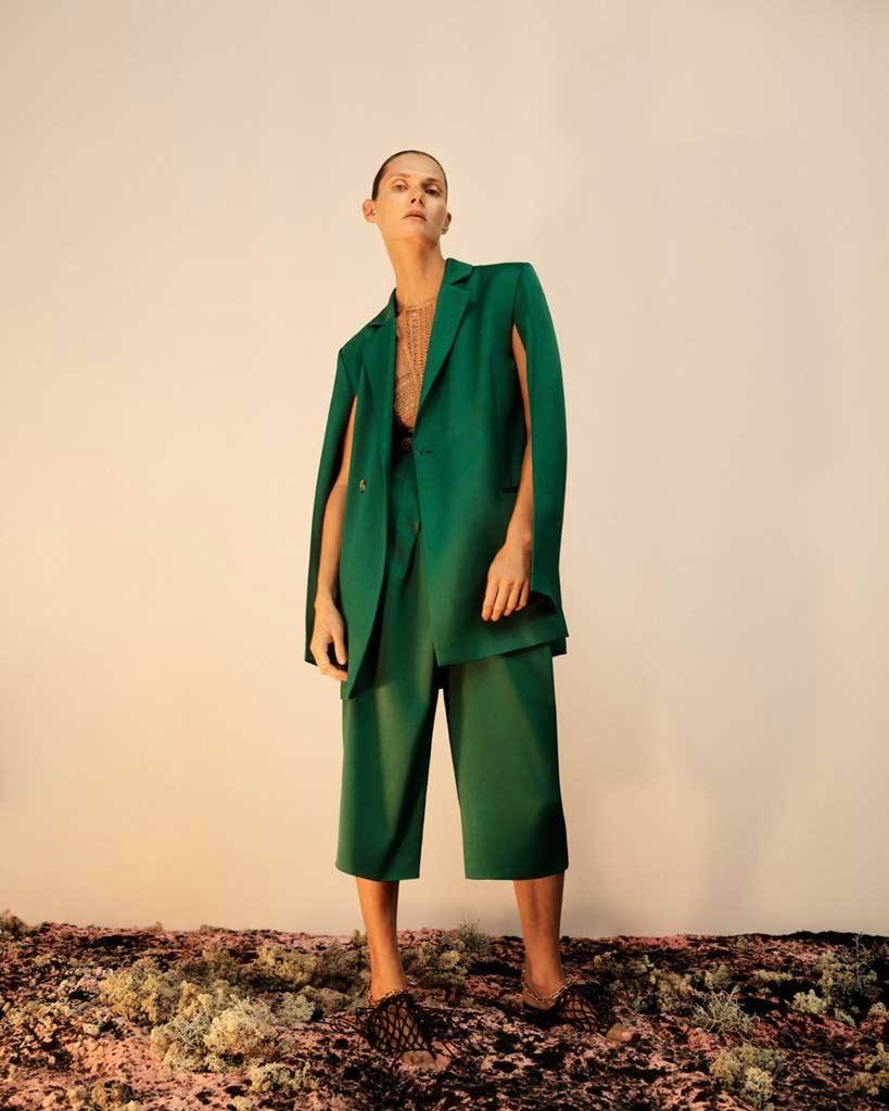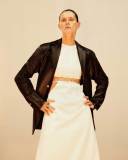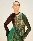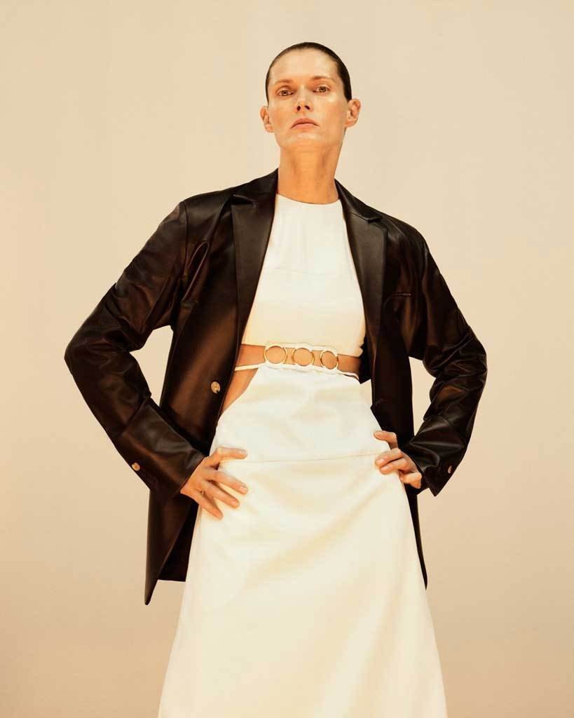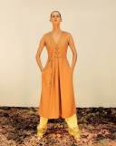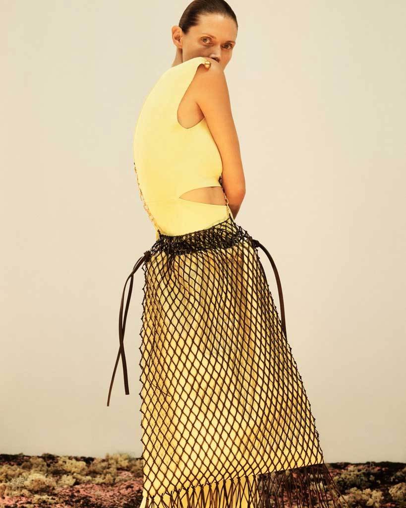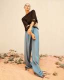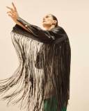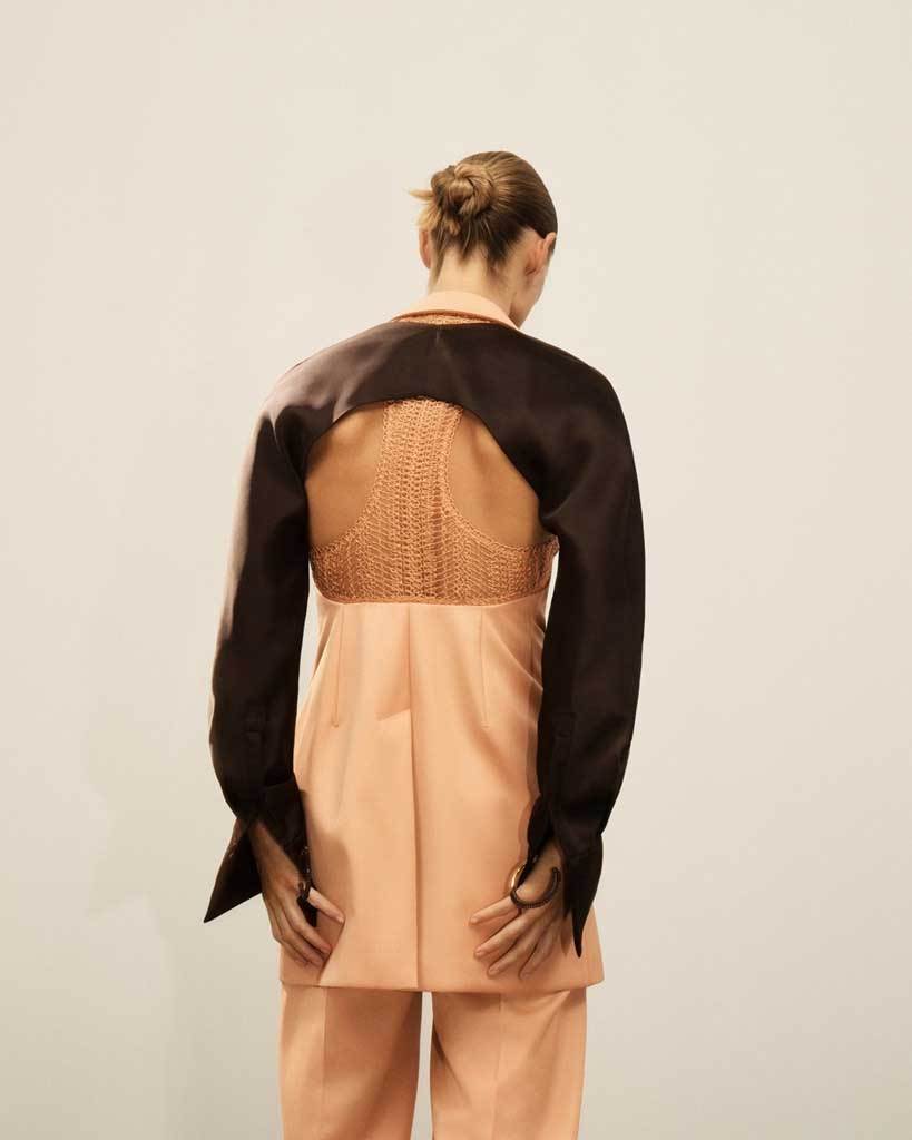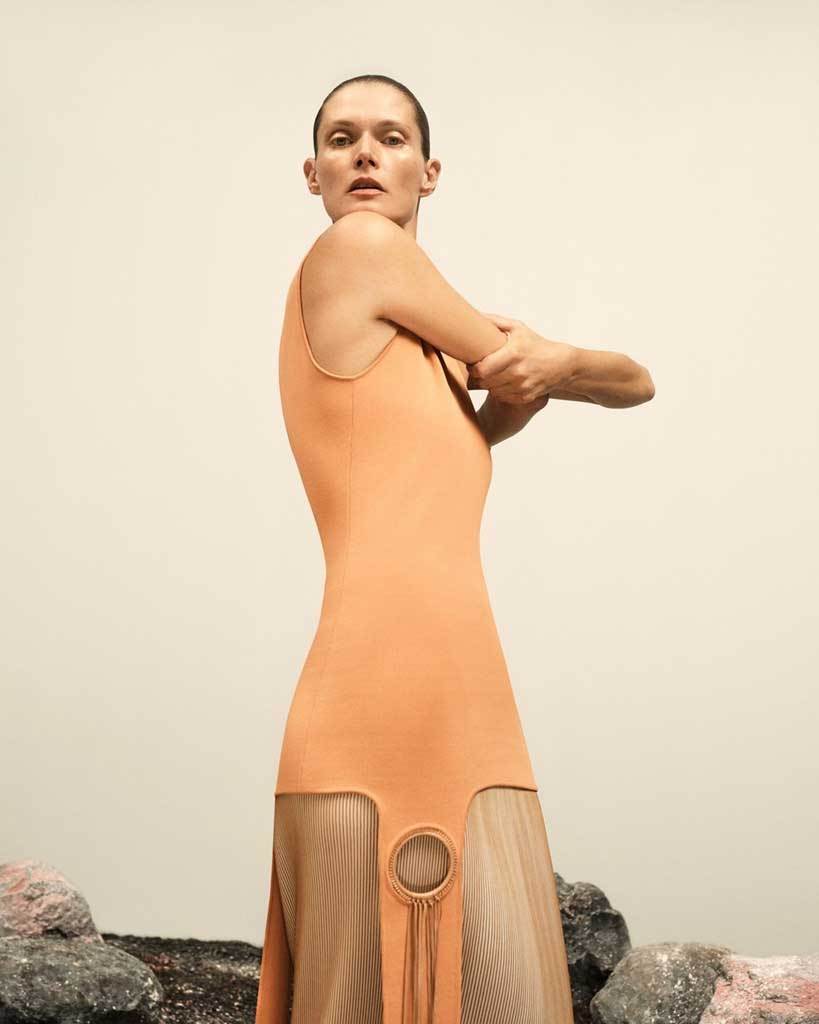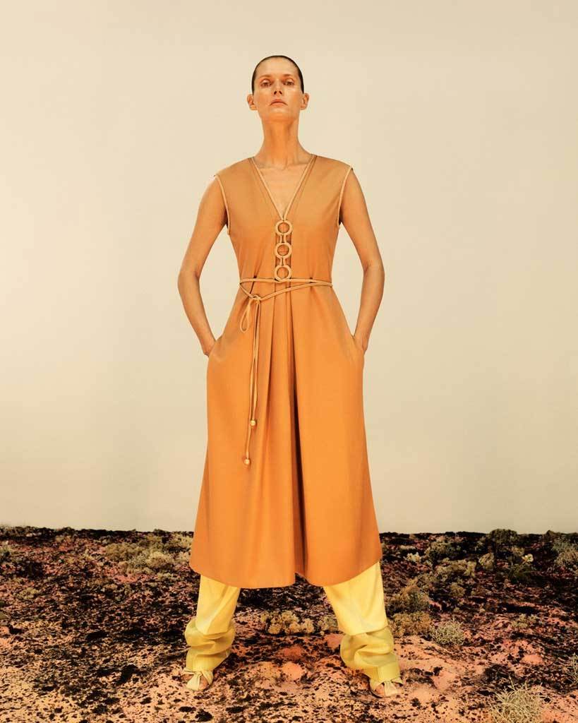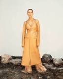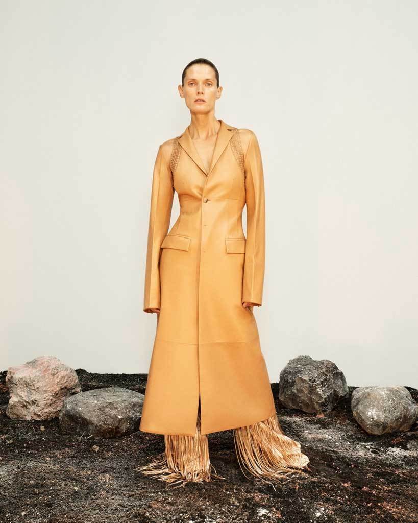 Elementi metallici e inserti di pelle sono alla base dei blazer e dei cappotti. Tra essi spicca il cappotto di pelle color cammello con tagli geometrici delineati da delicati ricami. Gli abiti, i pantaloni e i top lunghi, realizzati con tessuti plissettati, conferiscono movimento alla collezione, amplificato dall’aggiunta di elementi come frange extra-lunghe alle maniche e ai trench che creano giochi di onde e invitano gli spettatori a muoversi al loro ritmo. Gabriele Colangelo per questa collezione ha scelto nuances tenui, toni nude che richiamano i colori della terra.