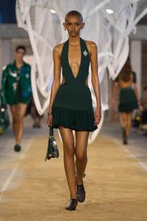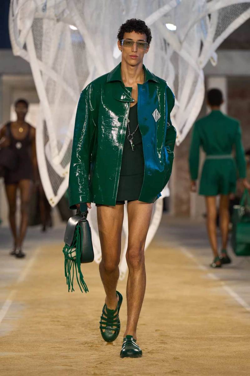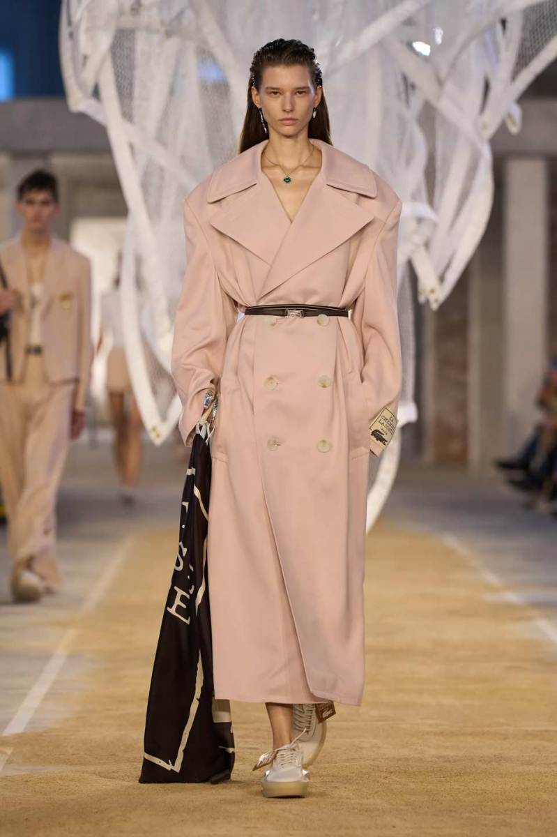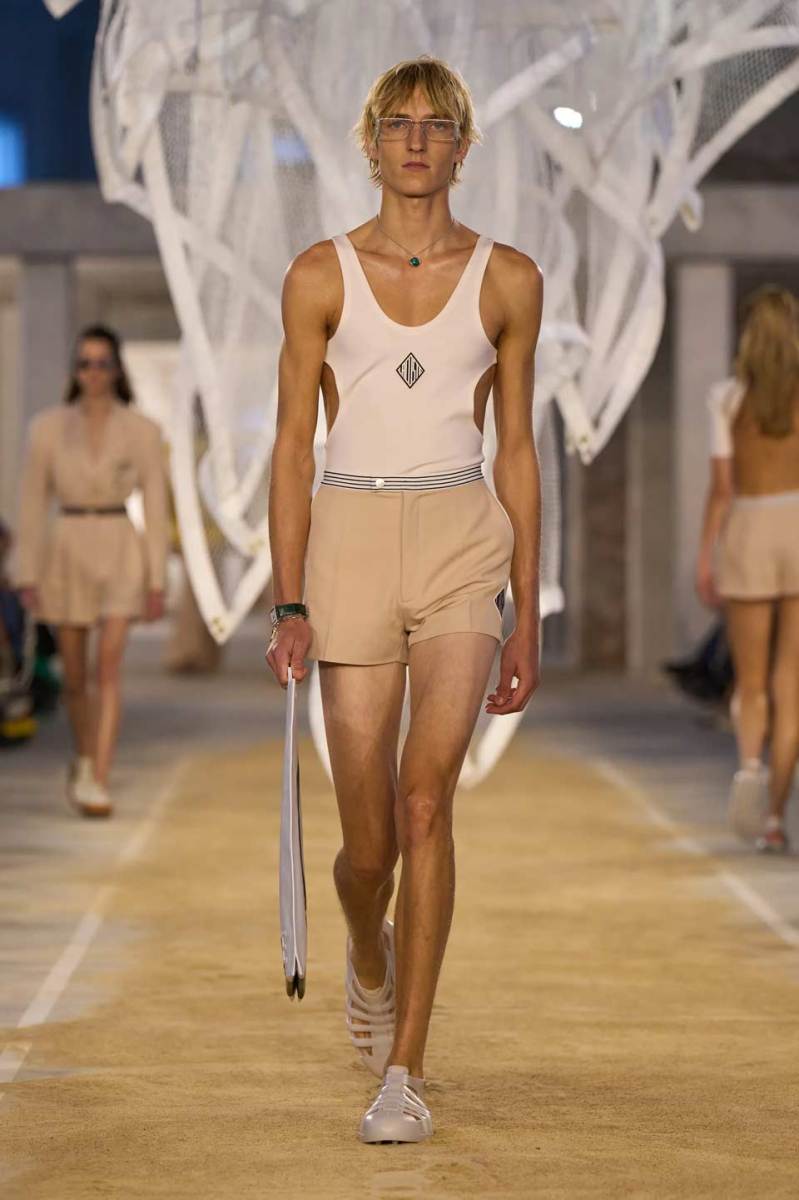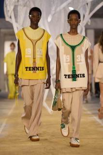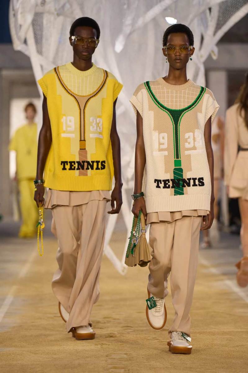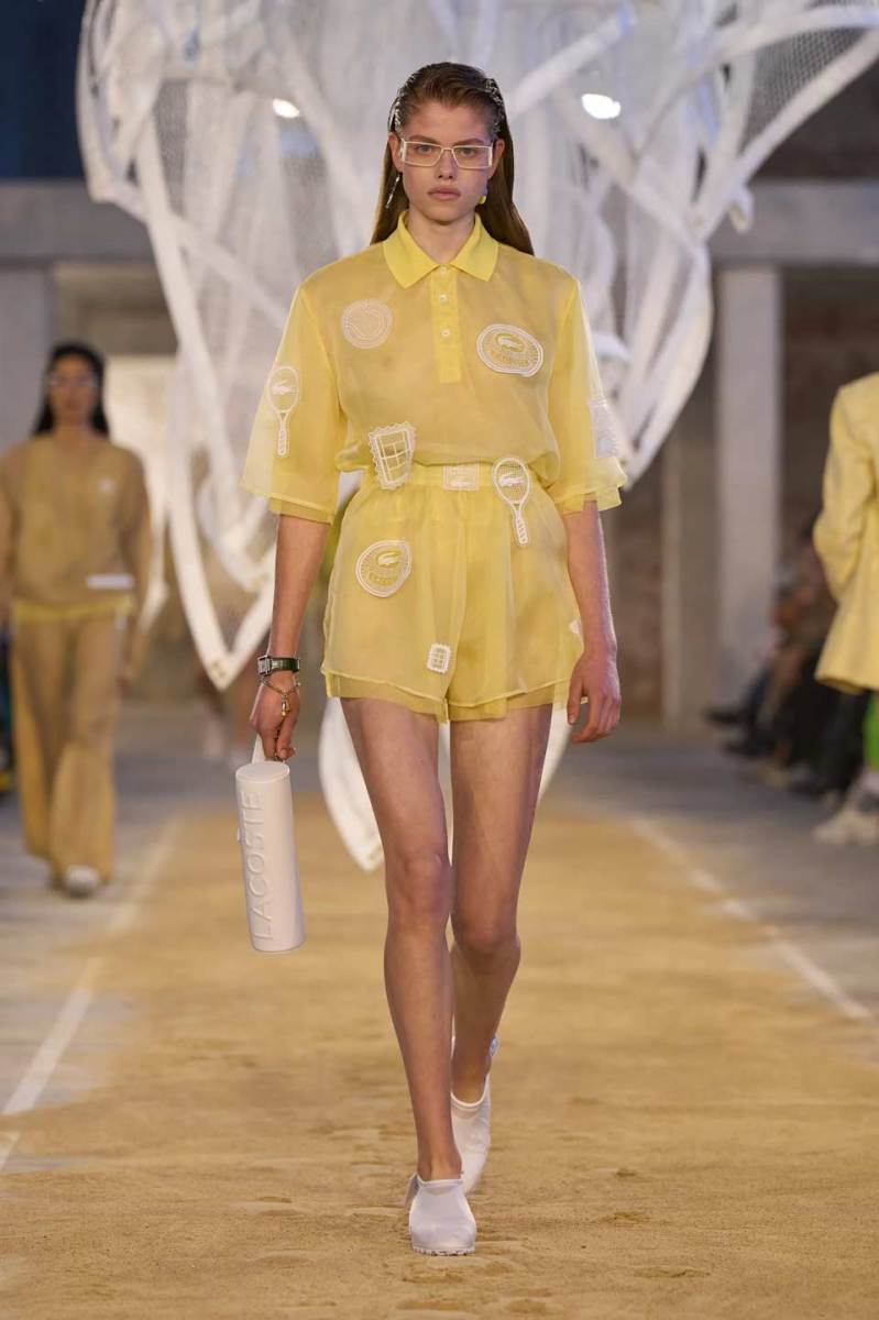 Vengono presentati abiti sui toni di una palette pastello: lunghi trench colorati, completi oversize, vestiti sportivi, lunghe canotte e stampe e accessori a tema tennis. Oltre agli elementi legati a uno sport tanto amato, troviamo le stampe dell’iconico simbolo su T-shirt oversize dalle maniche corte e coordinati basic e neutri, stile da sempre proposto dal brand francese. Ad adornare i look, sandali colorati in plastica e giocose sneakers in perfetto pendant con gli outfit presentati dalla stilista Pelagia Kolotouros.