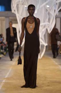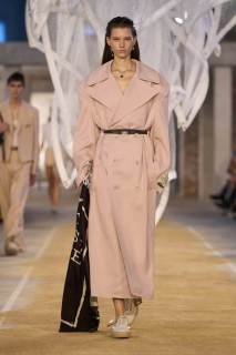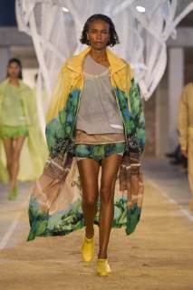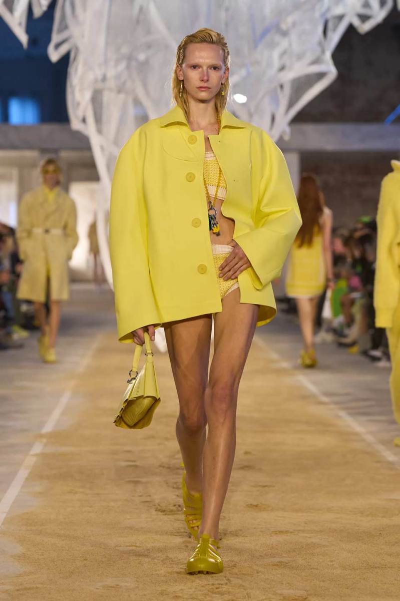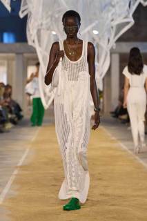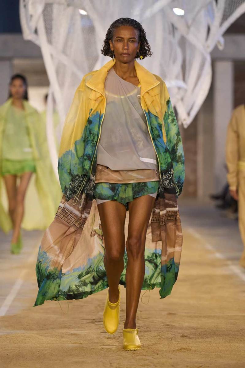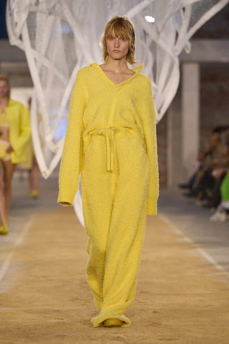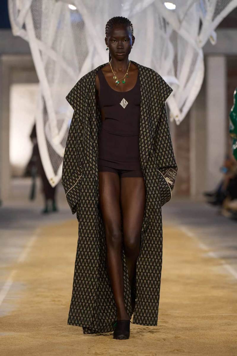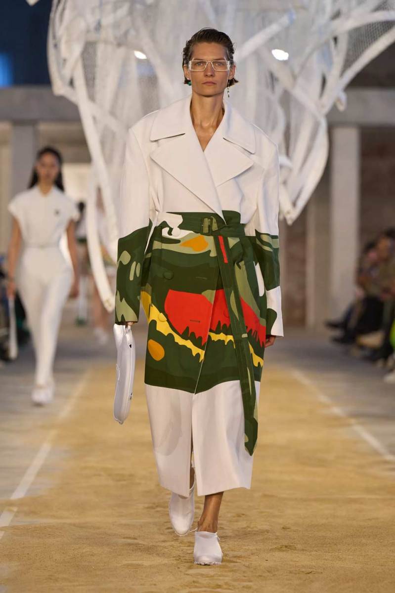Vengono presentati abiti sui toni di una palette pastello: lunghi trench colorati, completi oversize, vestiti sportivi, lunghe canotte e stampe e accessori a tema tennis. Oltre agli elementi legati a uno sport tanto amato, troviamo le stampe dell’iconico simbolo su T-shirt oversize dalle maniche corte e coordinati basic e neutri, stile da sempre proposto dal brand francese. Ad adornare i look, sandali colorati in plastica e giocose sneakers in perfetto pendant con gli outfit presentati dalla stilista Pelagia Kolotouros.