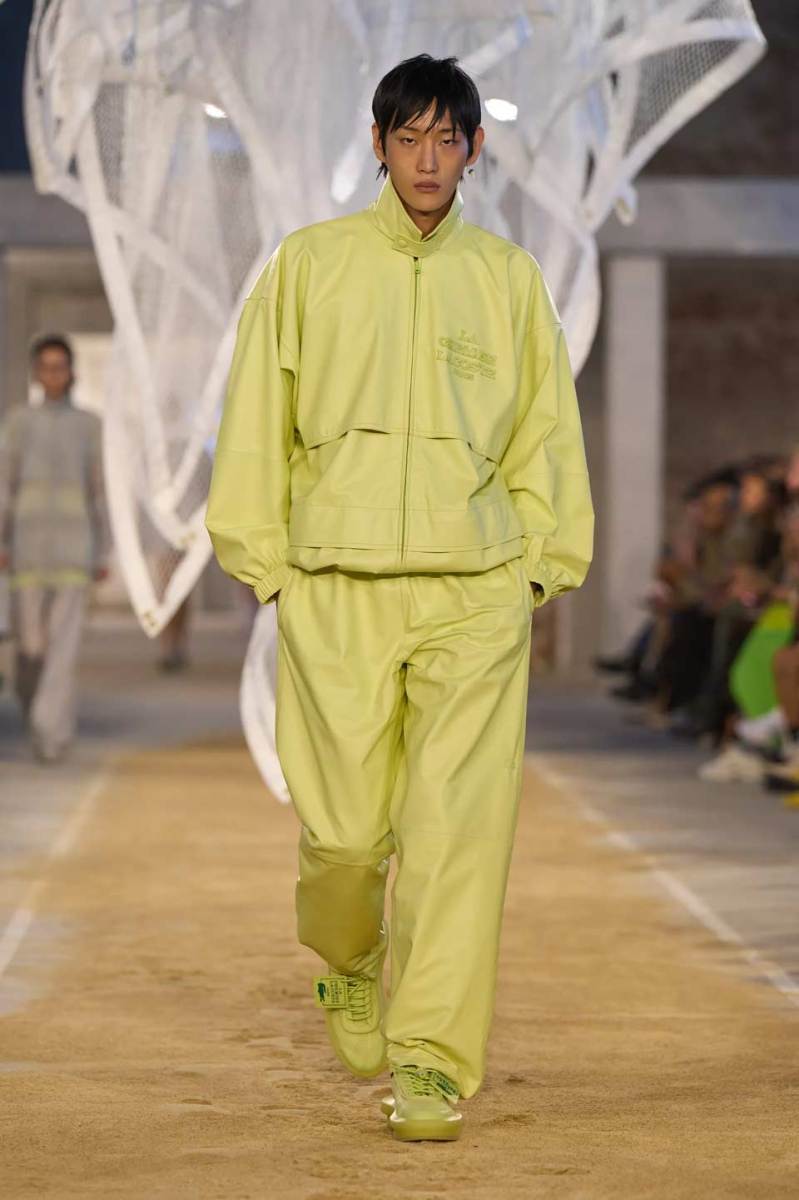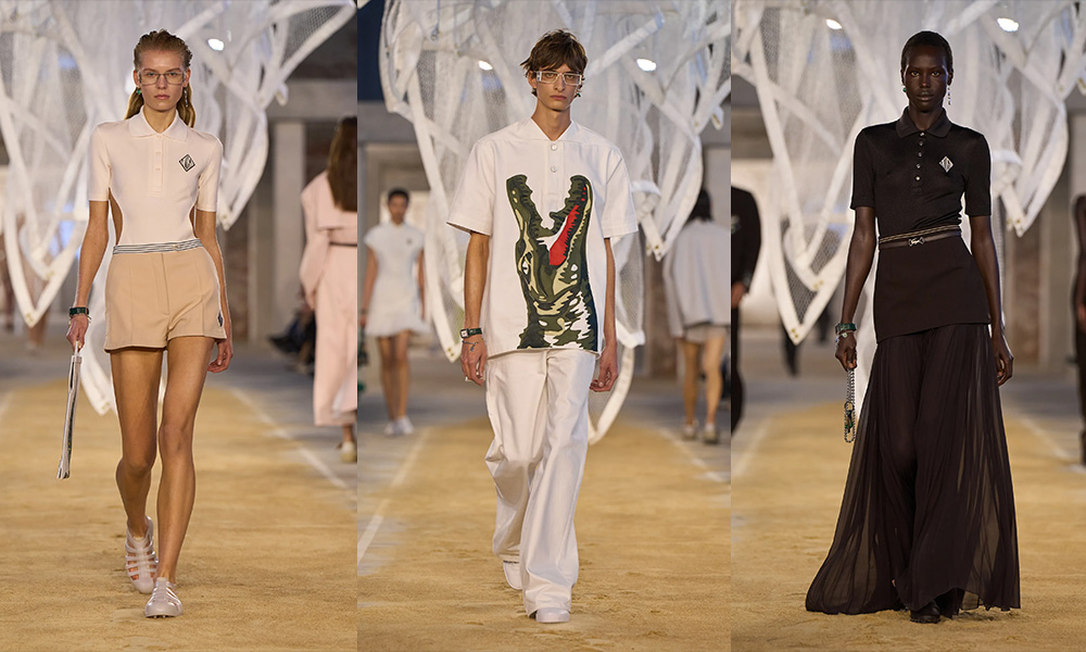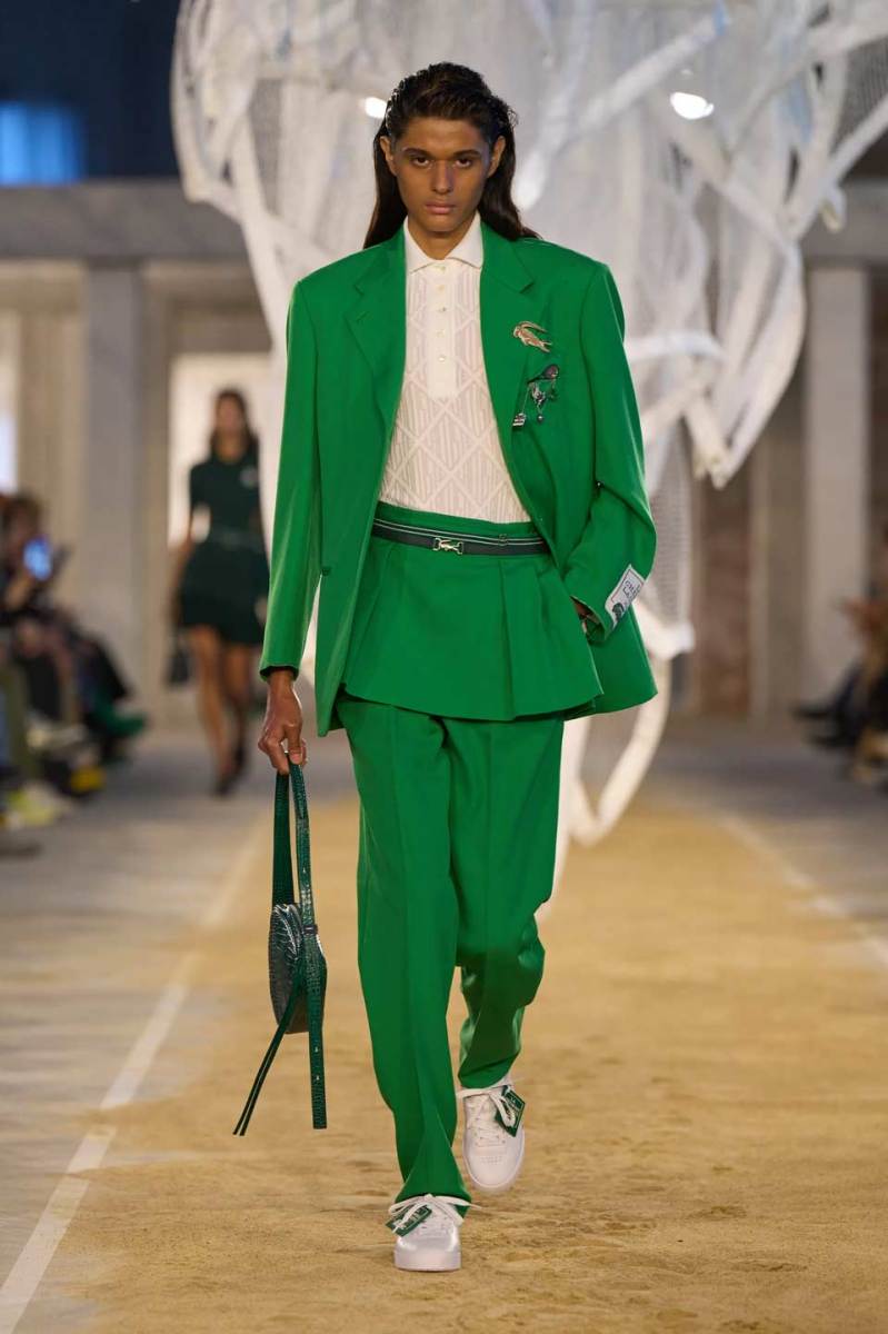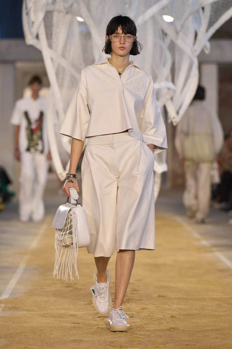 La passerella si trova all’interno di uno spazio industriale con mattoni a vista e riempita di sabbia. Al centro troviamo una scultura di Susie MacMurray, un tocco artistico decisamente inerente al concept della collezione, che vuole essere un omaggio anche a Suzanne Lenglen, grande tennista e amica di René Lacoste.