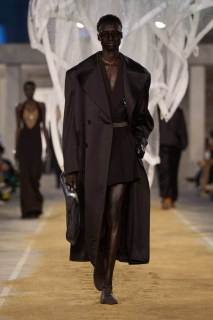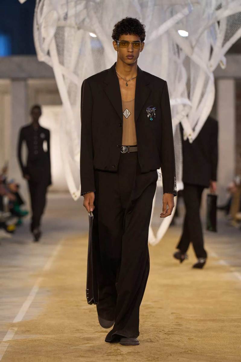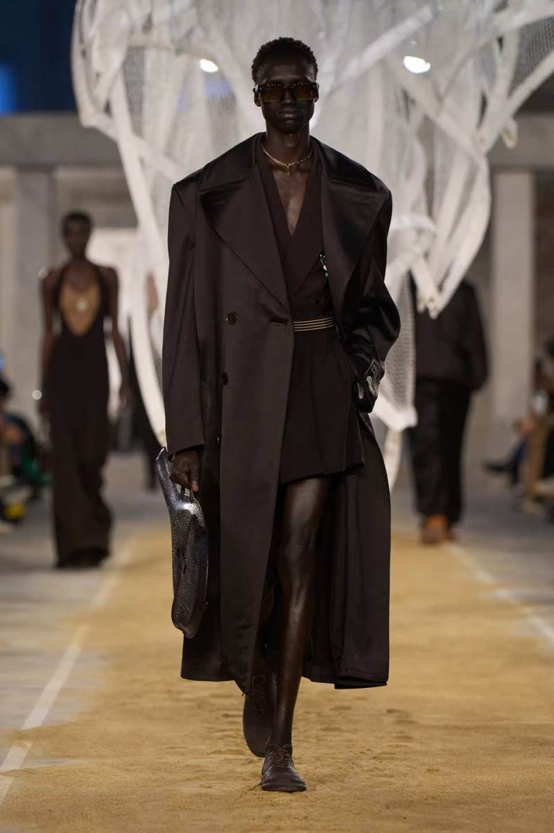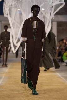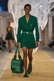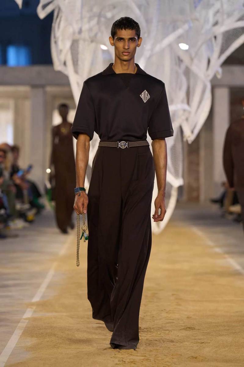 La passerella si trova all’interno di uno spazio industriale con mattoni a vista e riempita di sabbia. Al centro troviamo una scultura di Susie MacMurray, un tocco artistico decisamente inerente al concept della collezione, che vuole essere un omaggio anche a Suzanne Lenglen, grande tennista e amica di René Lacoste.