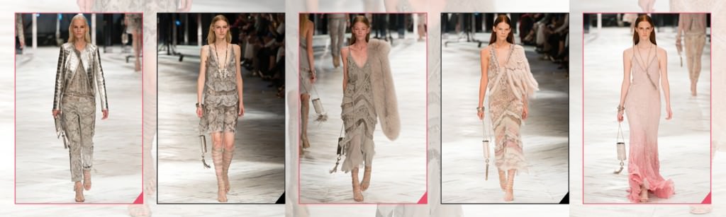 Occhi puntati sugli abiti lunghi e ampi che fluttuano, e mettono in evidenza la silhouette femminile. I ricami di perline sugli abiti in seta e chiffon, dall’aspetto impalpabile, donano sensualità e richiamano i gloriosi anni ’20, grazie alle lunghe stole in pelliccia poggiate sulla spalla nuda.