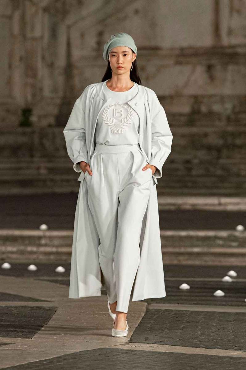 La moda ha incontrato lo sport, in particolare il golf. Per conciliare questi due mondi apparentemente estranei, Laura Biagiotti ha presentato cardigan, micro pullover a coste, baschi colorati e mocassini con la fibbia dorata. Una green attitude perfetta per donne romantiche, sportive e indipendenti.
