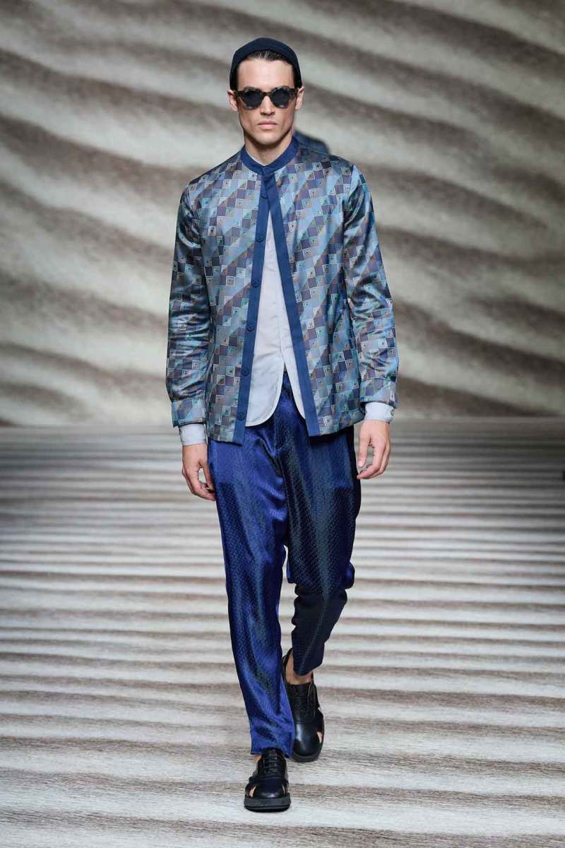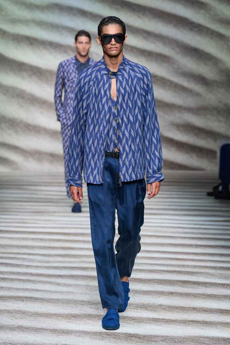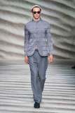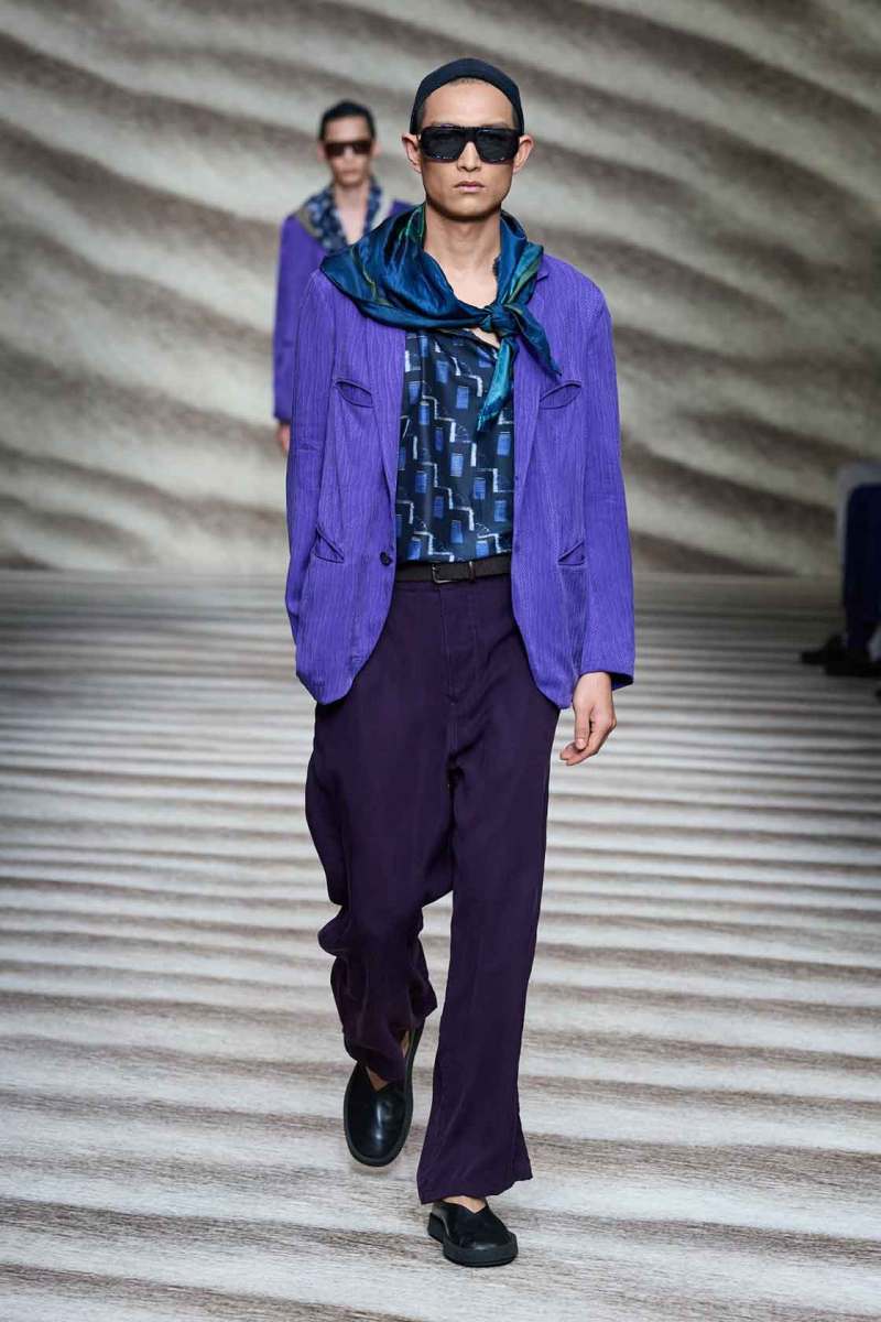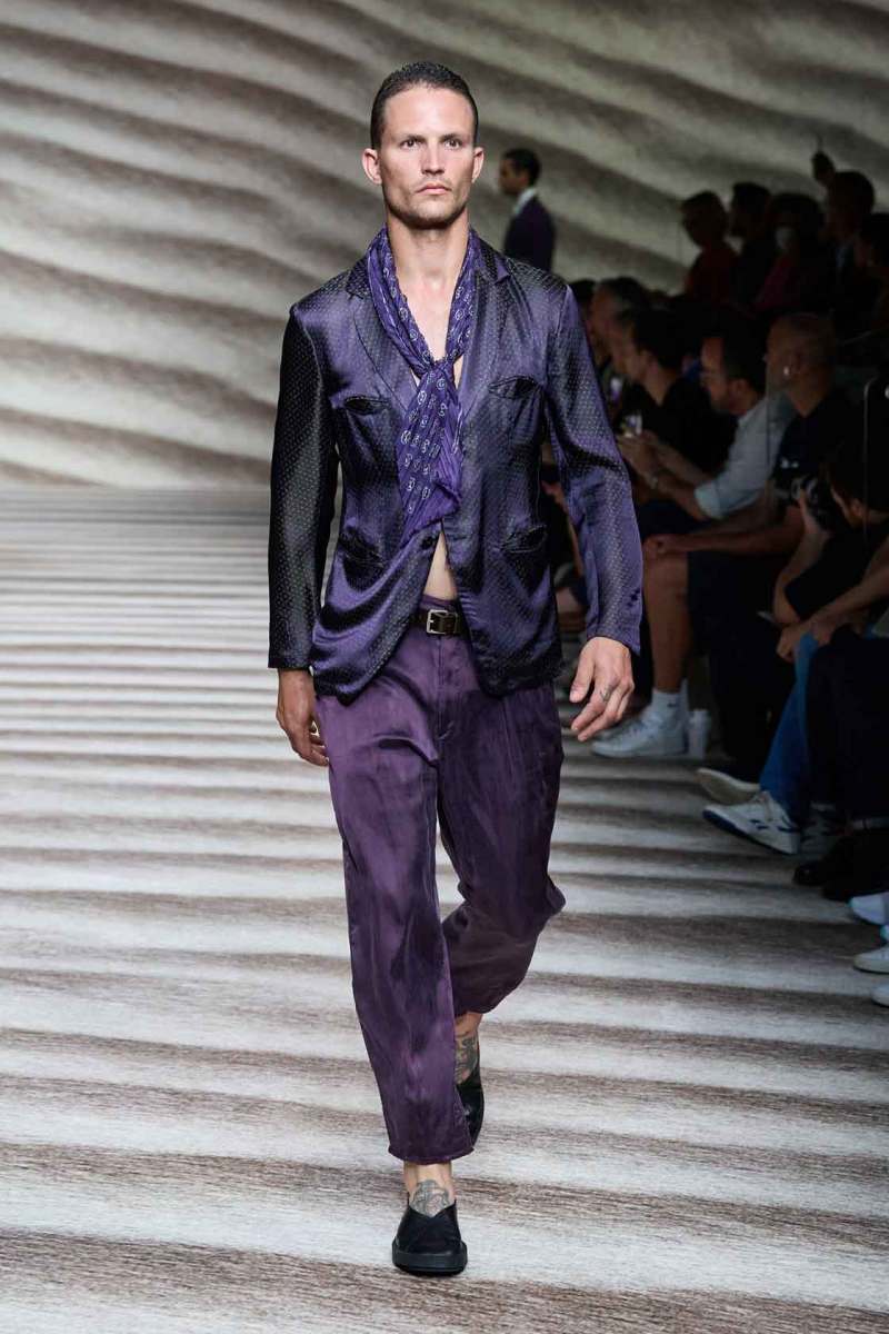 Armani esce un poco dai suoi standard, allargando il cerchio. È così che vi entrano nuove stampe orientaleggianti. «Ho disegnato giacche con leggeri profili ingranditi che sono coordinati con la sciarpa. Una ricerca senza esagerare, senza stravolgere l’immagine». Anche con i colori si osa: alla palette neutra con accenni marittimi si aggiunge un viola intenso.