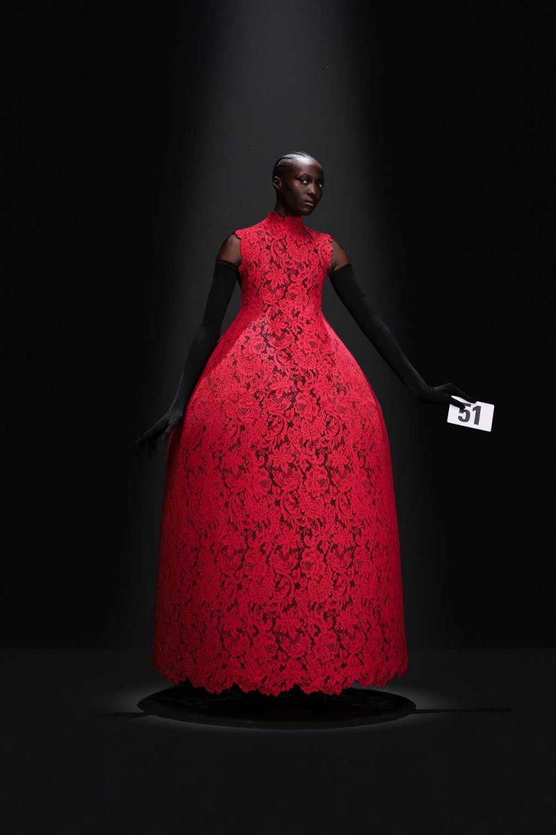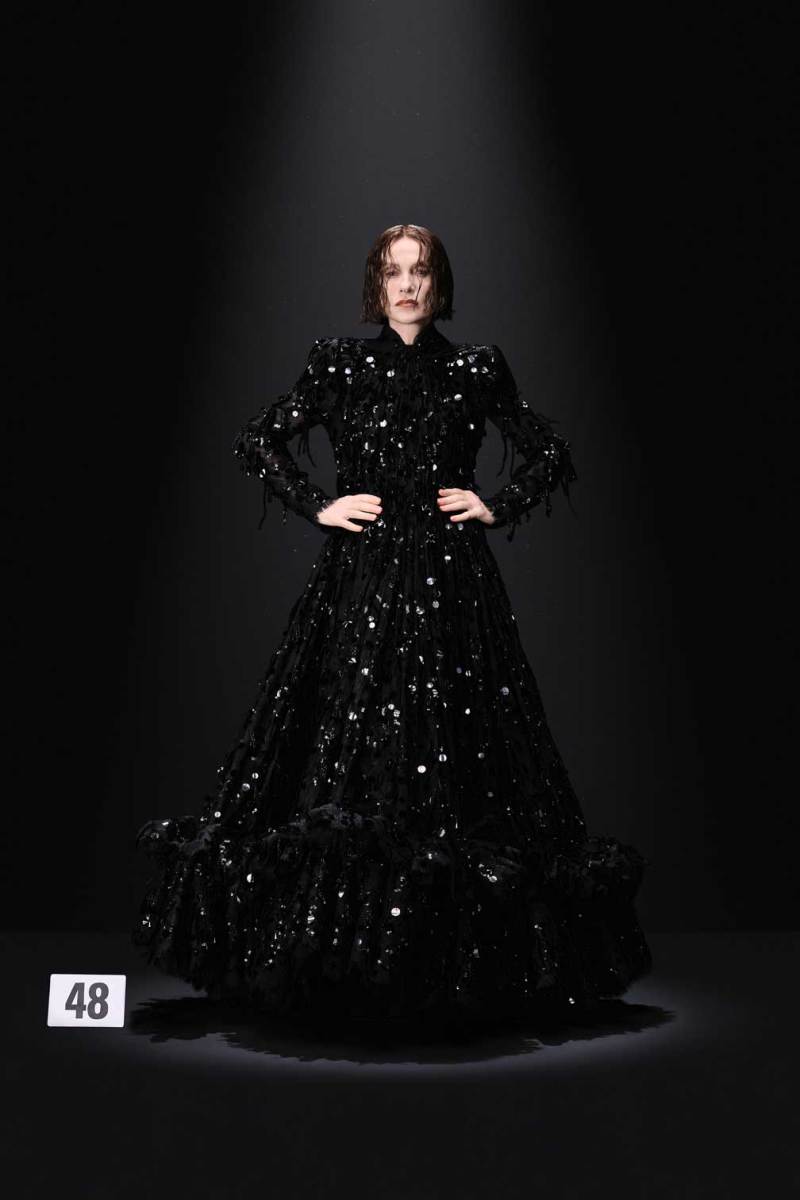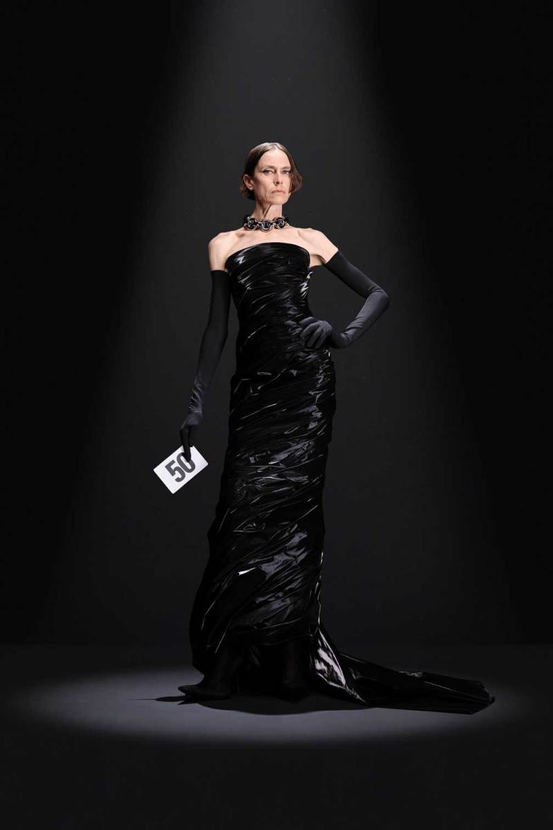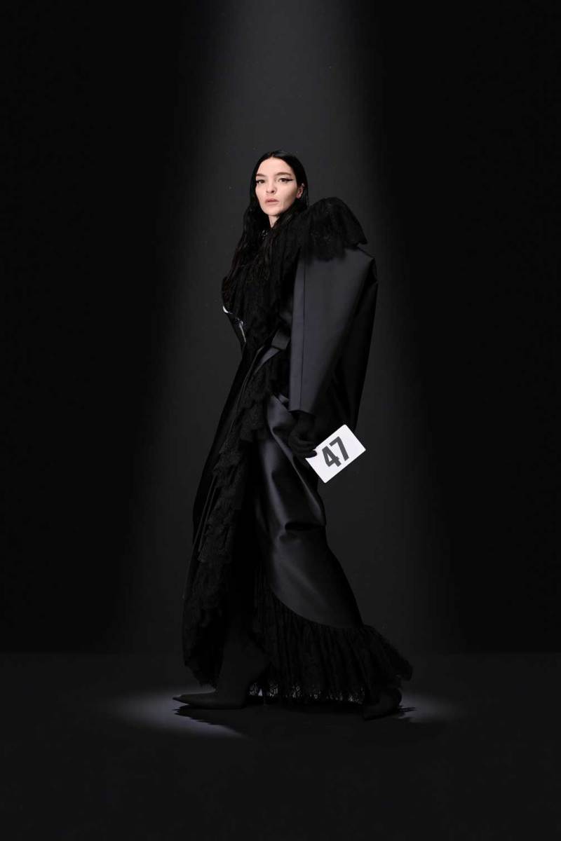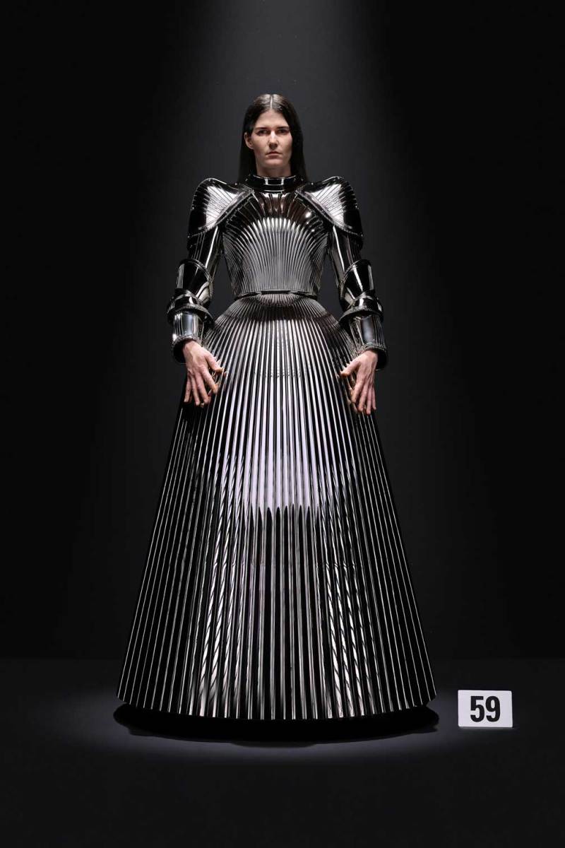 A Parigi è tempo di Alta Moda, e nel palazzo riservato alla Couture di Balenciaga sfila la nuova collezione Haute Couture AI 2023/2024. Sulle note della voce di Maria Callas, rivisitata dall’intelligenza artificiale, Demna manda in cortocircuito il senso del tempo e dello spazio congelando i capi di sua creazione come in un vecchio scatto. L’indissolubile legame tra passato e presente è evidente sin dal primo look, rivisitazione di un abito originale di Cristóbal Balenciaga, indossato dalla sua modella preferita, Danielle Slavik, e amato anche dalla già principessa Grace Kelly. La modella infatti veste in velluto total black anni ’50 su cui spicca la doppia collana di perle bianche abbinata ai guanti, anch’essi in velluto. Chiude invece la sfilata l’artista Eliza Douglas, che assume il ruolo di una Giovanna D’Arco 2.0 portando un abito stampato in 3D di resina argentata che dà l’effetto di una pesante armatura, come a simboleggiare il senso di protezione e sicurezza che ci forniscono i vestiti che indossiamo nelle nostre battaglie quotidiane.