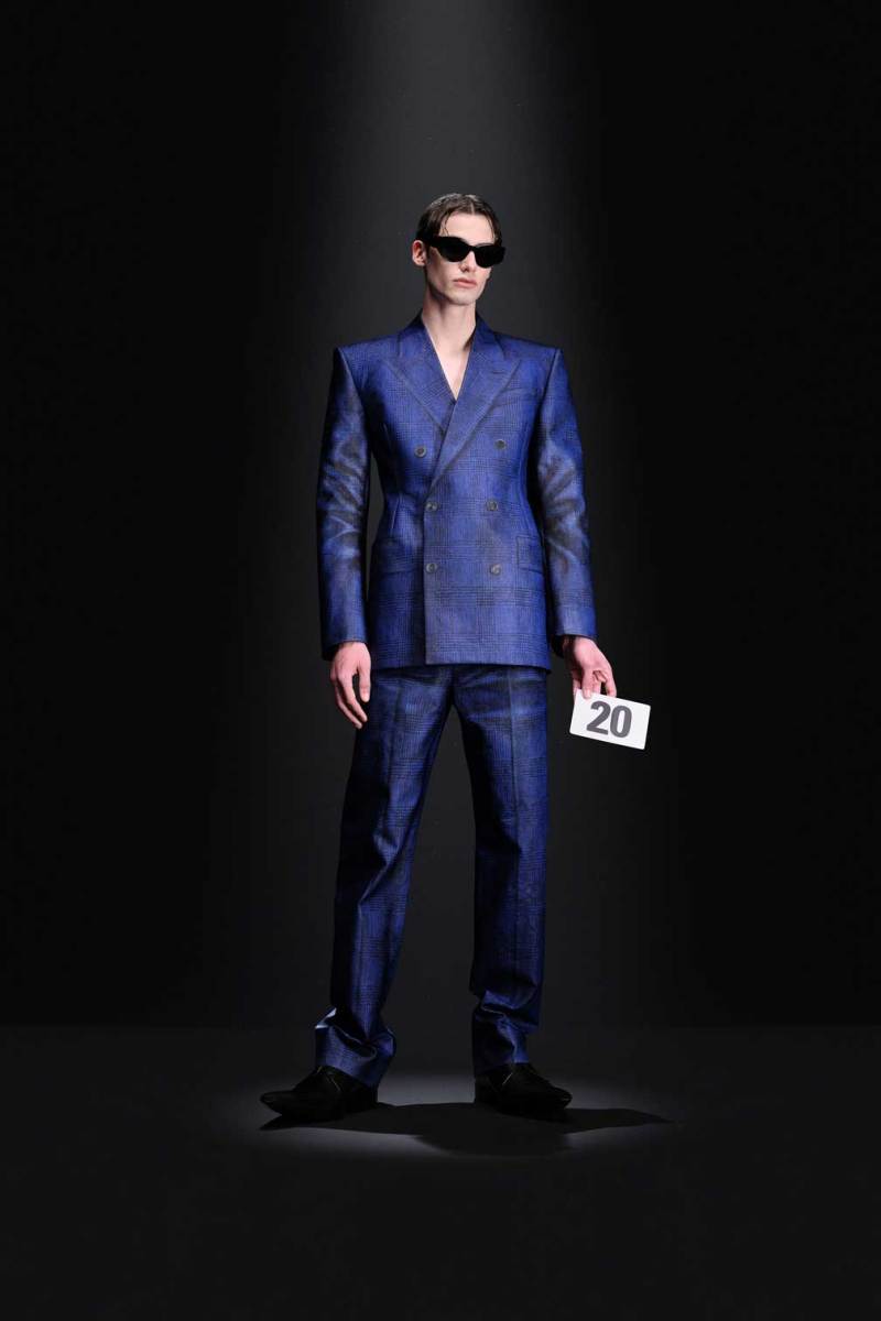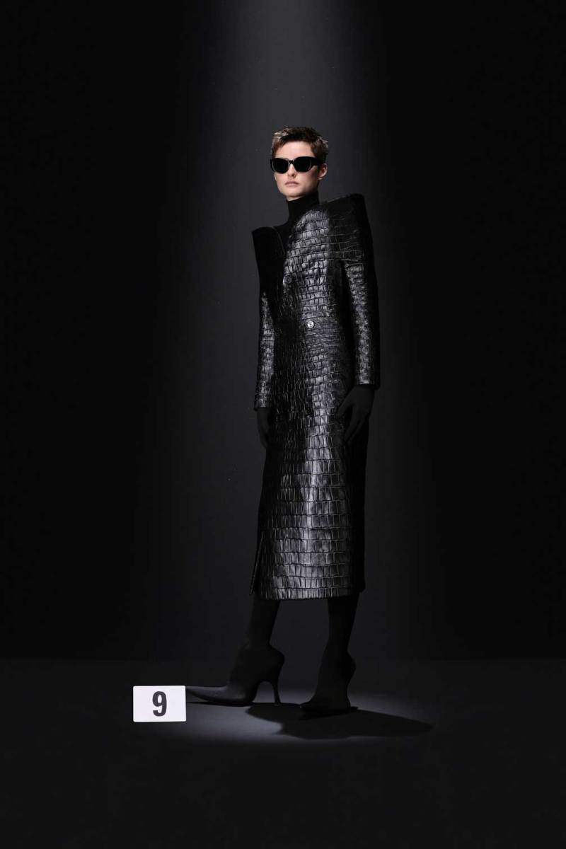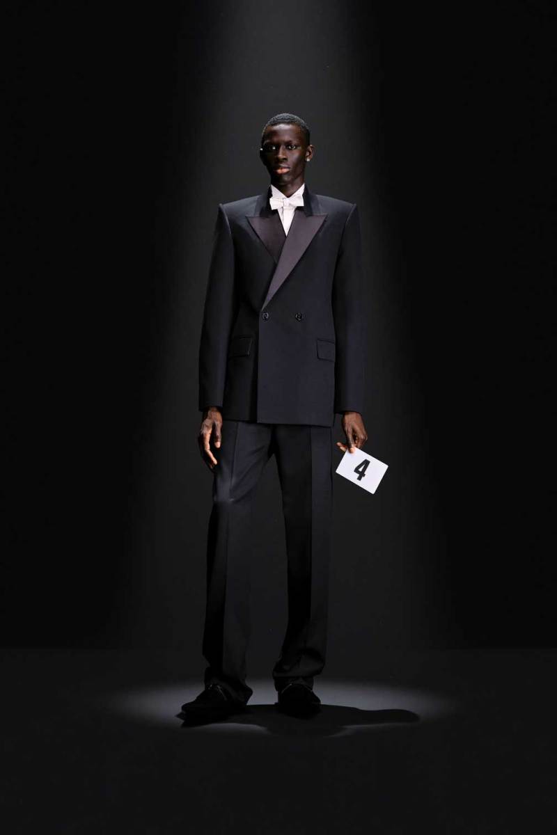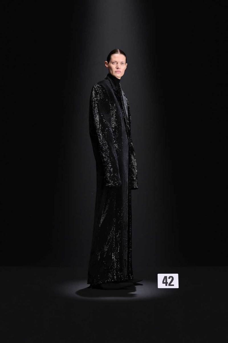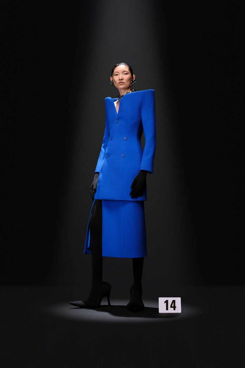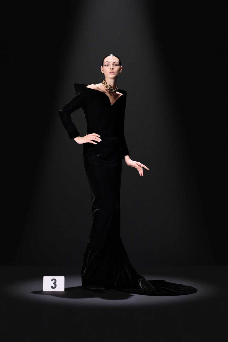 A Parigi è tempo di Alta Moda, e nel palazzo riservato alla Couture di Balenciaga sfila la nuova collezione Haute Couture AI 2023/2024. Sulle note della voce di Maria Callas, rivisitata dall’intelligenza artificiale, Demna manda in cortocircuito il senso del tempo e dello spazio congelando i capi di sua creazione come in un vecchio scatto. L’indissolubile legame tra passato e presente è evidente sin dal primo look, rivisitazione di un abito originale di Cristóbal Balenciaga, indossato dalla sua modella preferita, Danielle Slavik, e amato anche dalla già principessa Grace Kelly. La modella infatti veste in velluto total black anni ’50 su cui spicca la doppia collana di perle bianche abbinata ai guanti, anch’essi in velluto. Chiude invece la sfilata l’artista Eliza Douglas, che assume il ruolo di una Giovanna D’Arco 2.0 portando un abito stampato in 3D di resina argentata che dà l’effetto di una pesante armatura, come a simboleggiare il senso di protezione e sicurezza che ci forniscono i vestiti che indossiamo nelle nostre battaglie quotidiane.