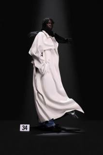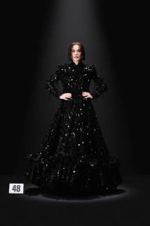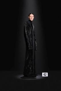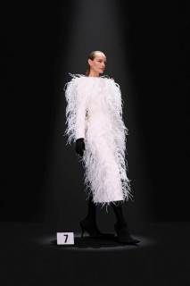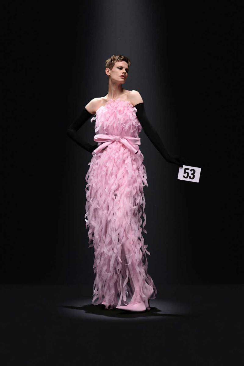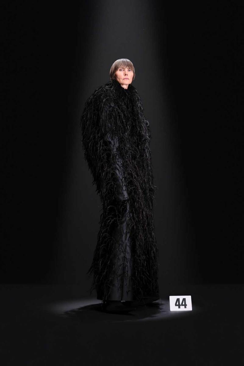 La nuova collezione Balenciaga by Demna, presentata all’Haute Couture di Parigi, espone look di straordinaria eleganza in cui la classicità si intreccia con dettagli insoliti come i fiocchi per capelli e le sciarpe rigide, fisse in una folata di vento. Predominante è il nero, che tuttavia lascia talvolta il posto alla vivacità dell’oro, del fucsia, del rosa e del blu. Sfilano cappotti in pelliccia sintetica, soprabiti animalier o decorati con piume, o ancora, spiccano abiti da sera ricoperti di cristalli, glitterati, con decorazioni di pizzi e paillettes, mentre i look maschili appaiono essere più essenziali. Le forme nel complesso risultano pulite, prive di eccessi e minimaliste, in contrasto con l’opulenza dei tessuti. La nuova collezione di Demna si presenta quindi come un sapiente intreccio di look classici e retrò e tecniche all’avanguardia: così in una fusione di vecchio e nuovo si raggiunge la perfezione.