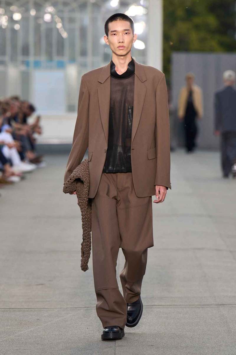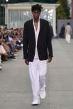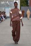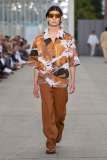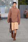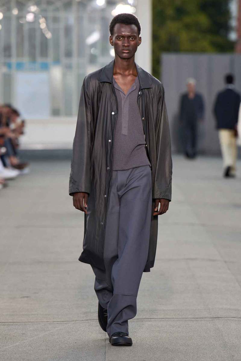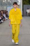 “Fluidità” è la chiave di lettura della collezione uomo. Questa tematica è leggibile sia nella scelta dei tessuti sia nelle shape dei modelli della collezione. In passerella si alternano giacche e trench di nylon a blouse dall’effetto spalmato. Superfici lucenti e fluide. Camicie a scatoletta a bermuda in vinile. Piccoli dettagli che parlano di innovazione e modernità. Zaini tecnici in nylon, zip spalmate accessorie a ricreare continui giochi di aperture, bomber tecnici e giochi di trasparenze.