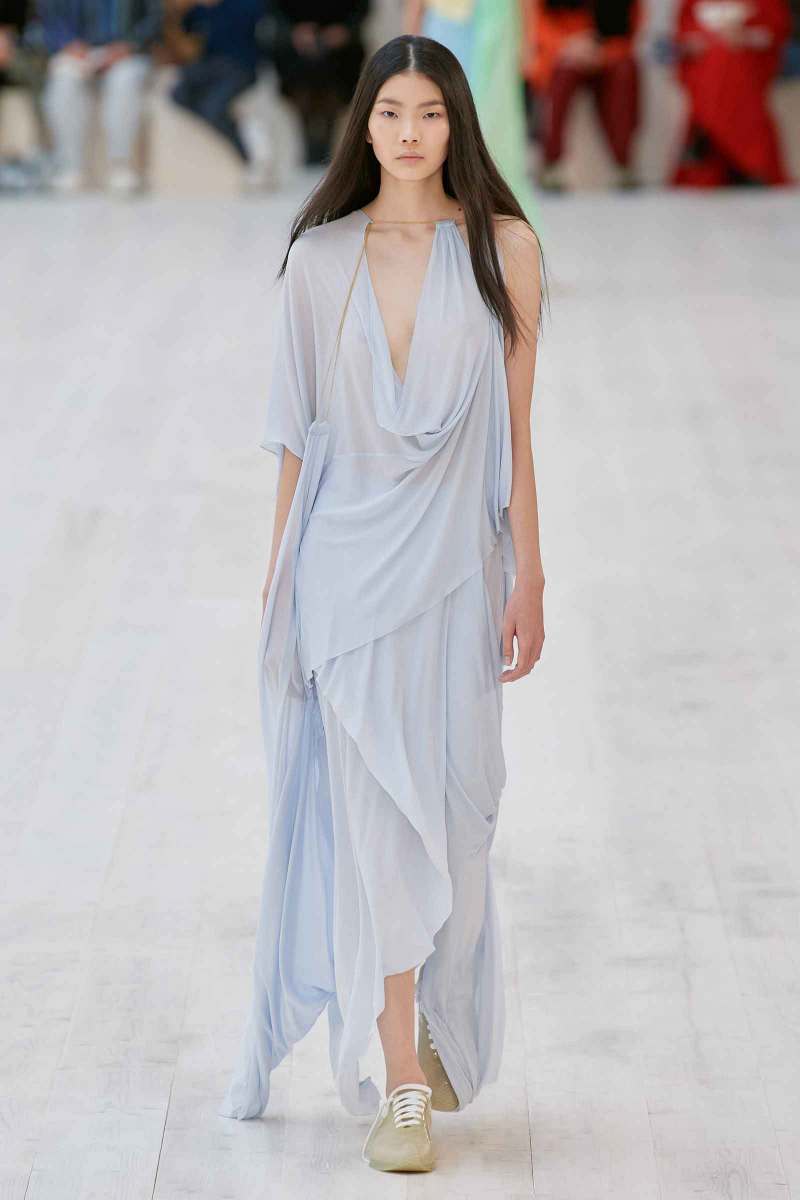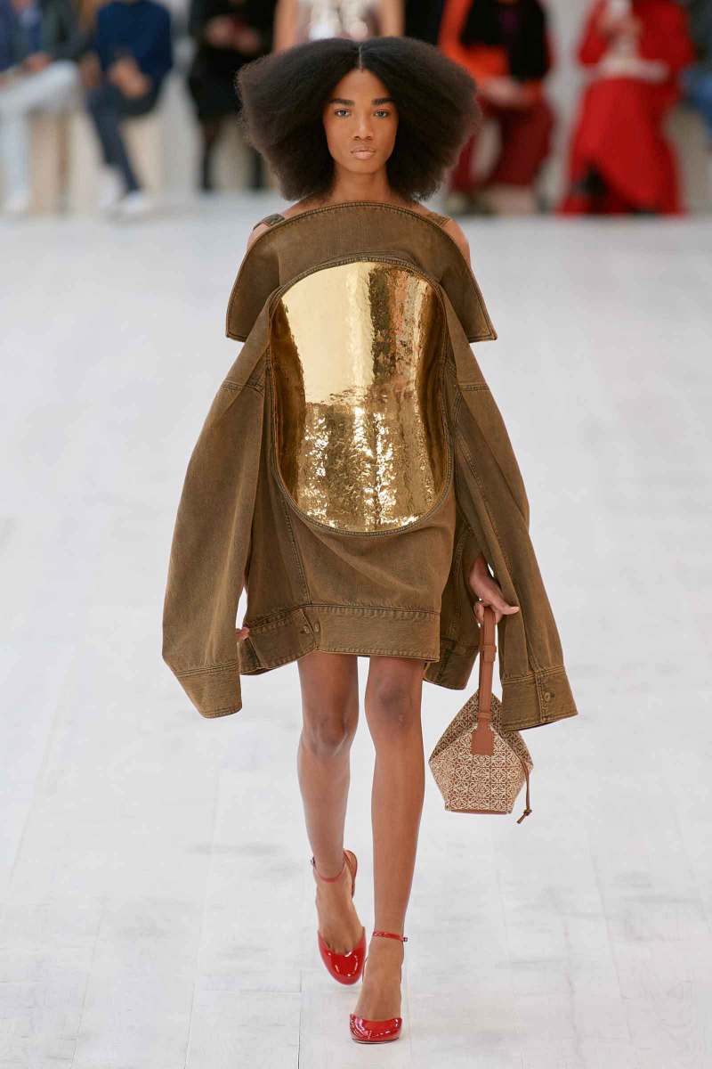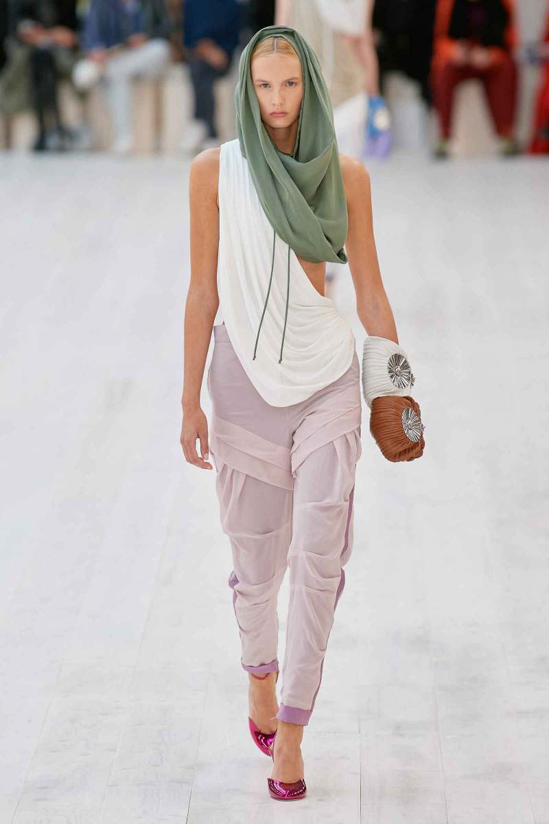 Per l’ispirazione principale Anderson attinge al mondo artistico, settore a cui si affida spesso, e più specificatamente alla pittura rinascimentale di Jacopo Carucci. Conosciuto come Pontormo ed esponente degli “eccentrici fiorentini”, è ricordato come uno dei pionieri della pittura manierista. Nella sfilata di Loewe si possono notare diversi dettagli tipici di questa corrente artistica, dalla complessità nella costruzione all’uso dei colori, fino all’uso del drappeggio.