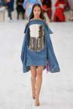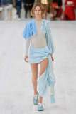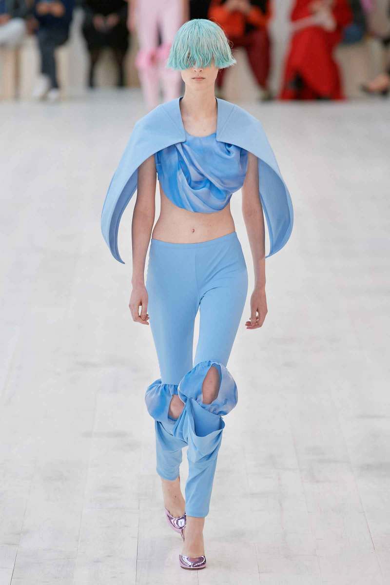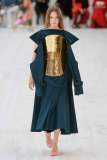 E ancora, guglie metalliche che modellano il busto, rouges dagli ampi volumi, tagli improvvisi. Tra le protagoniste indiscusse della collezione ci sono le aperture frontali a formare una sorta di oblò, il cui materiale plastificato permette di intravedere il corpo sottostante. Il risultato è una collezione innovativa dalle forme geometriche e silhouettes scultoree. Impossibile non notare, a completamento di questi look contemporanei e complessi, le scarpe e i sandali dai tacchi eccentrici. Al posto del comune rialzamento infatti troviamo saponette, candeline, uova e smalti, che non deludono le aspettative dei più creativi.