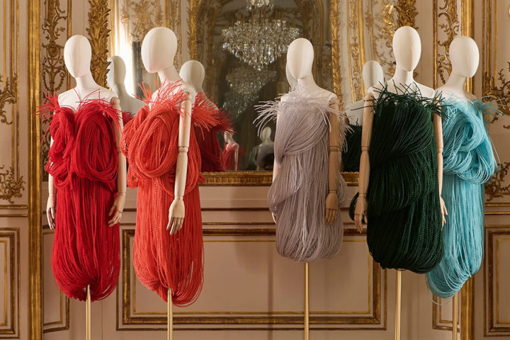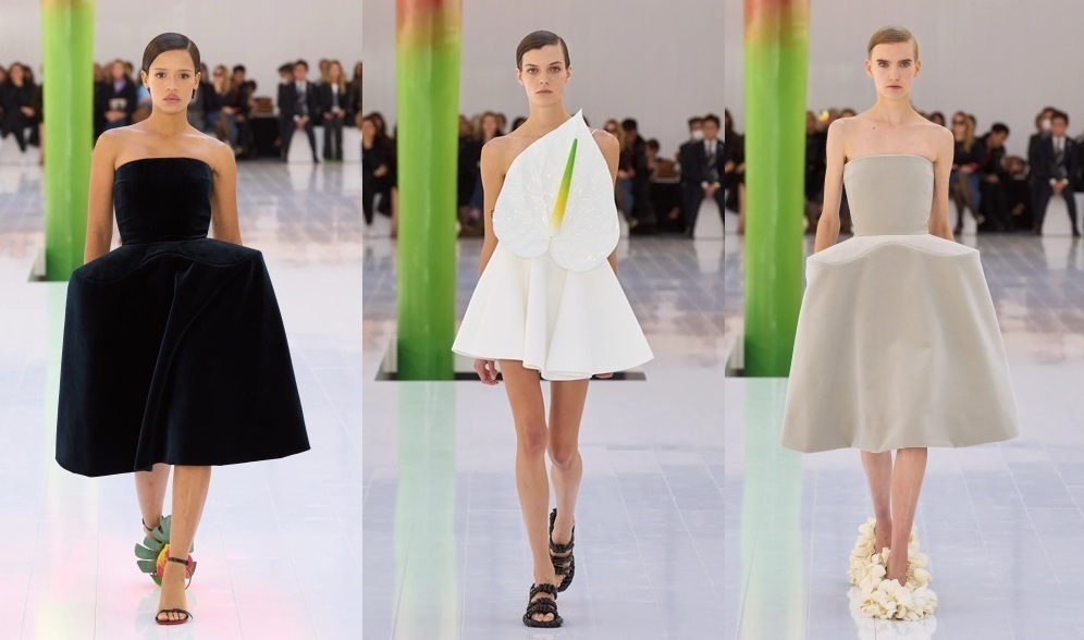 Le décolletées a punta di colore rosso vengono ridimensionate nei volumi, come a ricordare la corporeità del fiore, mentre i sandali rossi intrecciati accompagnano minidress dai colori vivaci, in cui prende forma, nella parte del petto, un Anthurium “pronto da indossare”. Sfilano abiti che si allargano a corolla sulle cosce, altri nascono da un drappeggio, lasciando i fianchi scoperti.
