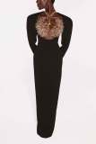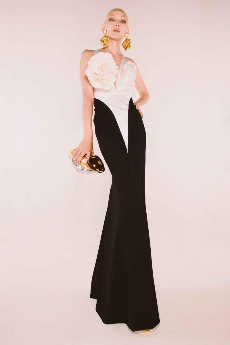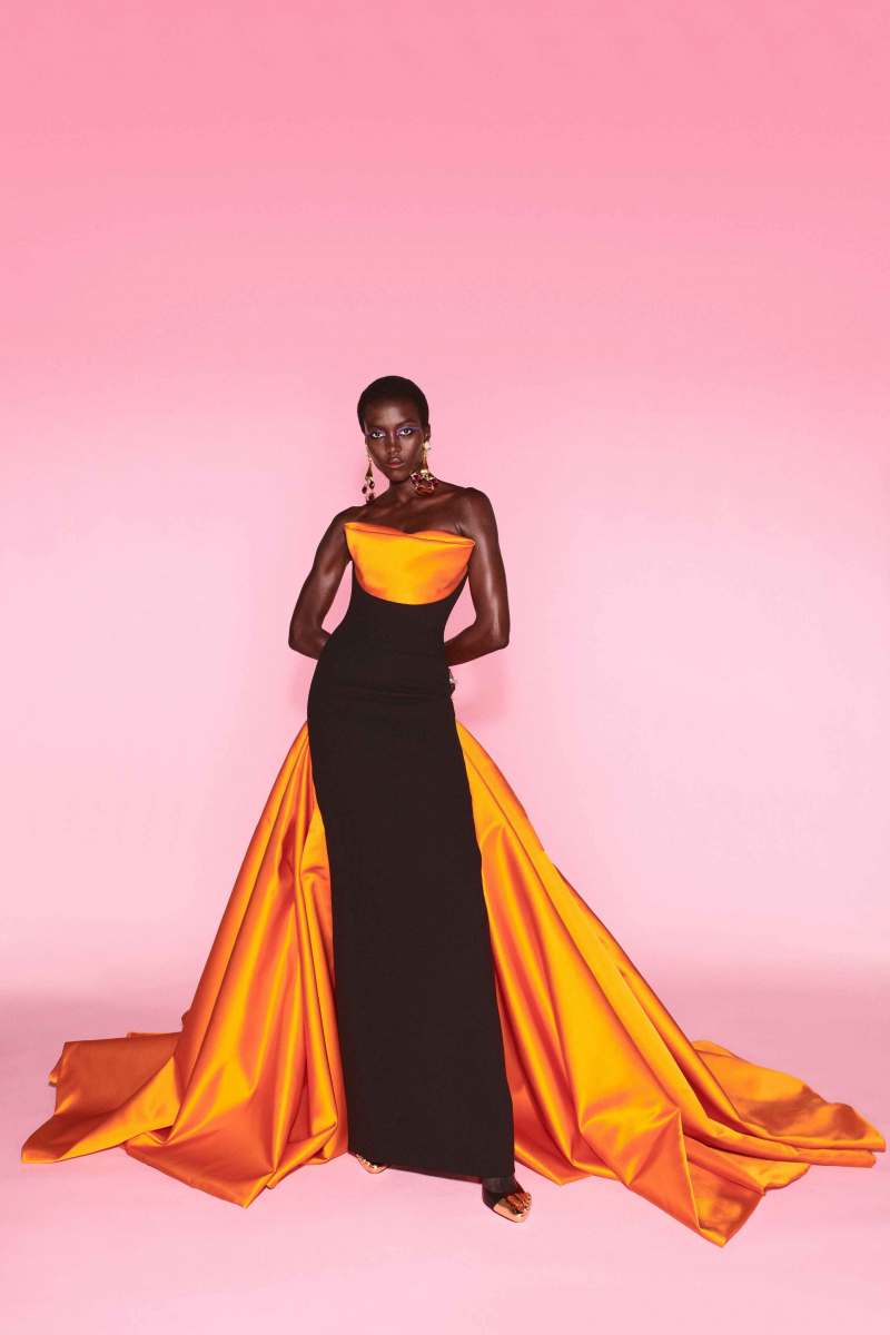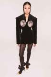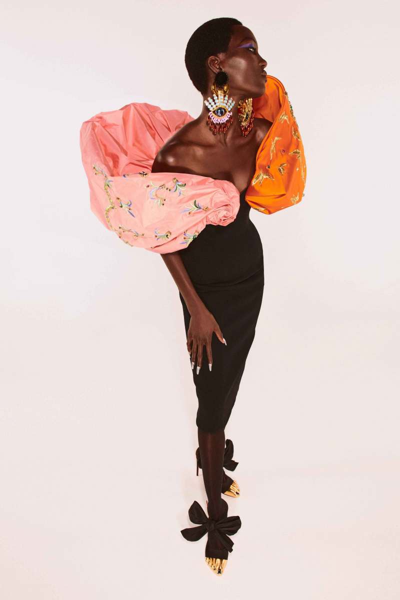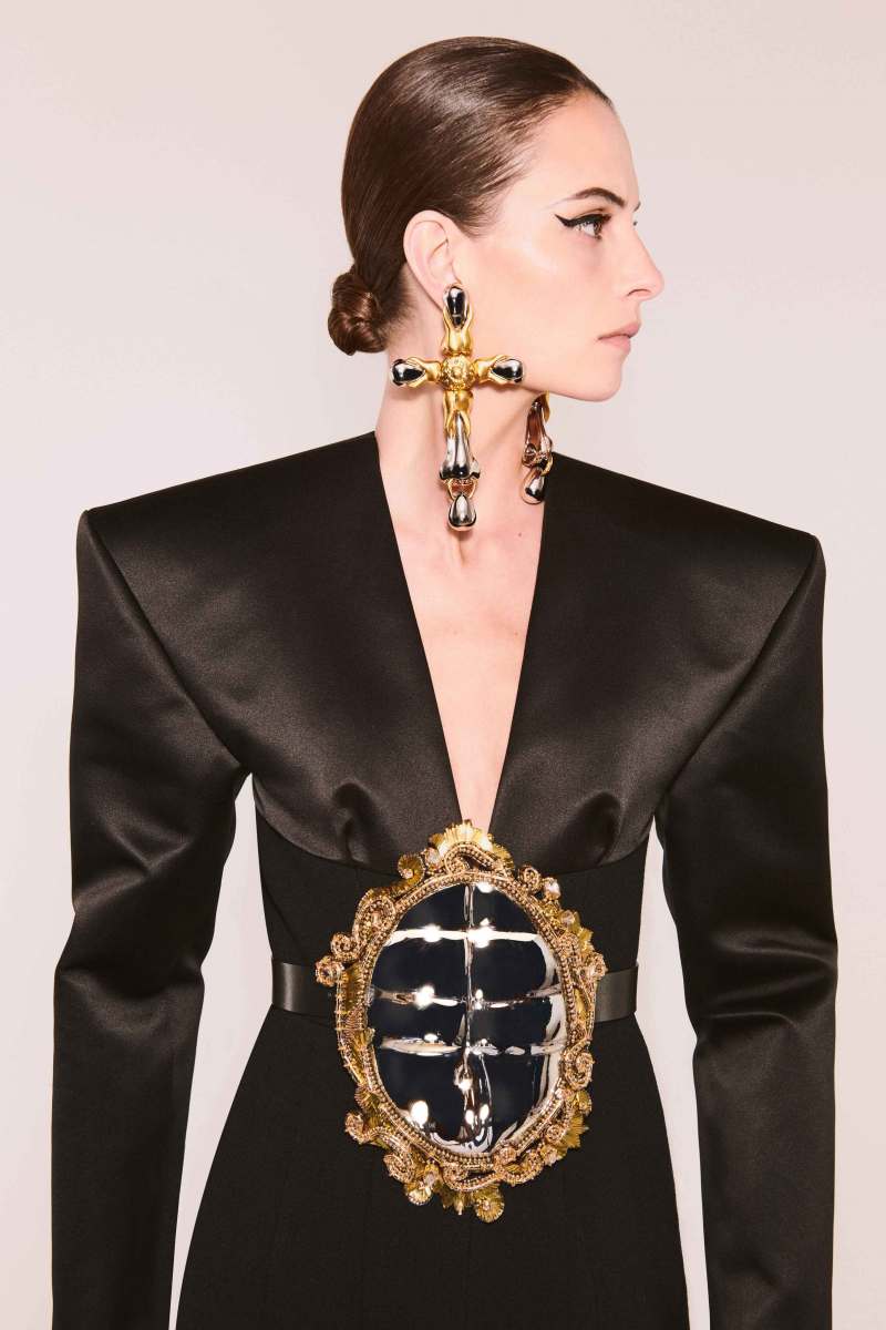 Ma il viaggio fantastico di Schiaparelli non si ferma al mondo dei toreador, i quali sembrano fungere da sola porta di accesso ad un mondo di lusso roboante dove poter realizzare i sogni di alta moda più sfrenati. Al nero profondo di abiti che sembrano disegnare al millimetro le forme del corpo vengono accostati i bagliori metallici del lurex e dei tessuti specchiati: è così che le silhouette diventano extra, reminiscenti delle passerelle sfavillanti degli anni ’80 e ’90, le gonne a palloncino si gonfiano come nuvole, gli scolli diventano opere architettoniche che incorniciano quando solo il viso, quando l’intero corpo.