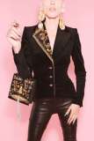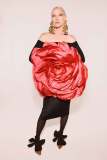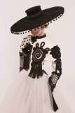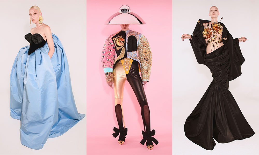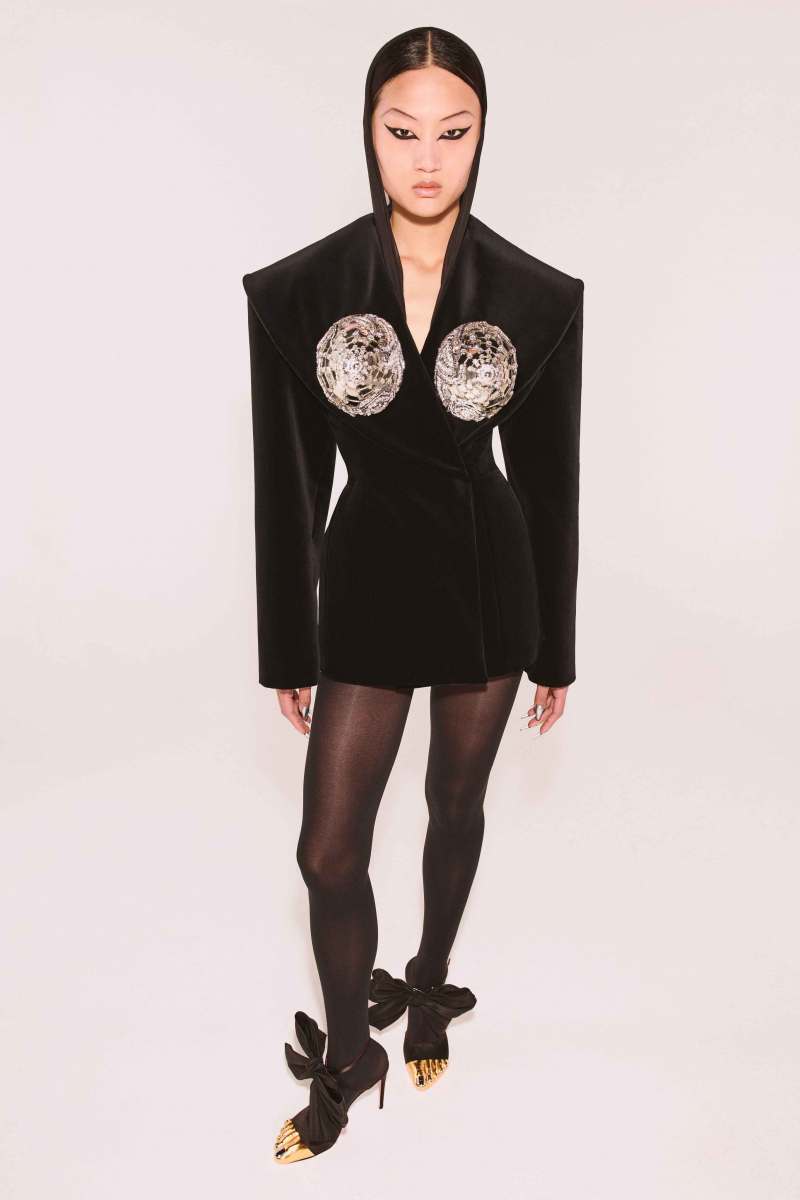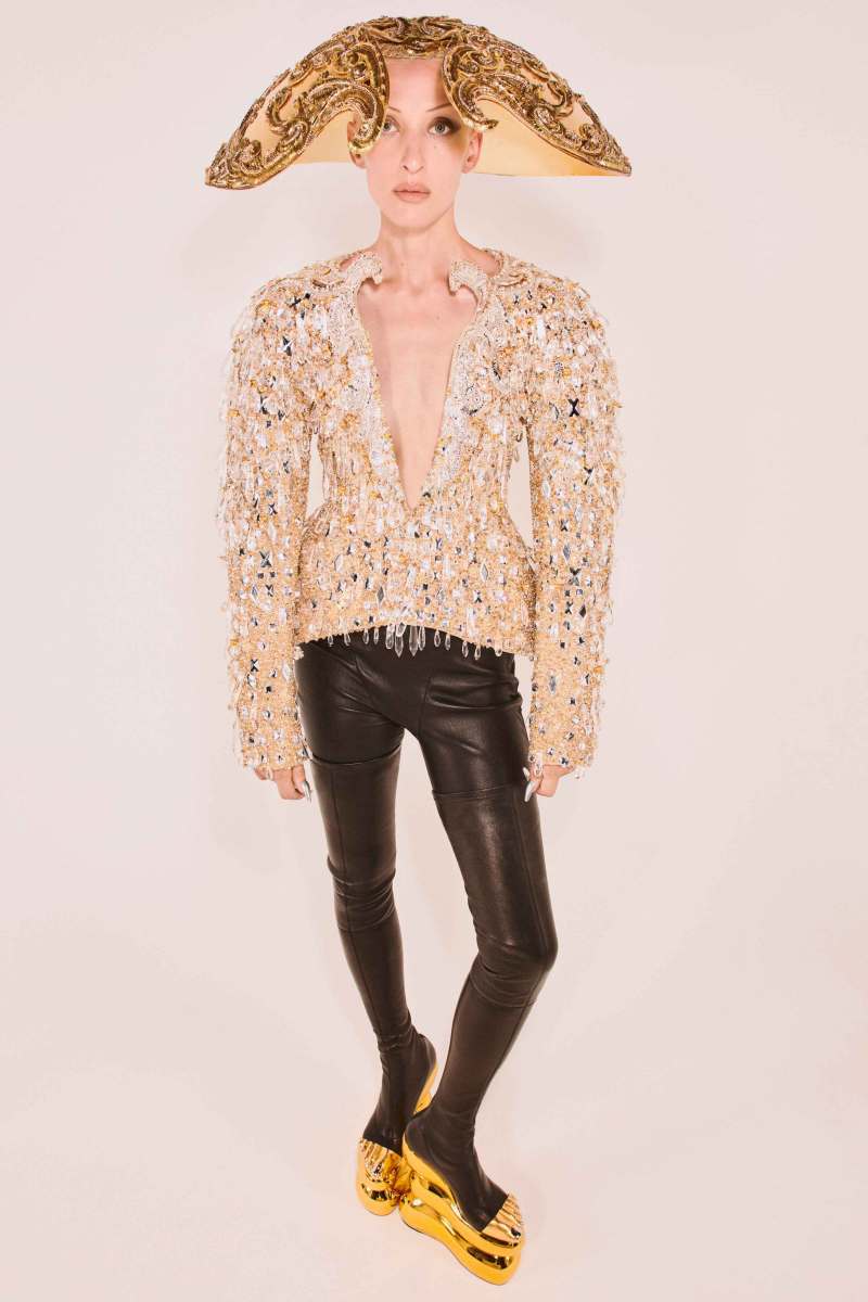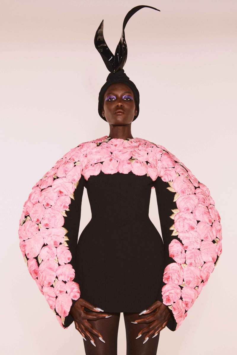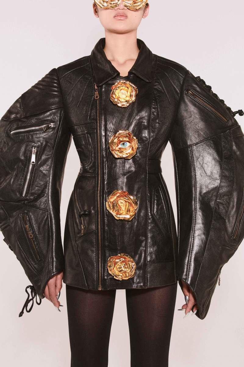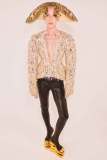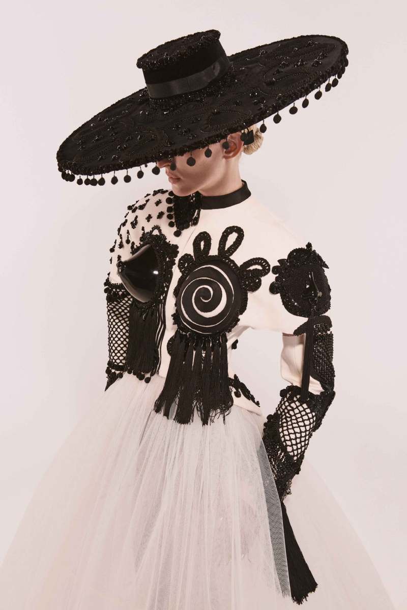 Ed ecco dunque che le giacche iconiche del torero vengono proposte con maniche a botte esagerate, quando in jeans vintage tempestato di applique che ricordano ex-voto preziosi, quando decorate da nappe e ornamenti ondeggianti che ritornano anche su un cappello a tesa larghissima. Le stesse maniche monumentali sono poi sommerse da una cascata di rose su un tubino nero dal taglio geometrico, mentre assumono un’allure quasi cyberpunk su una giacca di pelle tagliata a vestito corto.