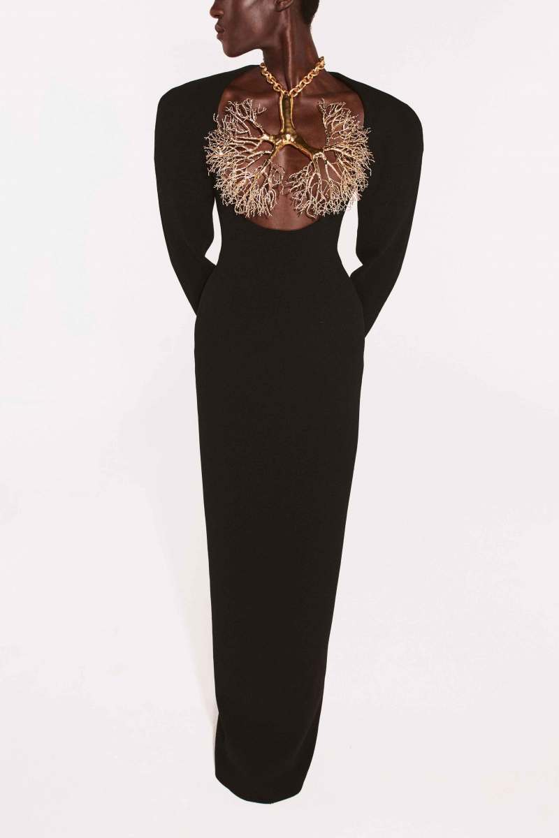 Il pezzo iconico della collezione resta però uno: una collana a forma di polmoni, opera trompe l’oeil in cui le parti degli alveoli sono magistralmente riprodotte in ottone dorato ricoperto di strass. Un accessorio più unico che raro che, al solo guardarlo, fa venire in mente un quesito, valido forse per l’intera collezione di alta moda di Schiaparelli: sogniamo o siamo desti?