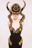 L’avversario del matador, il toro, è incarnato da pezzi diabolicamente sensuali. Lo scollo di un abito a guaina in crepe di lana nero viene modellato artigianalmente per formare due corni tempestati di filigrana, perle e perline dorate, mentre un bustier in raso di seta assume le fattezze di una fronte di ariete e si staglia sopra a stivali cuissardes ricoperti di perline e cristalli Swarovski.