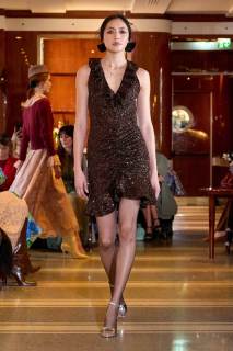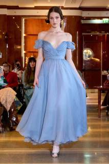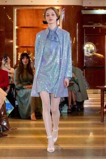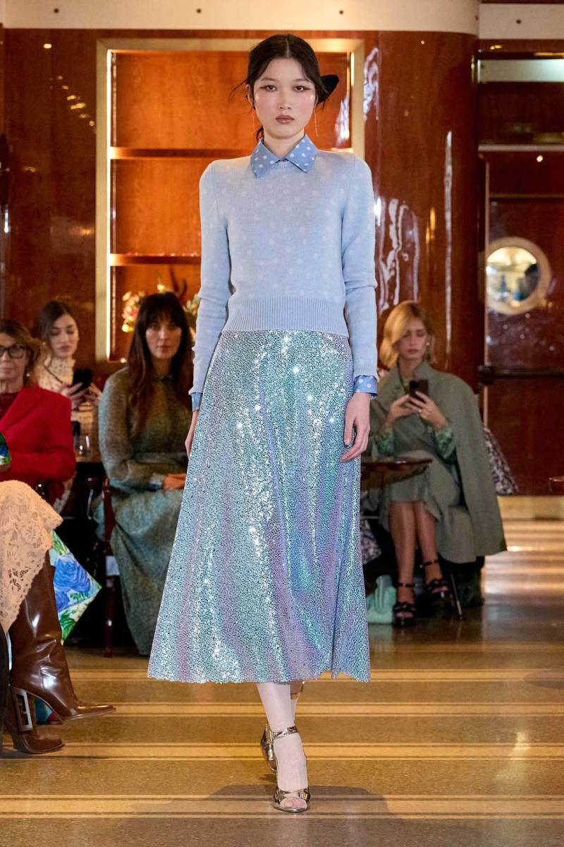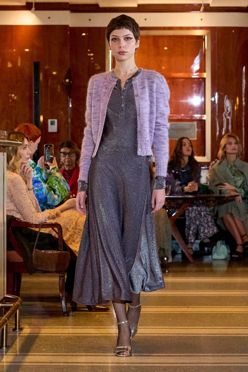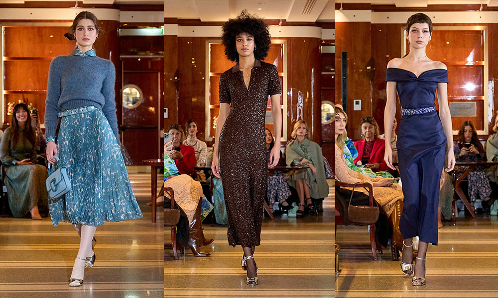 Le silhouette sono impeccabili: camicie in seta a pois si abbinano a longuette tempestate di paillettes, mentre gli abiti ampi e leggeri sembrano fatti per una serata da sogno o un ballo sotto le stelle. Il pizzo avvolge il corpo con grazia, segnando appena il punto vita, e le stampe floreali aggiungono un tocco poetico tra chiffon impalpabili e bagliori di luce. La palette spazia tra il bianco candido, il burgundy profondo e i delicati toni pastello, rendendo ogni look sofisticato e irresistibile.