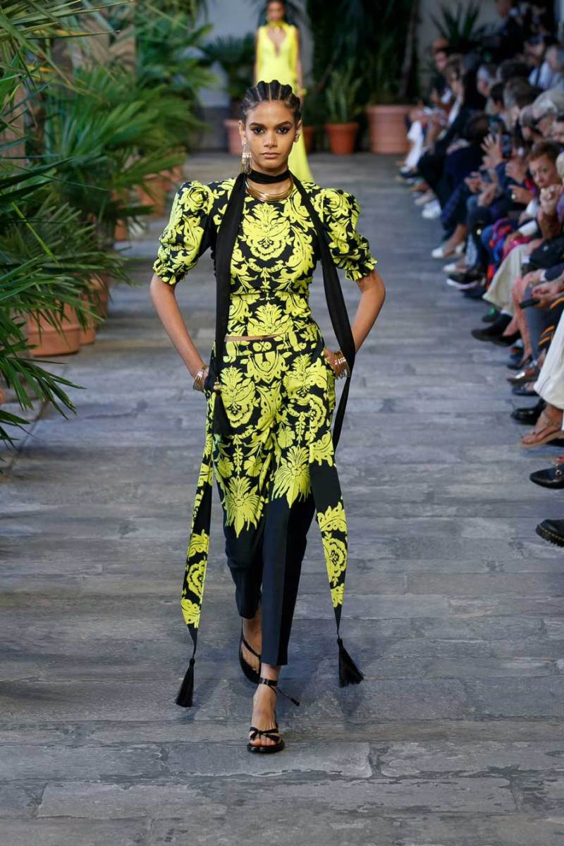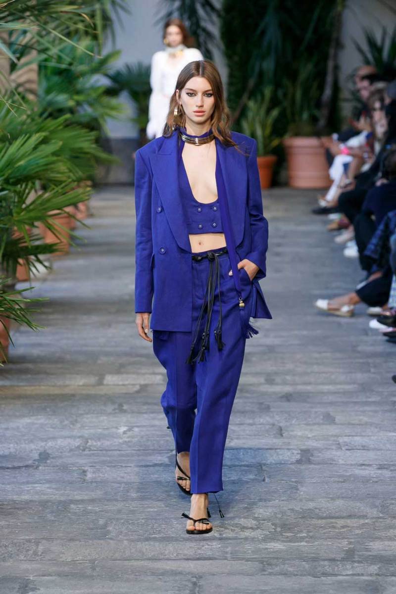 Blazer, donne ricamate e stampate, tailleur dall’alluce androgino, giacche over, pantaloni a palazzo e top stile reggiseno sono i capi più apprezzati in passerella. Non mancano i richiami floreali su gilet e sui capi di maglierie, come le pappine e i pom pom che sdrammatizzano i vari look.