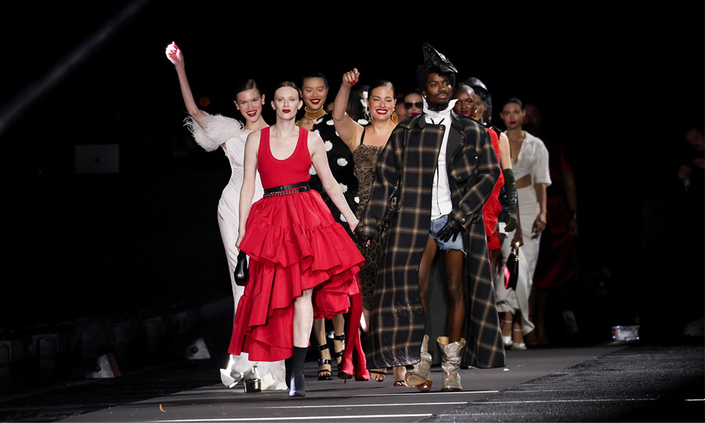 I designer hanno dunque potuto sbizzarrirsi con i loro cavalli di battaglia – presenti ad esempio i tulle vaporosi di Giambattista Valli, le asimmetrie di Jacquemus, i tubini di Versace e il tartan di Vivienne Westwood – ma il tutto doveva essere rigorosamente declinato in una palette fatta di nero, rosso, bianco, argento e nude. “Rendere coeso questo spettacolo non è stato semplice, specialmente dovendoci attenere ad una palette ristretta” ha commentato Enninful. “Ma, d’altro canto, noi adoriamo le sfide!“.