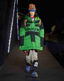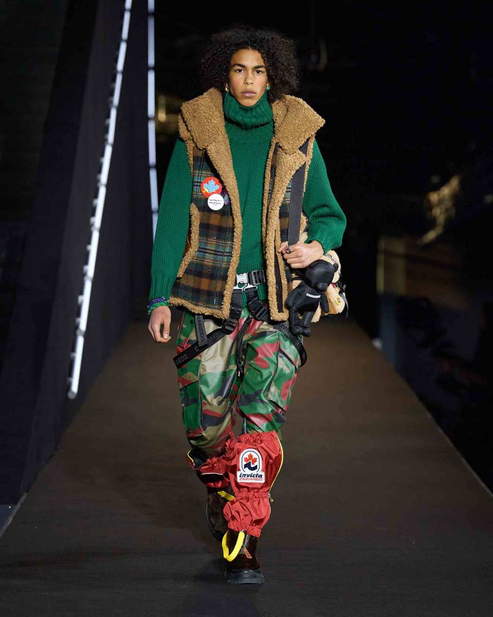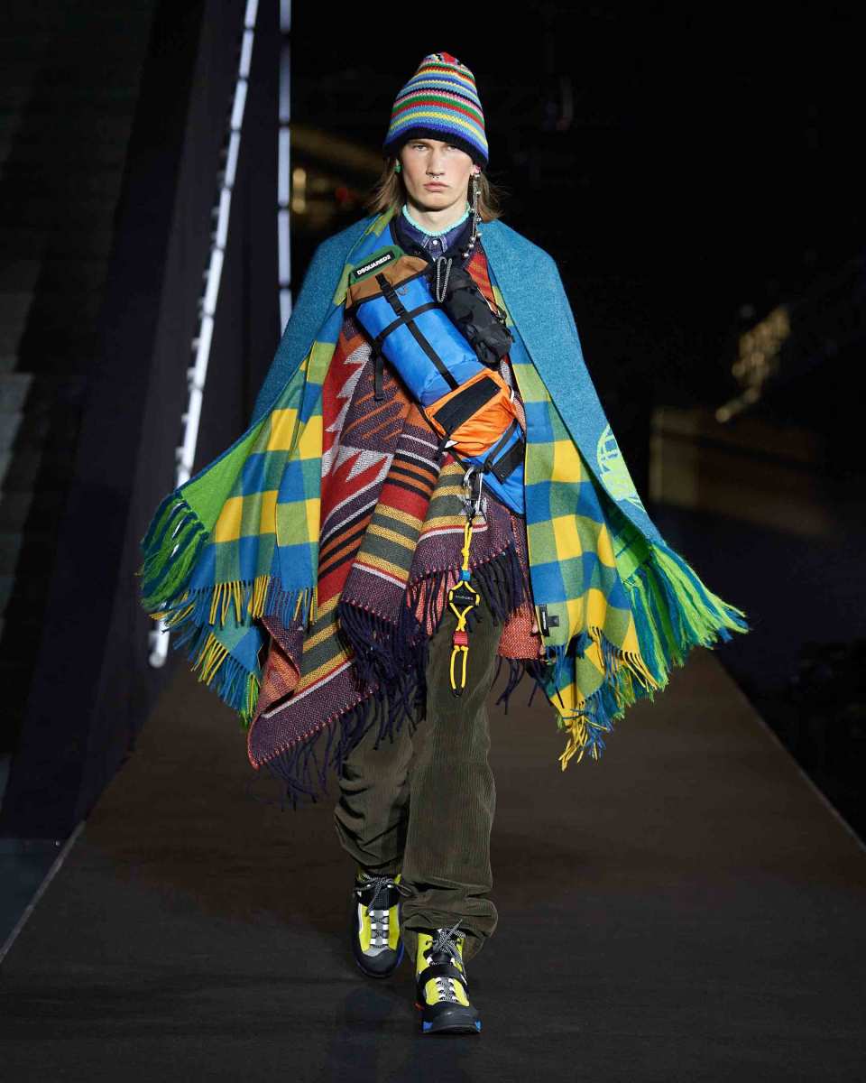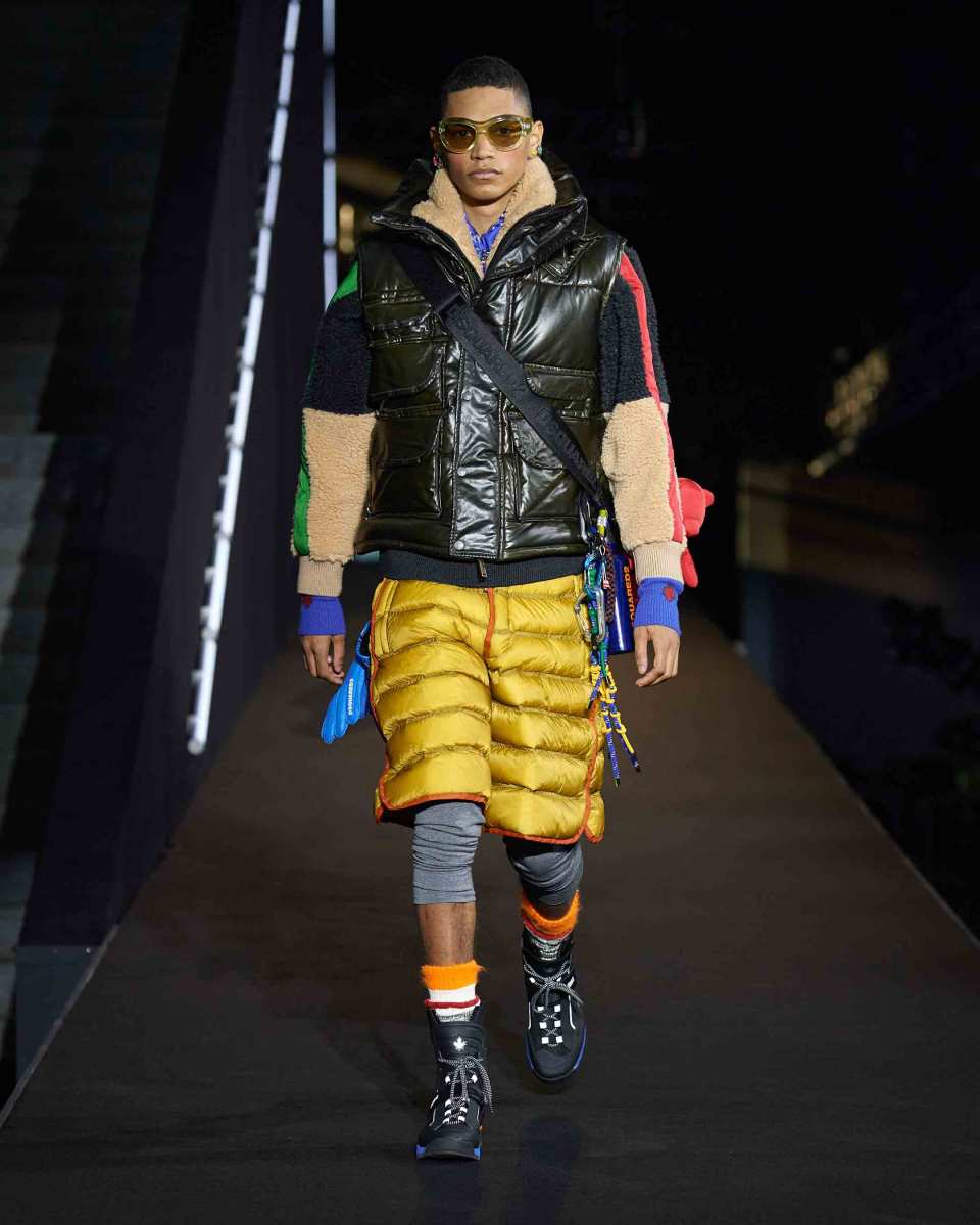 Dalle giacche spuntano colorate cinture di sicurezza e marsupi con il logo Dsquared2. Tutto è un richiamo all’escursionismo e più in generale agli sport di montagna, ma interpretati con il tocco grintoso, vivace e caratteristico dei gemelli Caten.