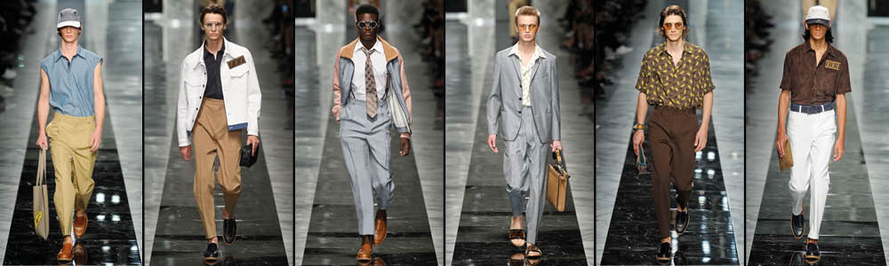 I pantaloni, morbidi e per lo più over, diventano particolarmente soggetti alla vena creativa di Fendi: linee verticali sul davanti, disegni di fiori e foglie, tinti con le più svariate tipologie di colore. Le giacche, lunghe o corte, testimoniano i vari stili a cui il brand si rifà e gli uomini a cui si rivolge: giacca classica a due bottoni, per restare legati alla tradizione; trench di pelle per il i più fashionisti; pelliccia colorata per non abbandonare quel tocco un po’ “fun” del marchio; giubbino sportivo che rievoca un po’ lo street style tanto di moda negli ultimi anni.