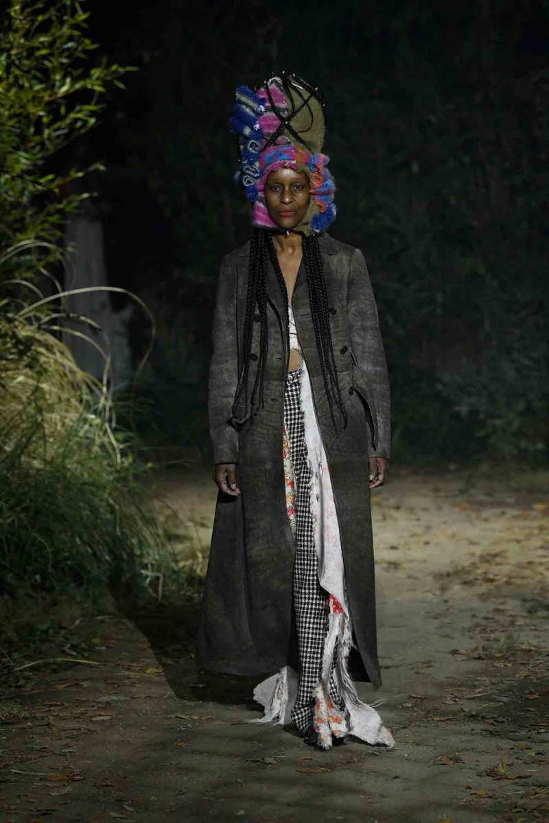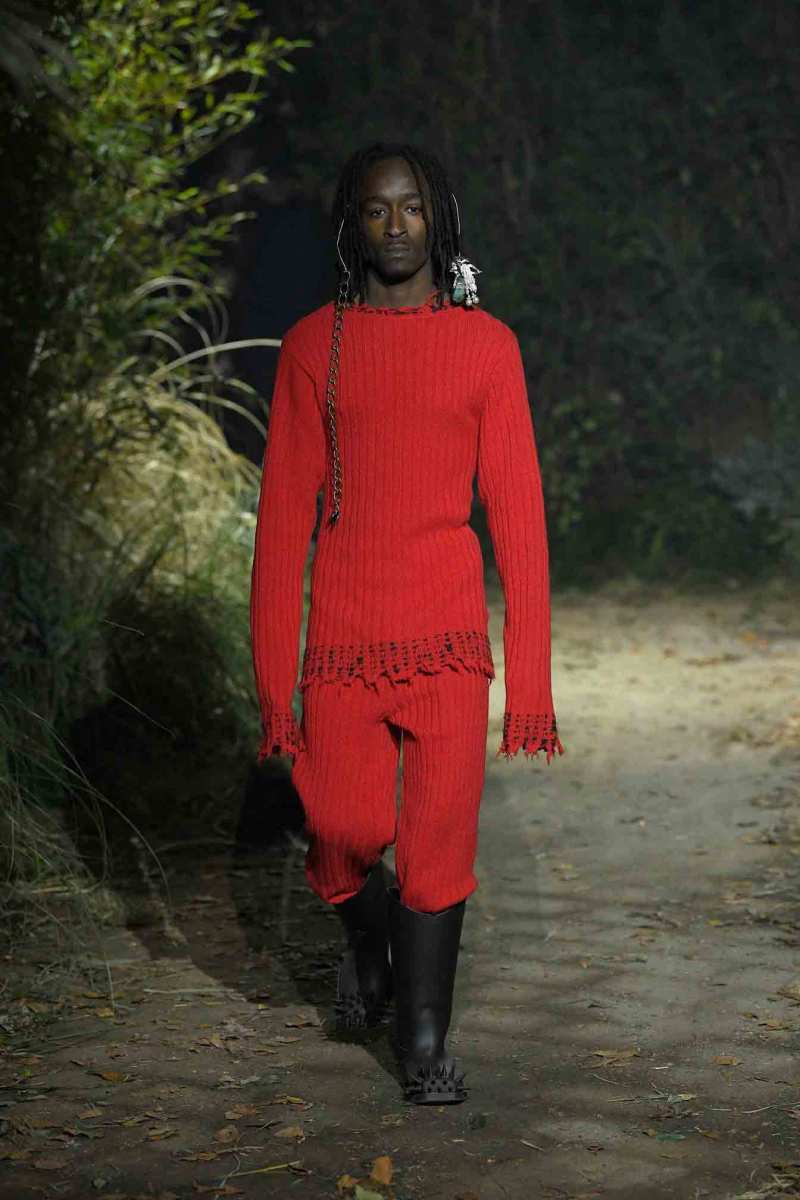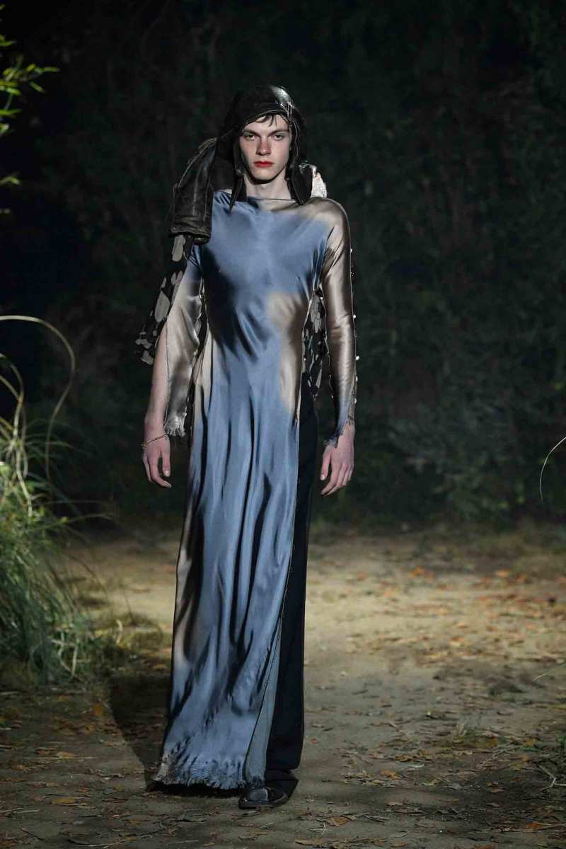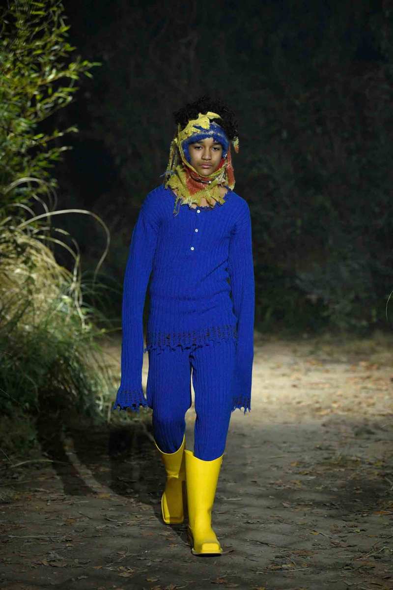 Tutto assume un nuovo significato in questo mondo immaginato da Francesco Risso; un giubbotto in pelle può trasformarsi in turbante, i maglioni indossati all’ingiù e anche la nudità vengono visti sotto un altro punto di vista. E poi ancora, sottovesti di raso cipria strappata a strisce e abiti sartoriali deliberatamente rammendati con fili luccicanti e passamontagna in maglia fai da te.