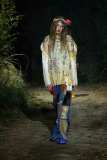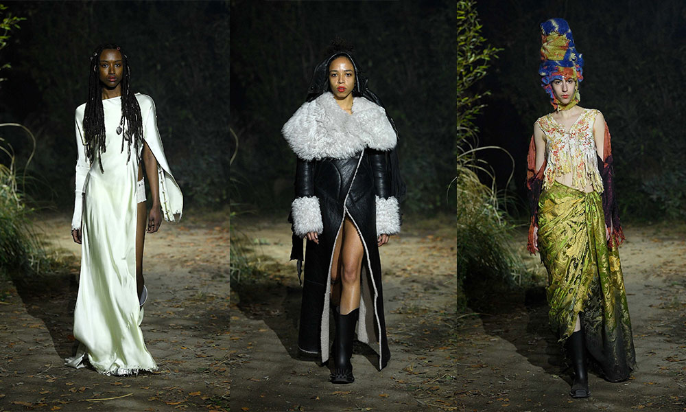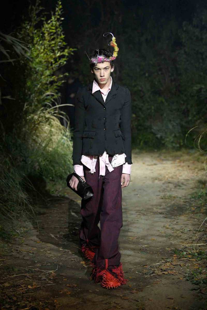 La collezione parla di questa infinita mescolanza di vecchio e nuovo, personale e condiviso. È fatta di oggetti ispirati alla tradizione, oggetti rammendati, messi tutti insieme. Overcoat e lunghissime maniche in lana che toccano terra si alternano ad abiti leggerissimi e multistrato, copricapo dalle forme tribali a vestiti che ricordano quelli delle fiabe. Ai piedi boots e scarpe hanno spuntoni chiodati ton sur ton.