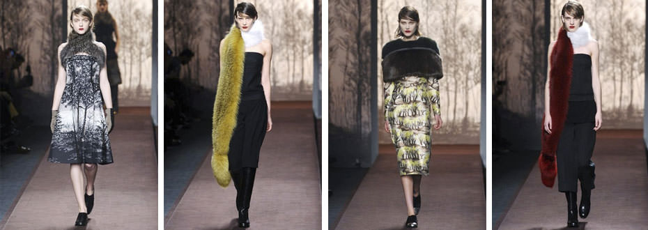 I cappotti diventano abiti, arricchiti da cappe di pelliccia in contrasto e stretti in vita da cinture, mentre le gonne si aprono in maxi frange. Protagoniste assolute le stole di pelo bicolor, che vengono trasformate in sciarpe, avvolte intorno al collo e fatte cadere sui vestiti.
