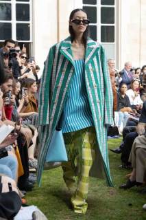 Lo stile inconfondibile Marni, fatto di fantasie, righe e pois, è visibile negli outfit delle celebrità presenti alla sfilata. Maglioni a collo alto, smanicati, abiti a canotta abbinati a calzini a righe, soprabiti lunghi, gonne