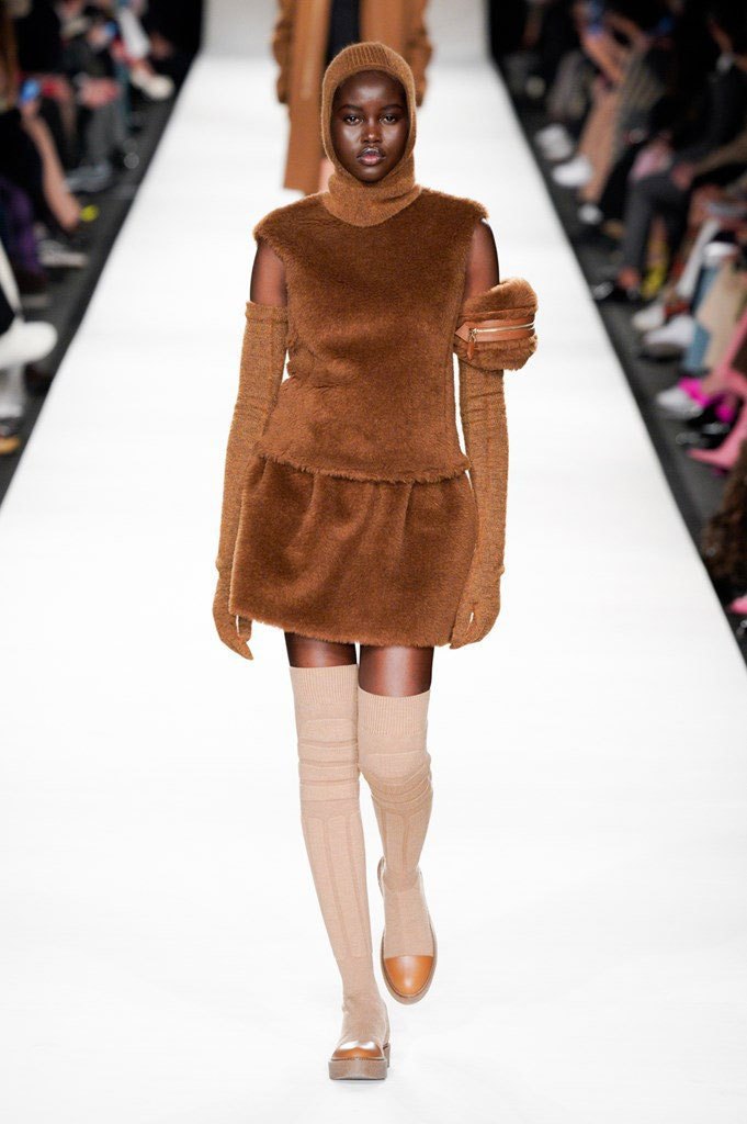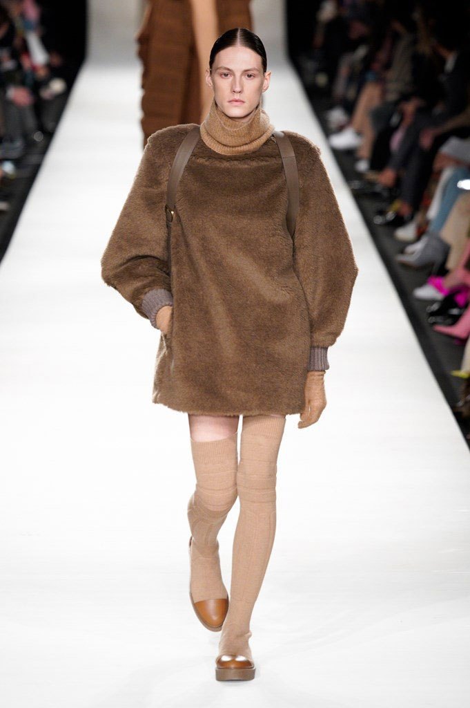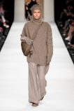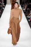 La vita stretta e le gambe lunghissime sono i punti chiave di ogni look, che in questo Autunno/Inverno preferisce alla sensualità la praticità elegante dei maglioni a collo alto e del classico Teddy Coat peloso. Max Mara, proponendo look coperti dalla testa ai piedi, si prepara a combattere l’inverno rigido concedendo solo qua e là la gamba scoperta da un pantaloncino a vita alta in camoscio o una minigonna in lana, abbinati da parigine da scolaretta.