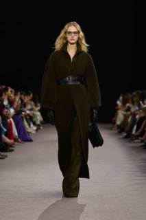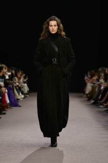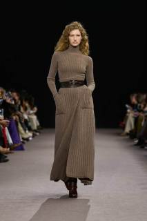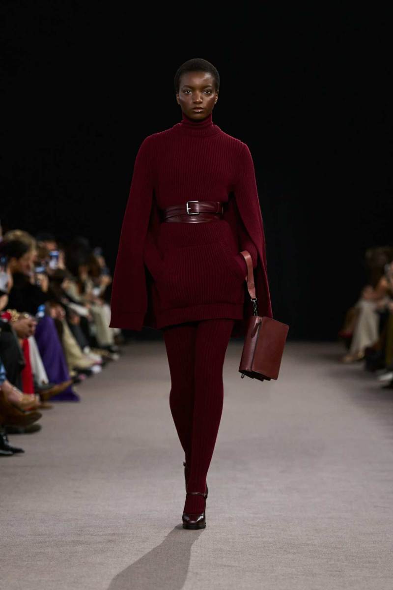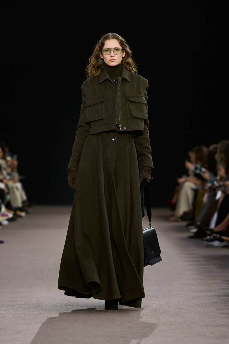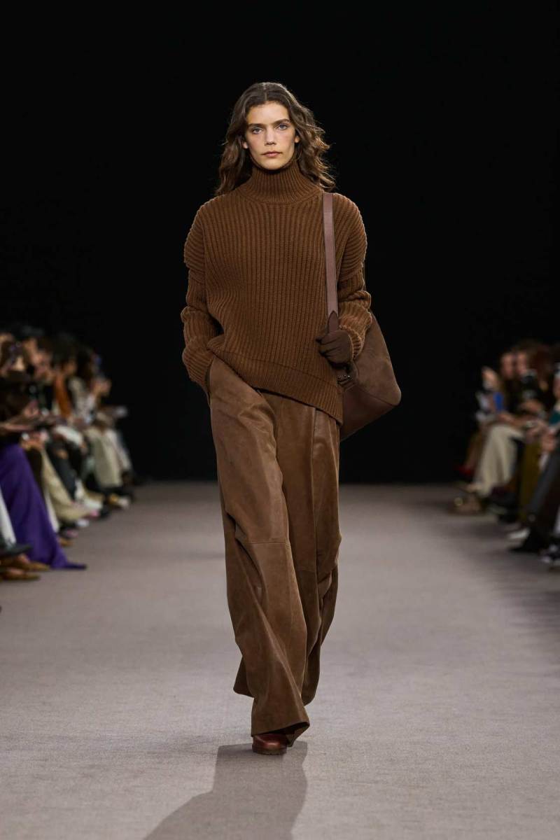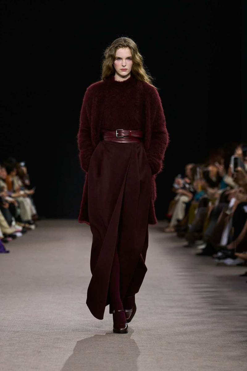 Il defilè inizia con un vinaccia che ricorda l’imbrunire invernale, e i protagonisti sono tessuti spessi indossati su vari livelli, accompagnati da collant e scarpe in continuità di colore, così come le cinture in vita che compiono due giri, abiti in velluto e in maglia a coste che ruba le tasche al mondo dello sportswear. Tra i look dai toni del tortora spicca un gilet nell’iconico tessuto teddy indossato su una lunga giacca interamente trapuntata. Fanno capolino le borse da giorno, a tracolla e multitasche, in cuoio dall’effetto invecchiato. L’antracite accompagna il tweed abbinato alla lana intrecciata in versione sale e pepe. Seguono colori più caldi come il ruggine e il cammello messi in risalto anche dalle chiome mosse e naturali delle modelle scelte per gli appositi look. Verde militare scuro e nero chiudono la sfilata con outfit completati da guanti in pelle lunghi oltre il gomito.