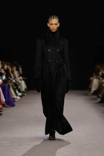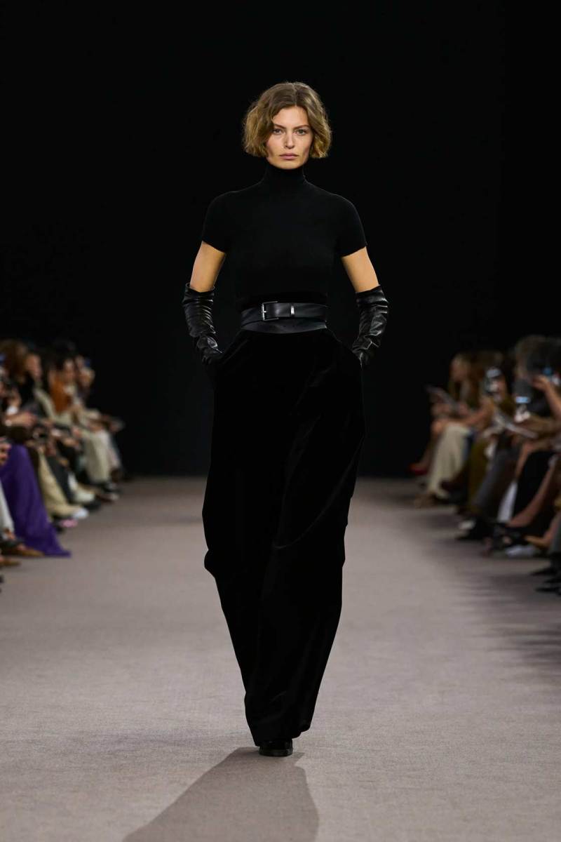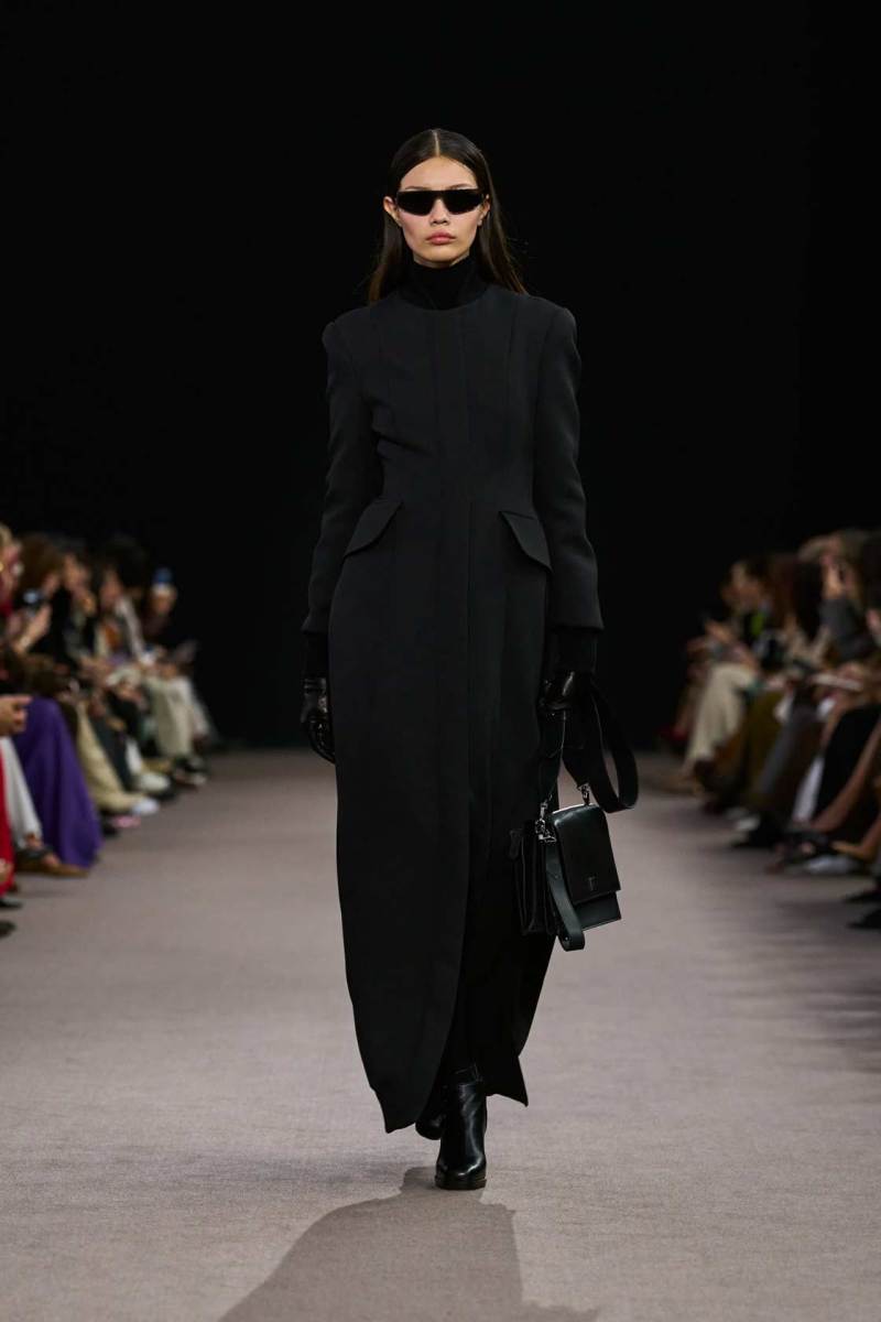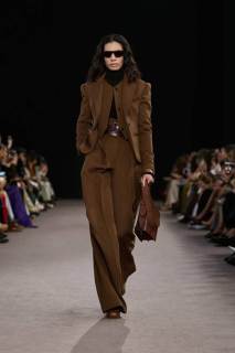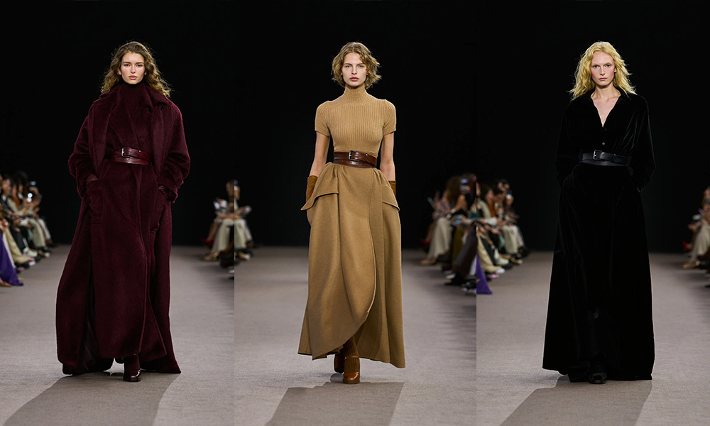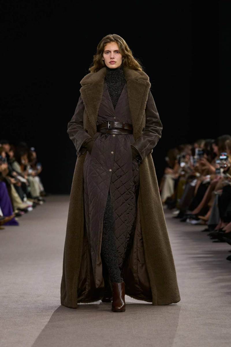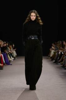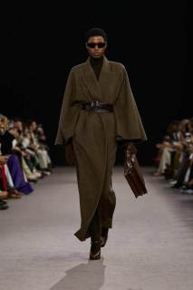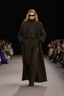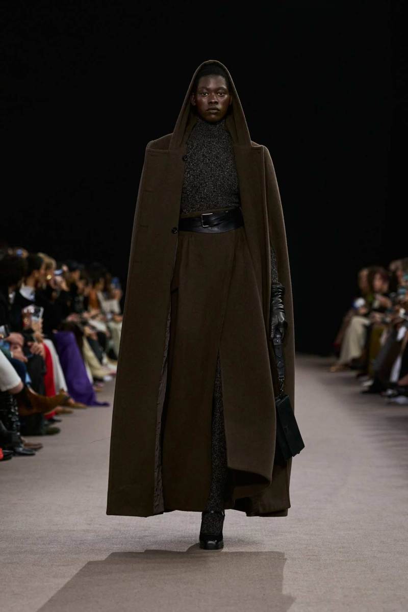 Il defilè inizia con un vinaccia che ricorda l’imbrunire invernale, e i protagonisti sono tessuti spessi indossati su vari livelli, accompagnati da collant e scarpe in continuità di colore, così come le cinture in vita che compiono due giri, abiti in velluto e in maglia a coste che ruba le tasche al mondo dello sportswear. Tra i look dai toni del tortora spicca un gilet nell’iconico tessuto teddy indossato su una lunga giacca interamente trapuntata. Fanno capolino le borse da giorno, a tracolla e multitasche, in cuoio dall’effetto invecchiato. L’antracite accompagna il tweed abbinato alla lana intrecciata in versione sale e pepe. Seguono colori più caldi come il ruggine e il cammello messi in risalto anche dalle chiome mosse e naturali delle modelle scelte per gli appositi look. Verde militare scuro e nero chiudono la sfilata con outfit completati da guanti in pelle lunghi oltre il gomito.