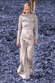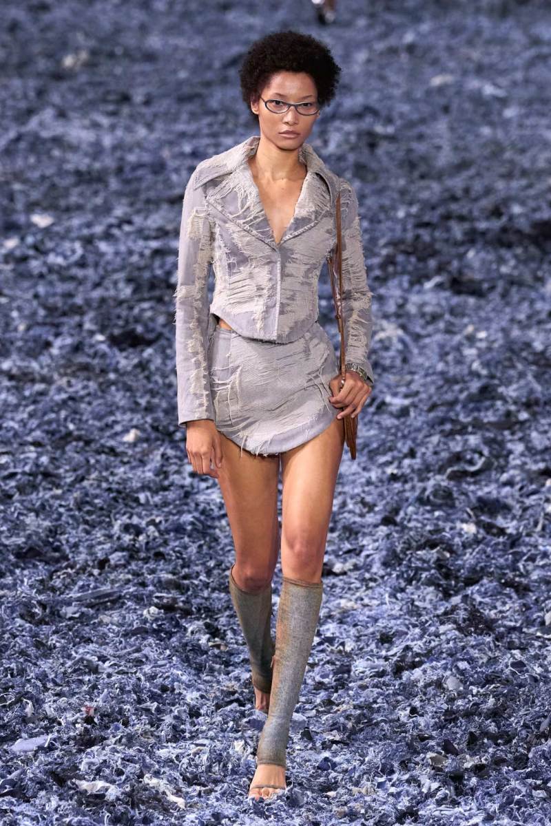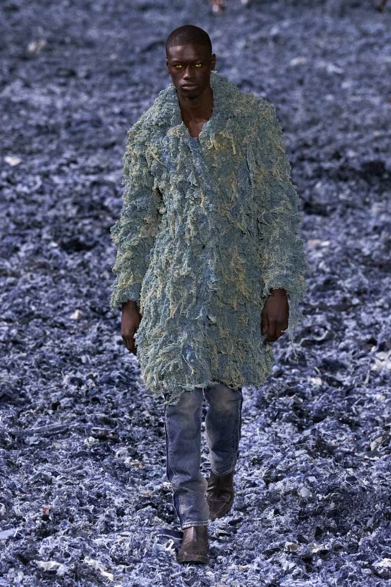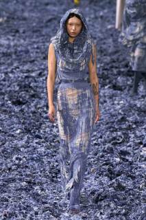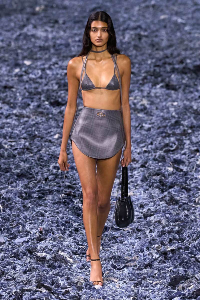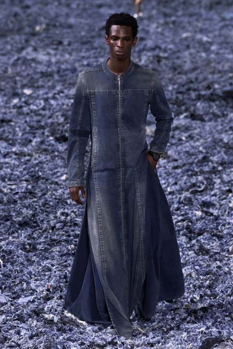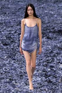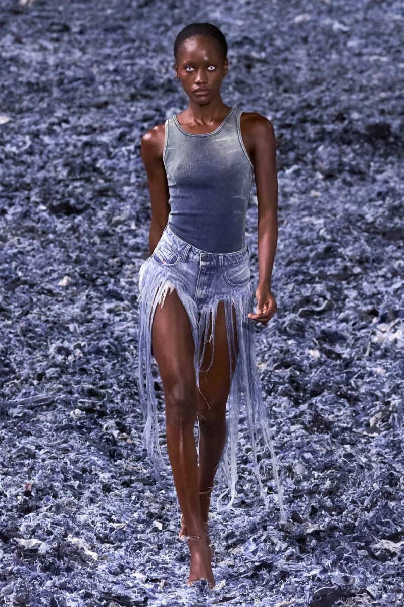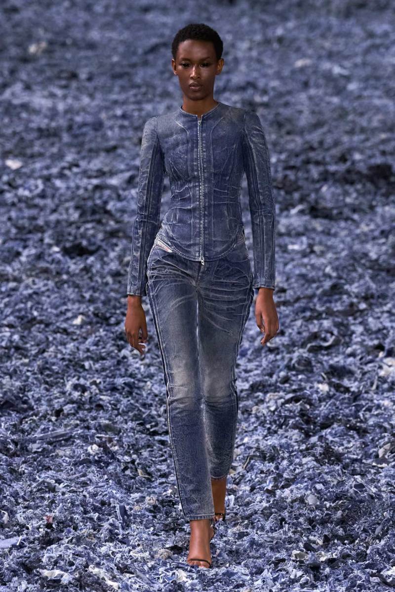 Diesel, fondata nel 1978 da Renzo Rosso, riparte con la sua idea di moda lanciando una collezione incentrata sul denim. Il primo look, rigorosamente di jeans, si compone di un top a spallina larga abbinato ad una gonna con frange lunghe fino ai piedi. Quello che lascia tutti a bocca aperta, però, è la passerella (o per meglio dire, la sala intera) cosparsa da tanti piccoli fili di quello che sembra, proprio, essere denim. Il blu, come un mare, sovrasta l’intera scena restituendoci una visione di insieme che fa venire i brividi per quanto lavoro dev’essere stato impiegato per ottenere una tale realizzazione complessiva.