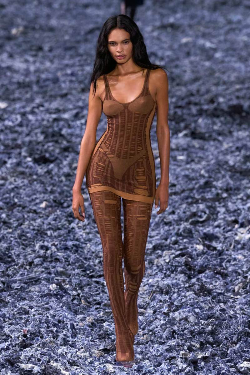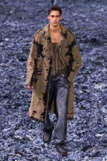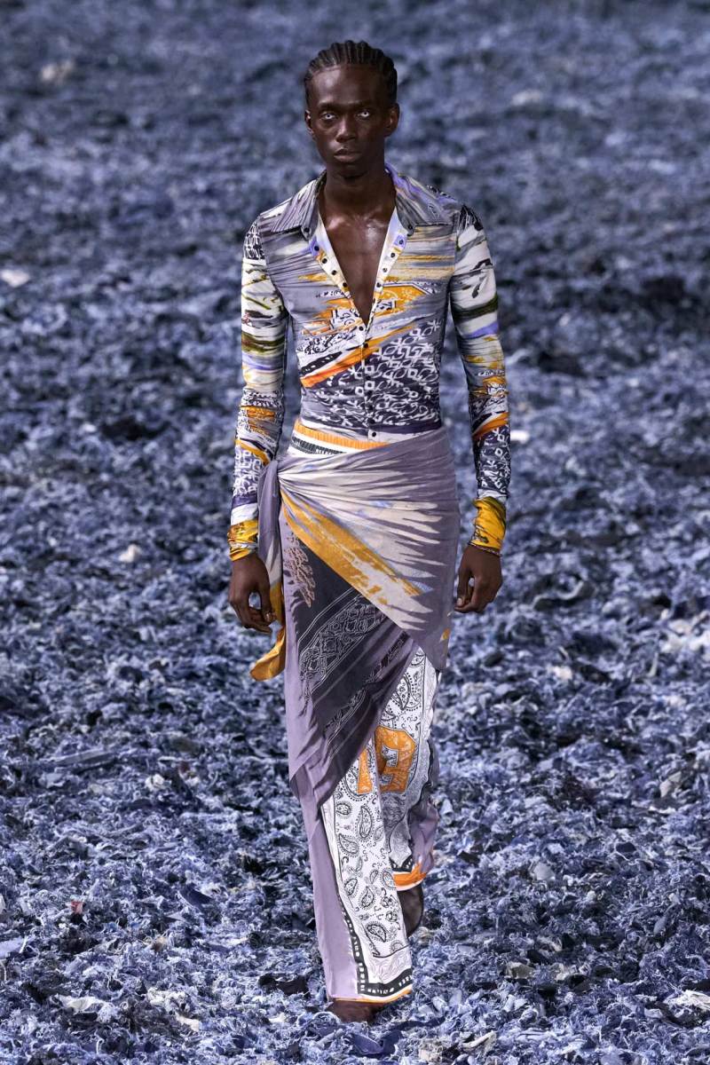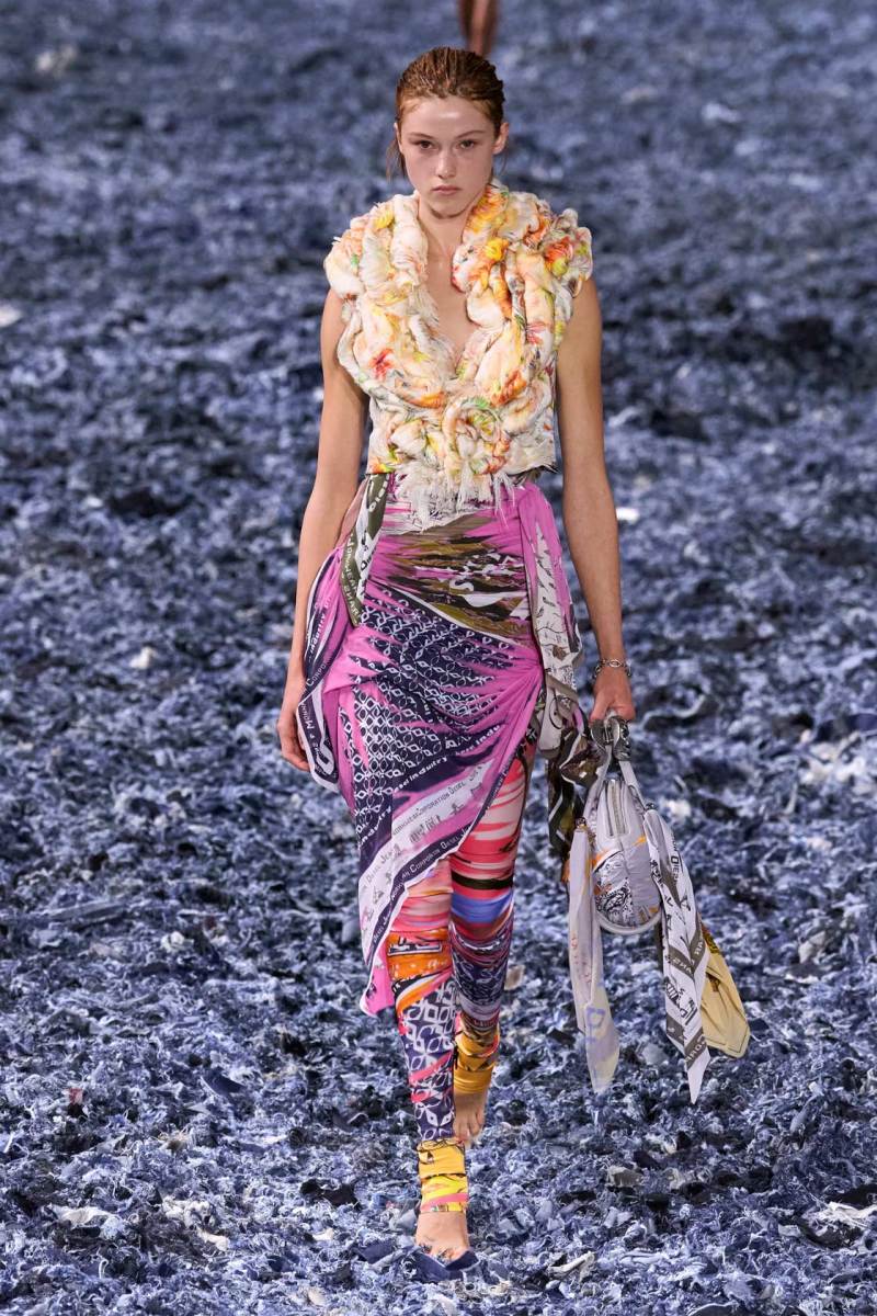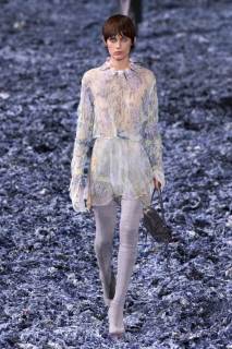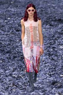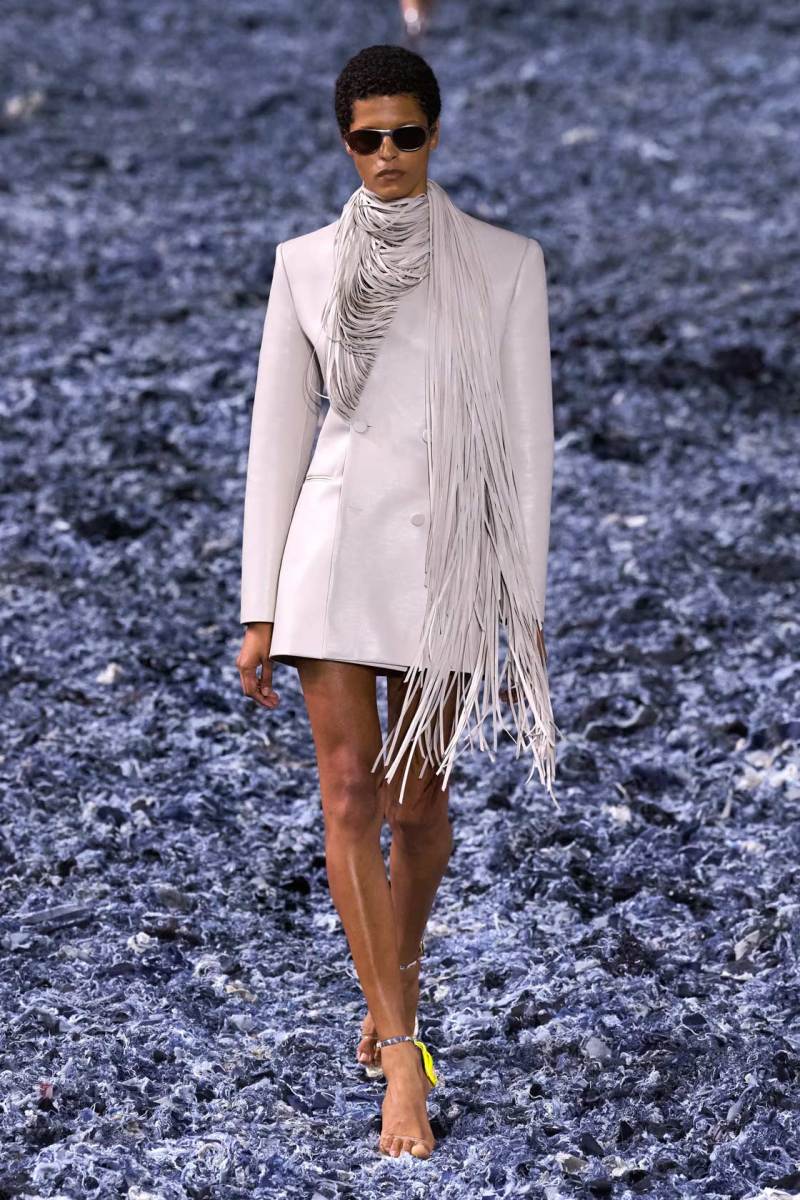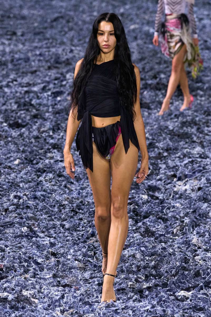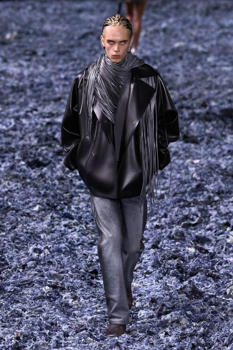 Diesel, fondata nel 1978 da Renzo Rosso, riparte con la sua idea di moda lanciando una collezione incentrata sul denim. Il primo look, rigorosamente di jeans, si compone di un top a spallina larga abbinato ad una gonna con frange lunghe fino ai piedi. Quello che lascia tutti a bocca aperta, però, è la passerella (o per meglio dire, la sala intera) cosparsa da tanti piccoli fili di quello che sembra, proprio, essere denim. Il blu, come un mare, sovrasta l’intera scena restituendoci una visione di insieme che fa venire i brividi per quanto lavoro dev’essere stato impiegato per ottenere una tale realizzazione complessiva.