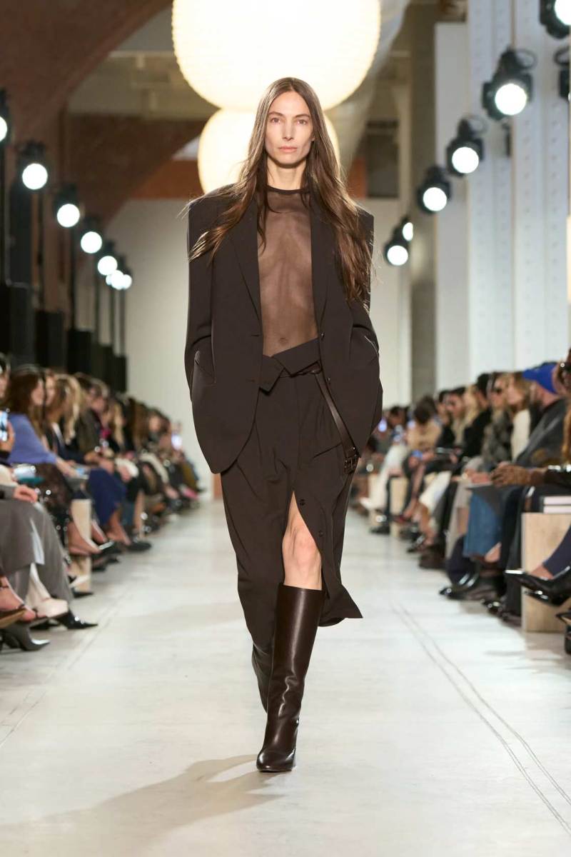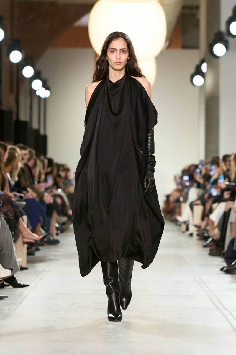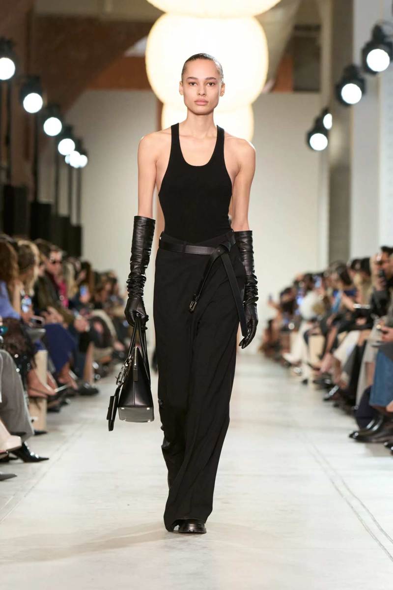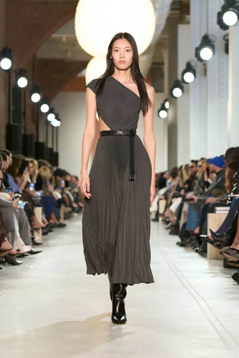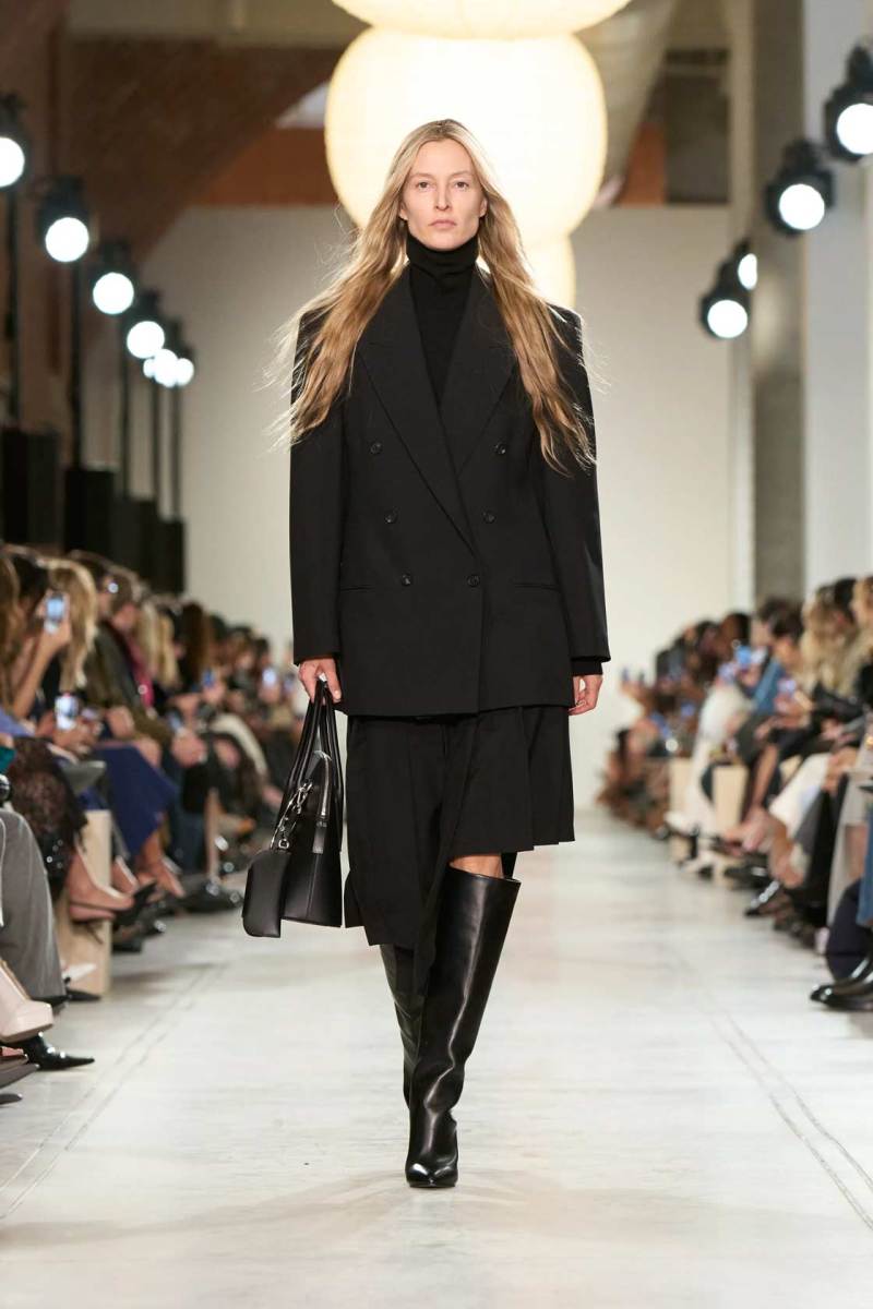 Uno degli aspetti più interessanti della collezione è il layering: abiti leggeri in seta, cashmere con stampa paillettes e capispalla strutturati che possono essere indossati tutto l’anno. Michael Kors immagina un look che si adatta al clima imprevedibile, dove un trench leggero può essere sfoggiato con sandali in estate e stratificato con lana e stivali in inverno.