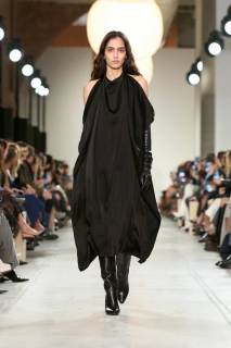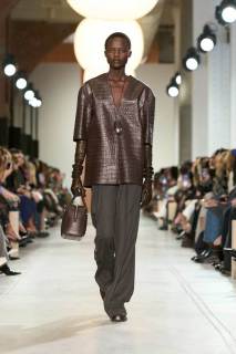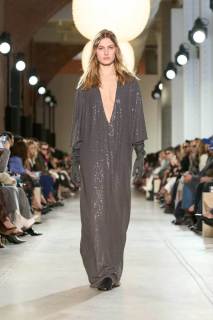 Anche l’eveningwear segue questa filosofia: abiti in jersey di seta impreziositi da paillettes, che accarezzano la pelle e rivelano senza costringere. Nessun corsetto, nessun bustier, ma una sensualità sussurrata che celebra il movimento e la libertà. Per la sera, niente tacchi vertiginosi, ma pantofole piatte che combinano eleganza e comfort.