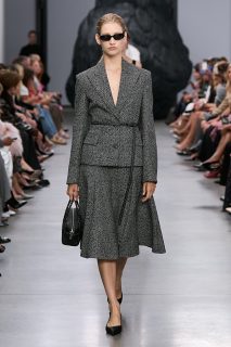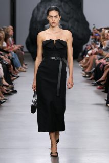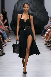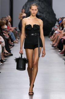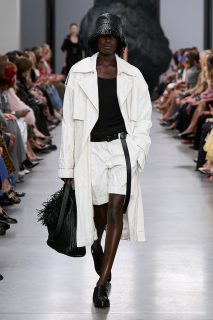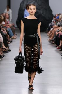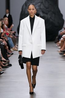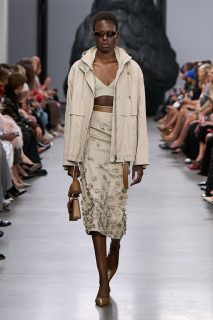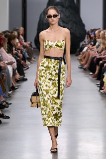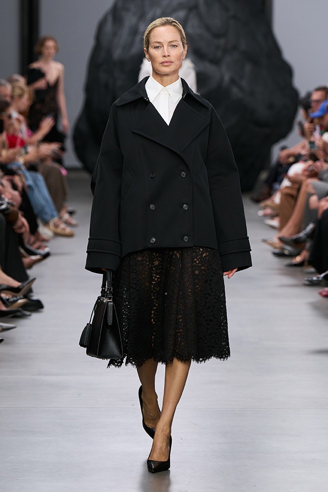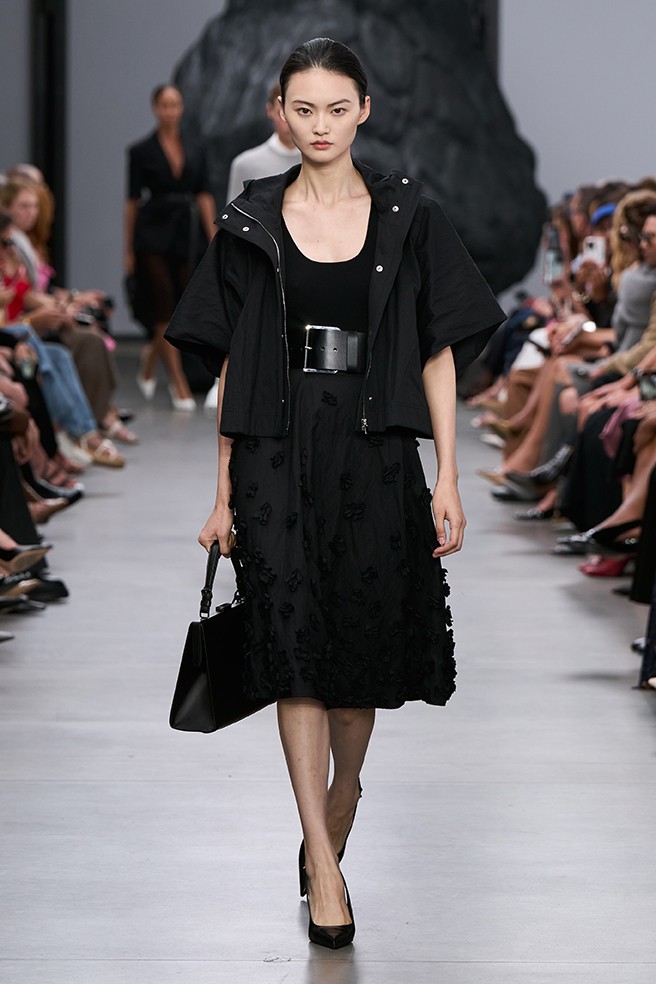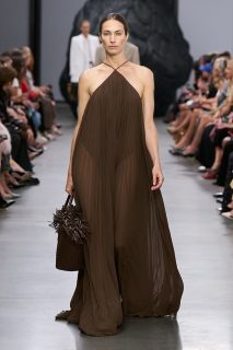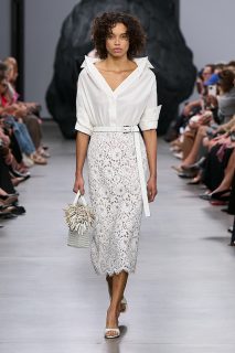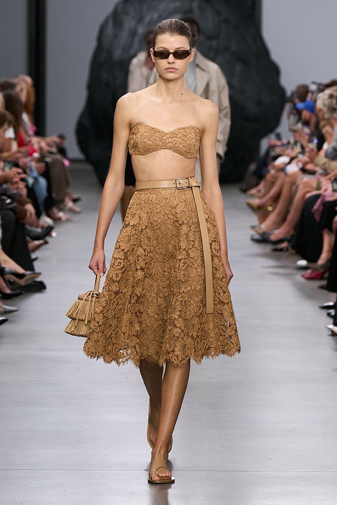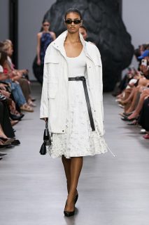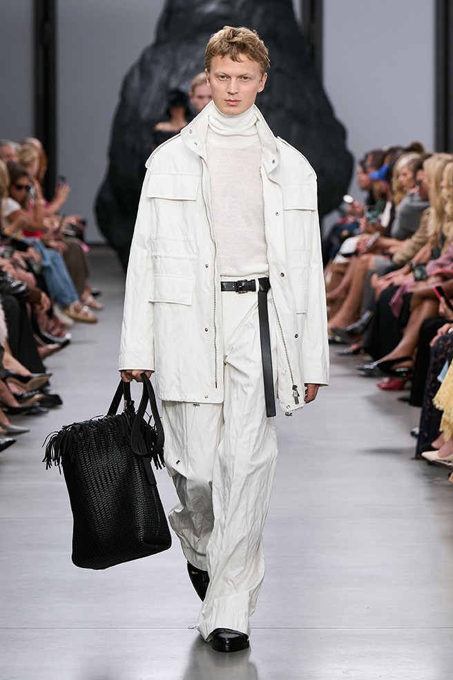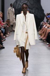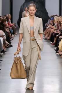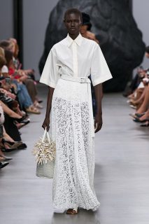 In passerella, il contrasto tra il bianco e nero strutturato e una palette di toni naturali – dal cioccolato all’écru, fino al blu intenso e al verde brillante – ha dato vita a una collezione che riflette l’anima del Mediterraneo. I dettagli artigianali hanno fatto da protagonisti anche negli accessori: borse intrecciate a mano, nappe e tacchi scultorei hanno completato i look, esprimendo un’estetica sofisticata e senza tempo.