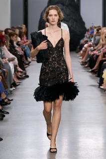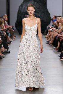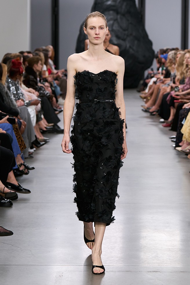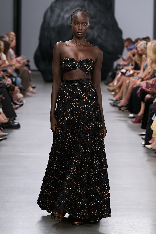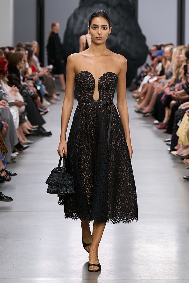 Ispirata al glamour degli anni ’50 e all’essenzialità degli anni ’90, la collezione ha reso omaggio al savoir-faire italiano attraverso texture ricercate e dettagli curati. Ricami in rafia, tessuti floreali, pizzi e satin hanno dato vita a un lusso vissuto, fatto di capi senza tempo. Le silhouette morbide e sinuose, con tubini, gonne leggere e pantaloni fluidi, hanno evocato un’eleganza raffinata, esaltata da scollature audaci e linee pulite.