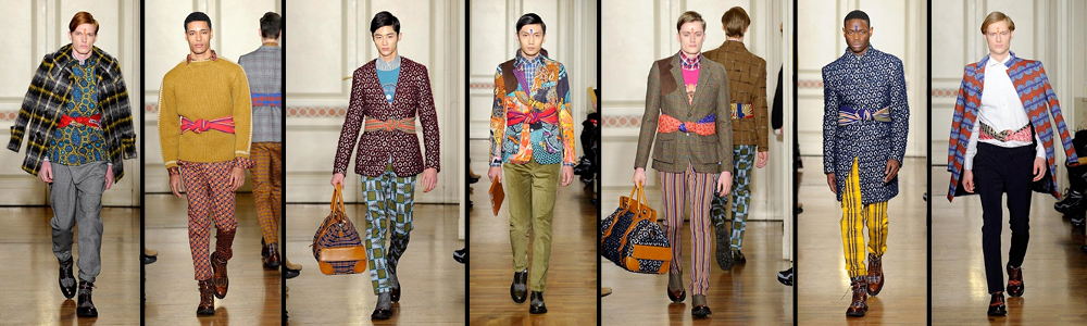 Gli abiti sono caratterizzati dai tagli della grande sartoria italiana da uomo con stampe di affreschi buddisti che fanno acquistare freschezza al capo. Si passa dalle giacche da camera a quelle da caccia nei tradizionali tweed accostati a capi realizzati a mano in Burkina Faso seguendo il programma di moda etica “Ethical Fashion Initiative”.