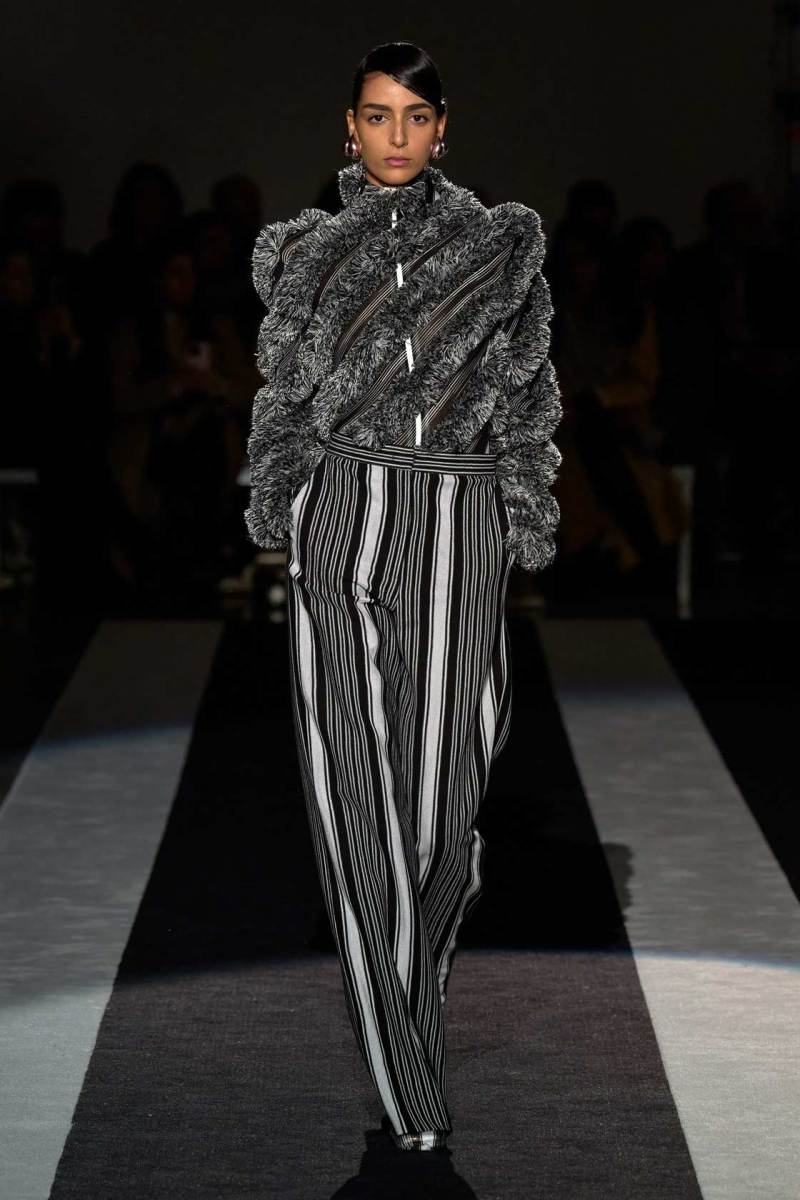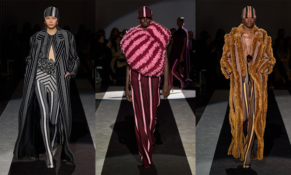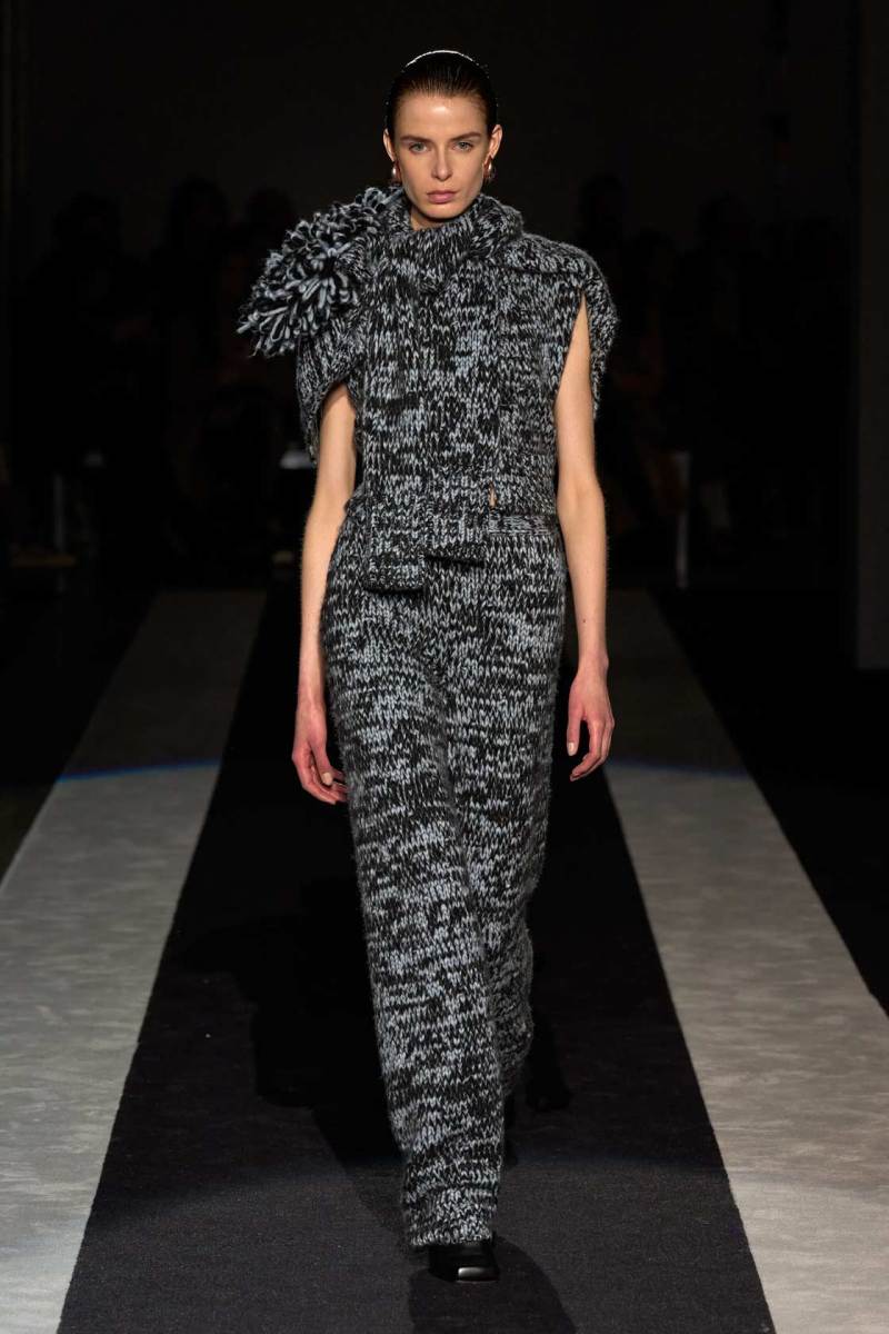 Dettagli distintivi, come gli inserti in eco-pelliccia colorata o le tazzine di caffè trasformate in pendenti per le collane, aggiungono un tocco giocoso e inaspettato alla collezione. Questi particolari, oltre ad arricchire visivamente gli abiti, suggeriscono un senso di leggerezza e spensieratezza che si contrappone alla struttura decisa delle righe, degli spacchi e delle silhouette.