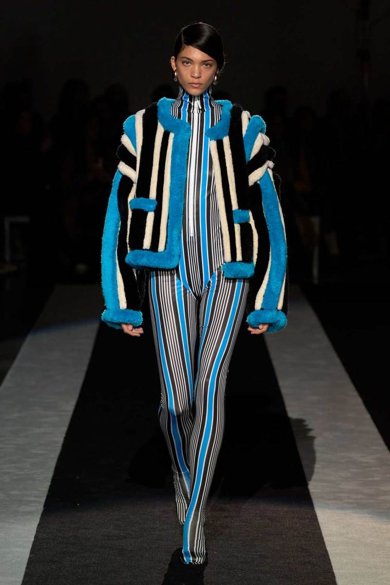 “The ones of the stripes”, “quelli delle righe”, l’epiteto che veniva accostato a Ottavio e Rosita Missoni, viene ripetuto come un mantra durante tutto il corso della sfilata. Gonne a portafoglio, abiti con spacchi, tute, giacche, collant, hot pants e stivali si permeano di strisce, declinate in una varietà di colori, che viaggiano in direzioni diverse e conferiscono un aspetto ipnotico ai capi, che sembrano danzare allegramente sui corpi.