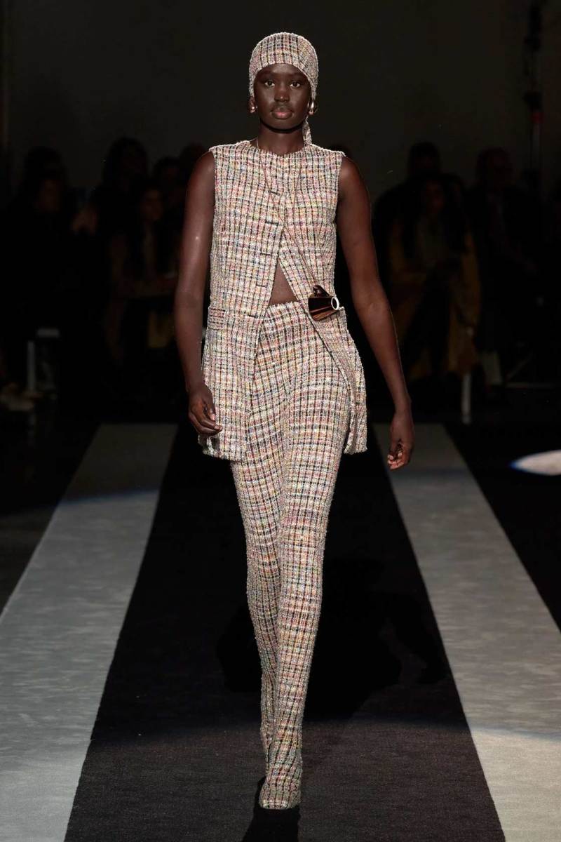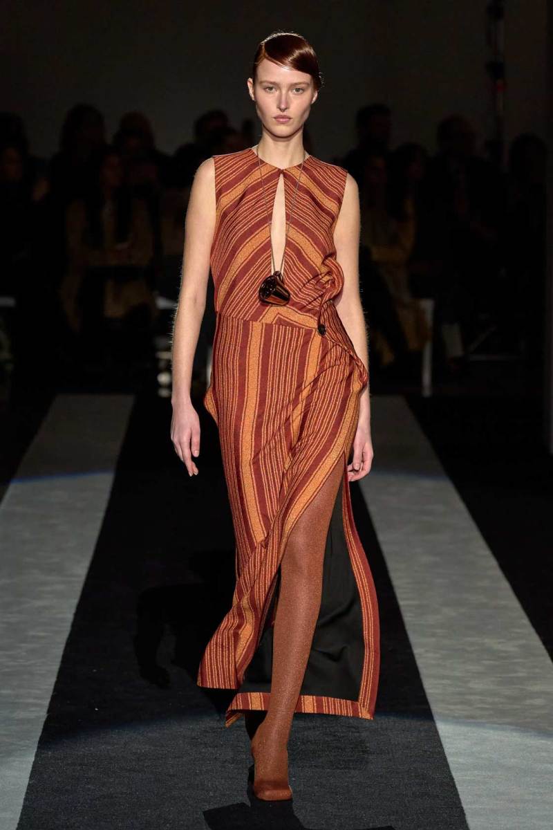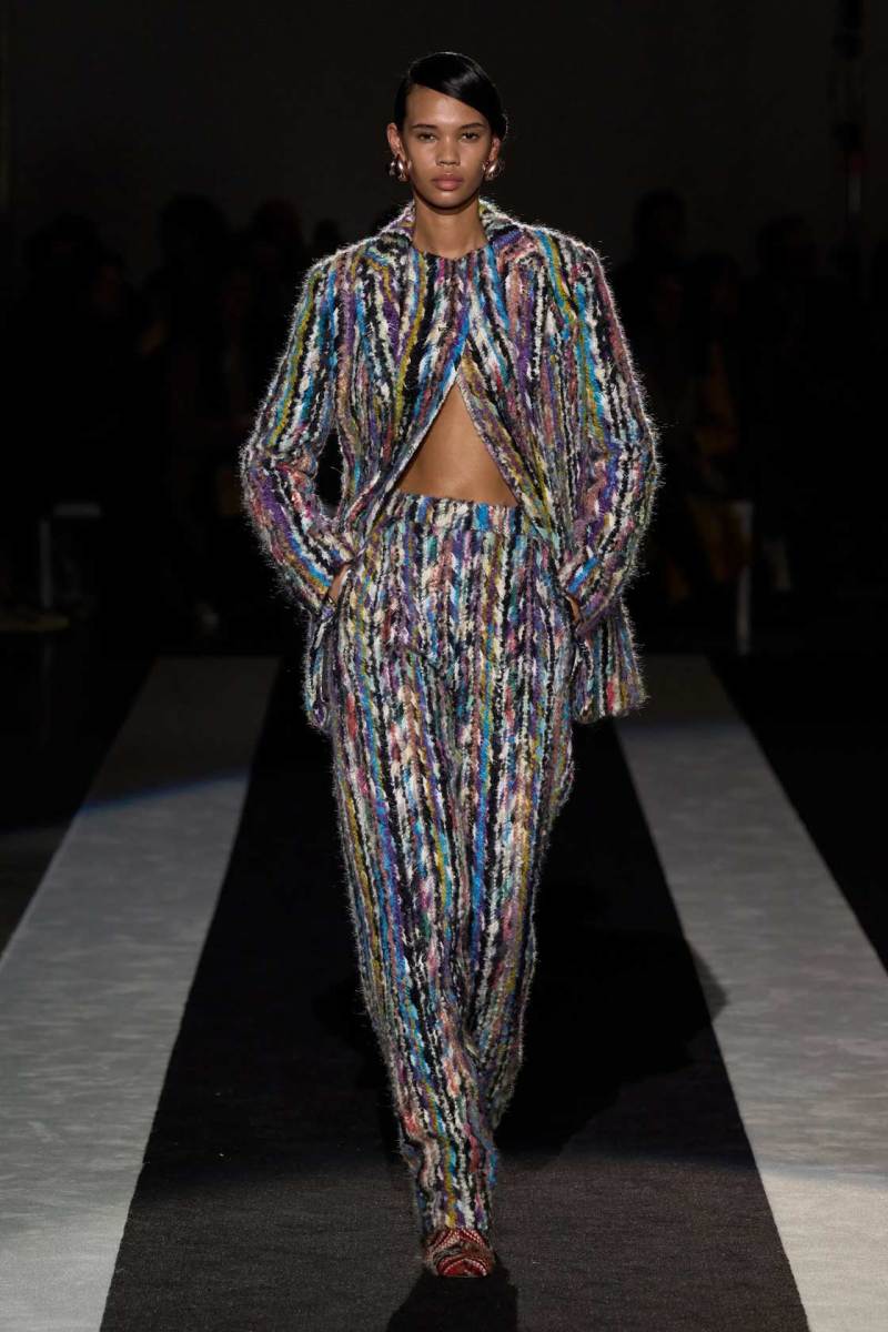 Le righe, inoltre, enfatizzano anche la silhouette, definita “verticale, empowered e affermativa”, che conferisce un senso di potere e sicurezza ai look. Il gioco di volumi e drappeggi, invece, aggiunge profondità e dinamicità ai capi. Le tute e gli abiti aderenti, accostati a gonne lunghe e capispalla voluminosi, creano un equilibrio tra forme maschili e femminili che riflette l’approccio inclusivo e senza confini di Missoni alla moda.